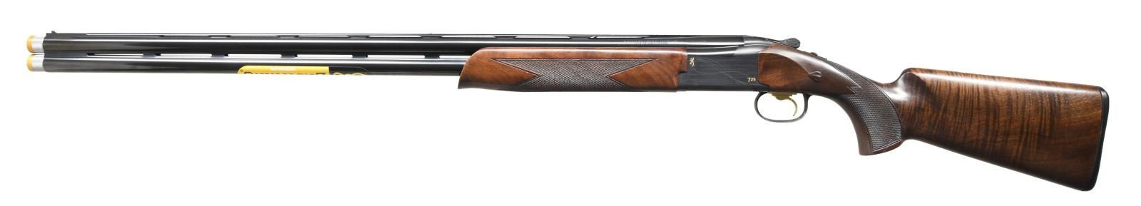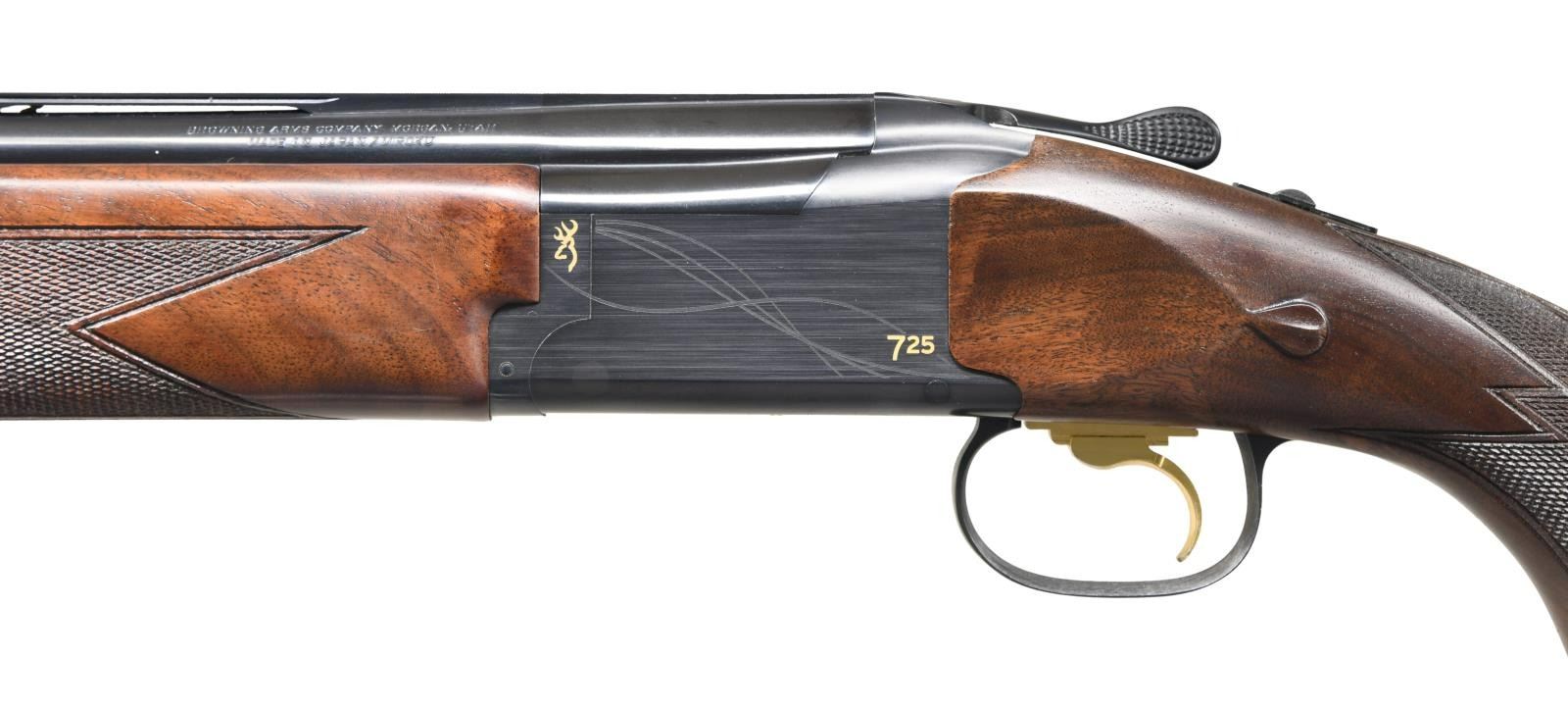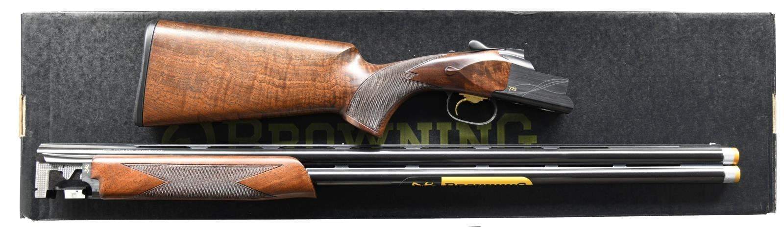 Cal. 12 Ga., 2 3/4" & 3". S# BRJP14084YM131. Mfg. by Miroku w/ 32" VR bbls. Invector DS choke tubes: full set of 5 included. Ivory front & mid beads. Low luster blued receiver w/ gold accented engraving. Gold plated adjustable SST. Ejectors. Gloss oil finished highly figured black walnut stock set w/ 20 LPI checkering. LOP: 14 3/4" to Inflex Technology recoil pad. UNATTACHED ACCESSORIES: matching numbered box containing Browning case containing chokes, Choke T-Wrench, 2 triggers & wrench, along w/ paperwork & gun lock. CONDITION: near excellent wood & metal finish still having Browning decal. Bright shiny bores. PROVENANCE: The Collection of Gun Sport Ltd. owned by Jon R. Thomas. (23-3613/MD). MODERN. $3,000-3,900.