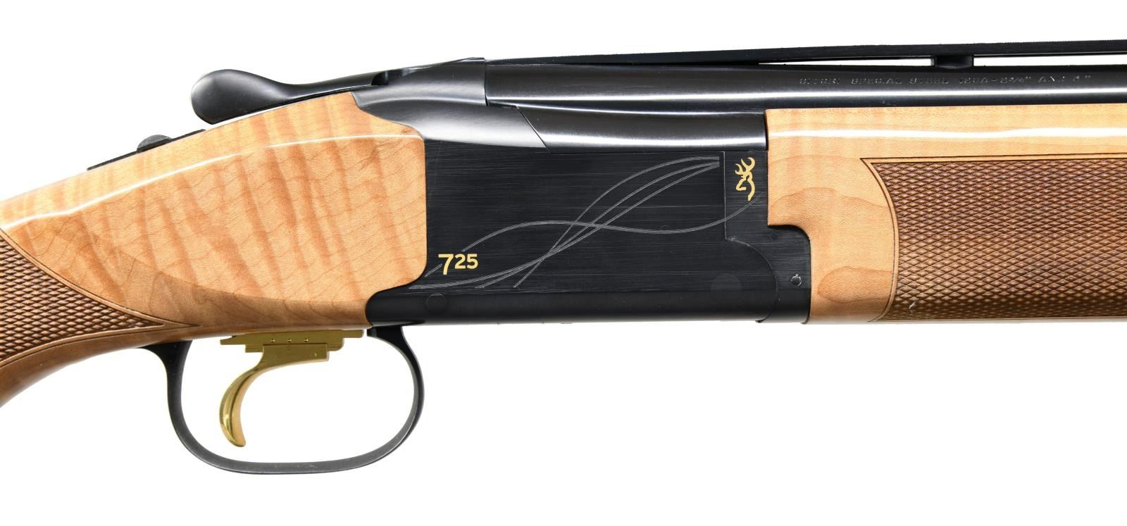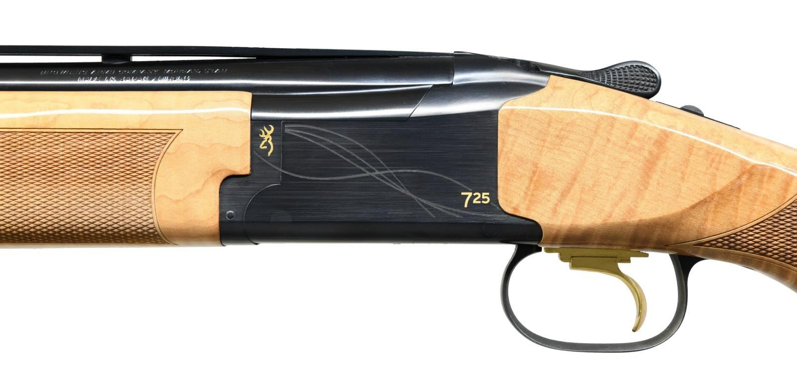 WITH BOX. Cal. 12 Ga., 3". S# JP19904YY131. Bbls 30" VR with HI VIZ front sight, white mid bead and Invector full & mod extended screw in chokes. Sides of blued action have gold Browning logo. Bottom of action marked "725 SPORTING". Checkered maple schnabel forearm and flat knob stock with Inflex recoil pad. UNATTACHED ACCESSORIES: matching black Browning cardboard box with foam inserts, chokes, lock and paperwork. CONDITION: all aspects appear excellent; appears new. PROVENANCE: The Collection of Gun Sport Ltd. owned by Jon R. Thomas. (23-3255/BH). MODERN. $1,200-1,800.