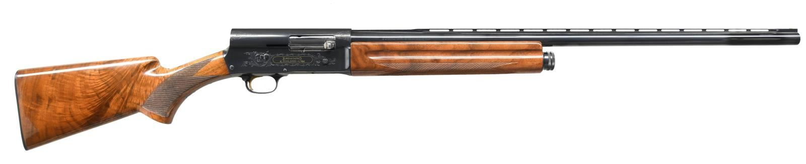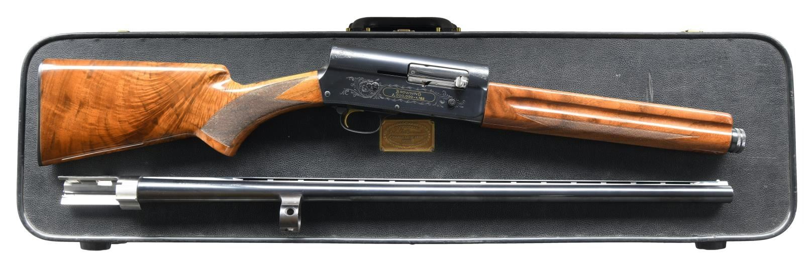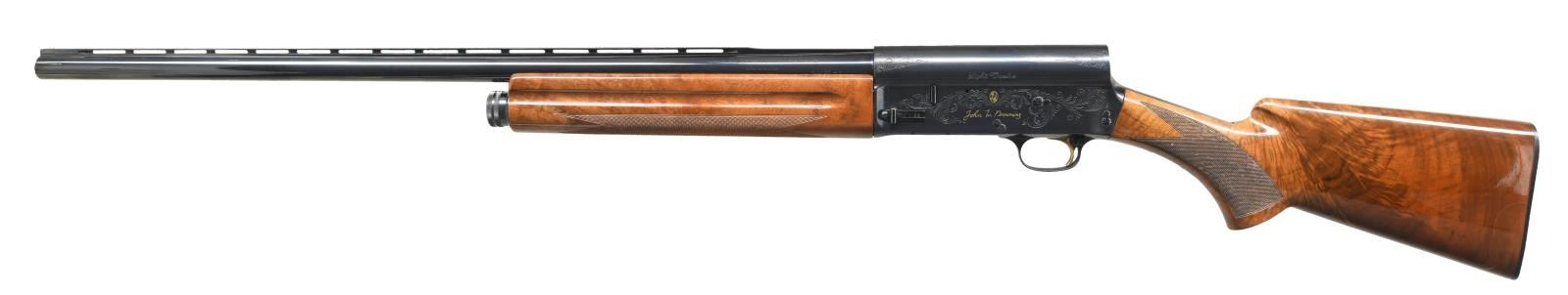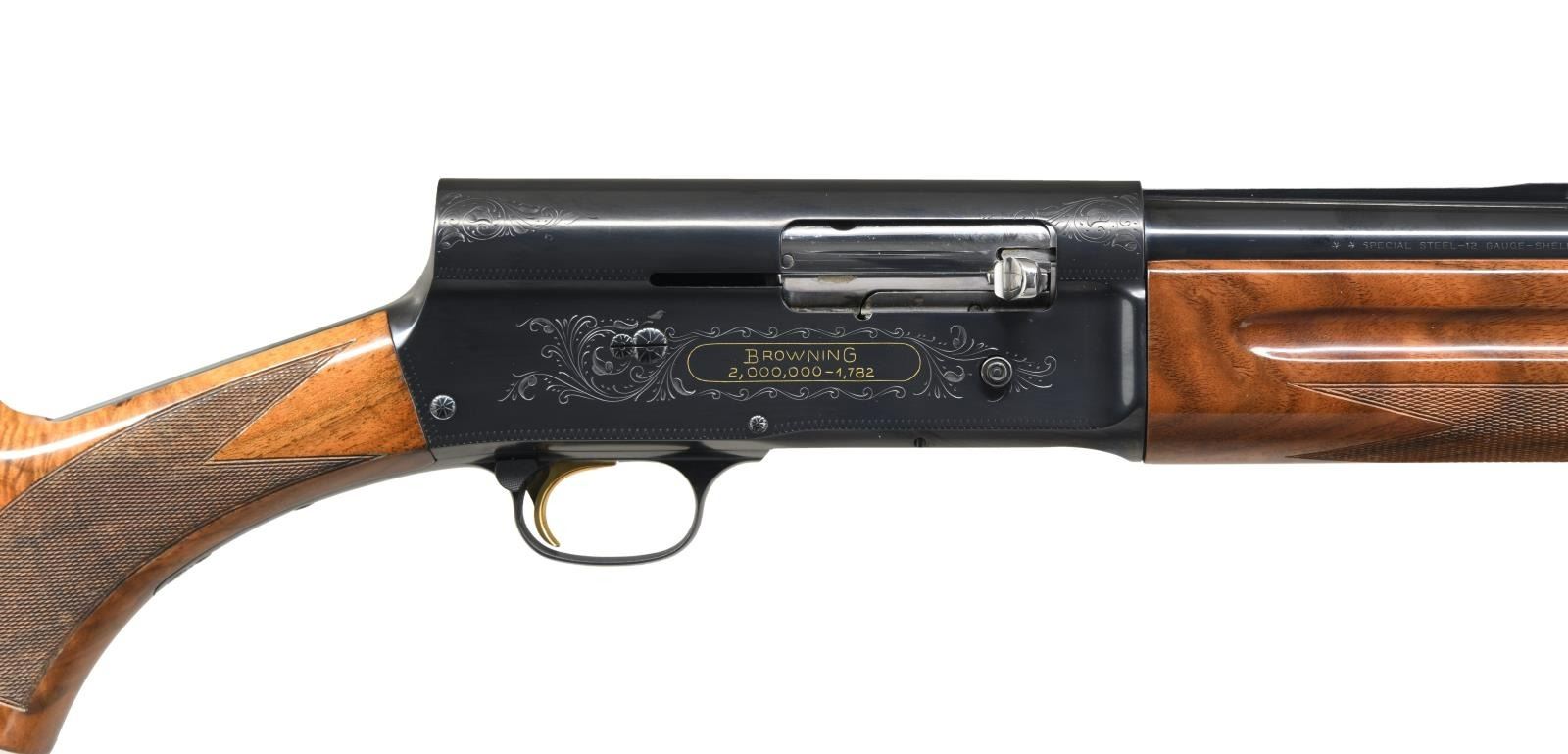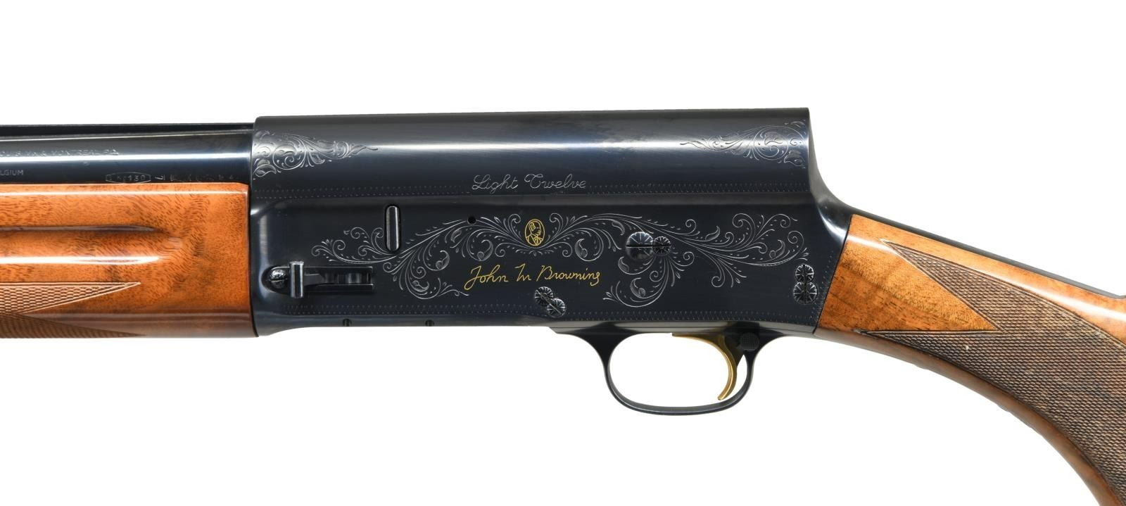 COMMEMORATIVE SEMI-AUTOMATIC SHOTGUN. Cal. 12 Ga., 2 3/4". S# 2,000,000-1,782. Bbl. 27 5/8". 1 of only 2,500 commemorative Model A5 "Light Twelve" shotguns manufactured in Belgium by FN and imported/retailed by Browning Arms Company. The left side of the barrel is marked with Browning's importer information above "MADE IN BELGIUM", with the right side exhibiting the caliber designation. The left side of the receiver exhibits light scroll and wavy line factory engraving and is marked "Light Twelve" above a gold side portrait of John Browning and his signature. Right side of receiver exhibits matching pattern engraving with "BROWNING/ 2,000,000-11782" in gold within a gold oval. Metal components exhibit a lustrous high polish blue finish, with the trigger being gold plated. Fancy checkered wood pistol grip buttstock and checkered wood forend with grasping grooves. Matte vented rib barrel with ivory bead front sight. UNATTACHED ACCESSORIES: black leatherette case with a brass plaque reading "2,000,000TH/ John M Browning/ COMMEMORATIVE/ MODEL/ BROWNING AUTOMATIC SHOTGUN" and containing a small commemorative book detailing John Browning's career. CONDITION: extremely fine, with metal components retaining bountiful amounts of their original factory blue finish, showing few discernible signs of extensive handling overall. Brilliant mirror bore. Wood furniture is excellent, with the stock showing a few small marks on the underside of the butt and grip. Case shows some marks from handling and storage, but otherwise remains sturdy and serviceable. An extremely fine example, that one would find difficult to upgrade from. PROVENANCE: The Collection of Gun Sport Ltd. owned by Jon R. Thomas. (23-3628/MLW). CURIO. $1,750-2,500.