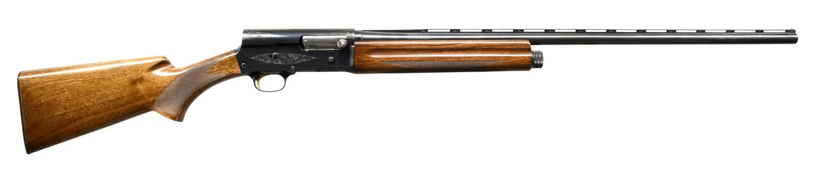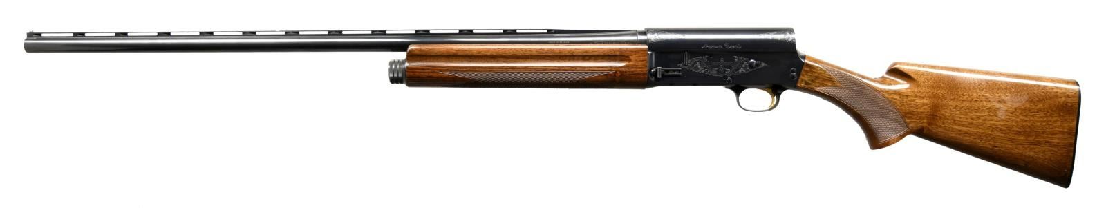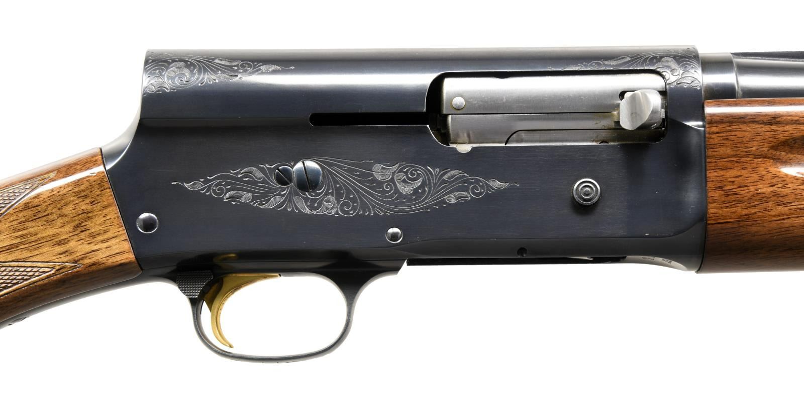 SHOTGUN. Cal. 20 Ga, 3". S# 76X55123. Bbl. 27 1/2". A5 "Magnum Twenty" manufactured in Belgium by FN and imported by Browning Arms Company in 1976. The left side of the barrel is stamped with Browning's importer information above "MADE IN BELGIUM", with the right side exhibiting the model and caliber designations. The receiver features light foliate engraved on the side, with "Magnum Twenty" above "BROWNING" and a portrait of John Moses Browning on the left. Metal components exhibit a blued finish, with the trigger being gold plated. Checkered wood pistol grip butt stock with "AUTOMATIC", "FN", and "BROWNING" marked plastic buttplate, and checkered wood forend. Vent rib barrel with aluminum bead front sight. CONDITION: metal components retain bountiful amounts of their original factory blue finish, exhibiting some mild superficial marks from handling and storage. Mirror bore. Wood furniture shows some light superficial marks from handling and storage, but is otherwise very good overall. PROVENANCE: The Collection of Gun Sport Ltd. owned by Jon R. Thomas. (23-3570/MLW). MODERN. $1,400-1,900.