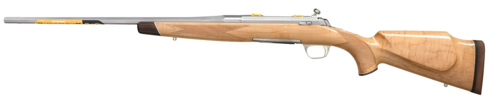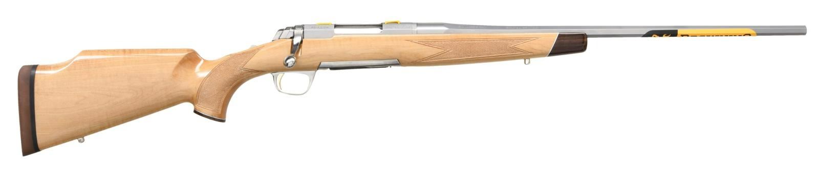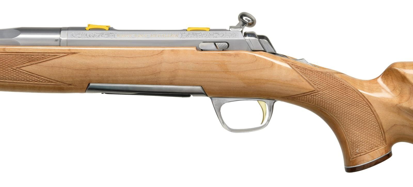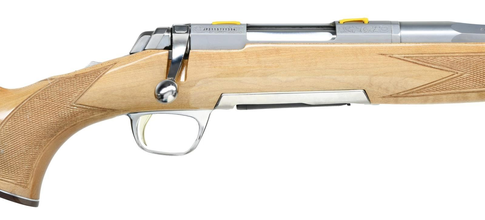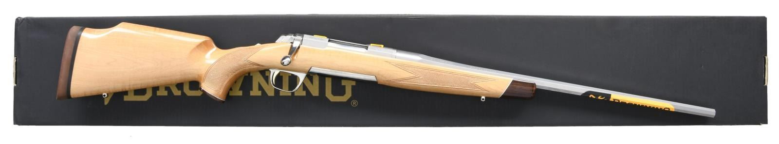 RIFLE WITH MATCHING FACTORY BOX. Cal. 243 Win. S# JP21157YY354. Bbl 22". X-Bolt White Bolt Medallion bolt action rifle manufactured by Miroku and imported by Browning Arms Company of Morgan, UT. The left side of the tapered octagonal barrel is stamped with Browning's importer information, with "STAINLESS STEEL" followed by the model and caliber designations on the right. Receiver features light scroll engraving, with the left side being marked "WHITE GOLD MEDALLION" in gold characters. Metal components exhibit a stainless steel finish, with the trigger being gold plated. 1 piece maple Monte Carlo pattern stock featuring checkering at the wrist and forearm, and being fitted with a Pachmayr Decelerator red rubber recoil pad. UNATTACHED ACCESSORIES: matching factory box containing its factory styrofoam insert and factory paperwork. CONDITION: near new, with metal components retaining virtually all of their original factory finish overall. Brilliant mirror bore, exhibiting sharp and well defined rifling throughout. Stock is excellent overall. Box shows some mild exterior wear from handling and storage, but otherwise remains sturdy and serviceable. PROVENANCE: The Collection of Gun Sport Ltd. owned by Jon R. Thomas. (23-3239/MLW). MODERN. $1,200-1,800.