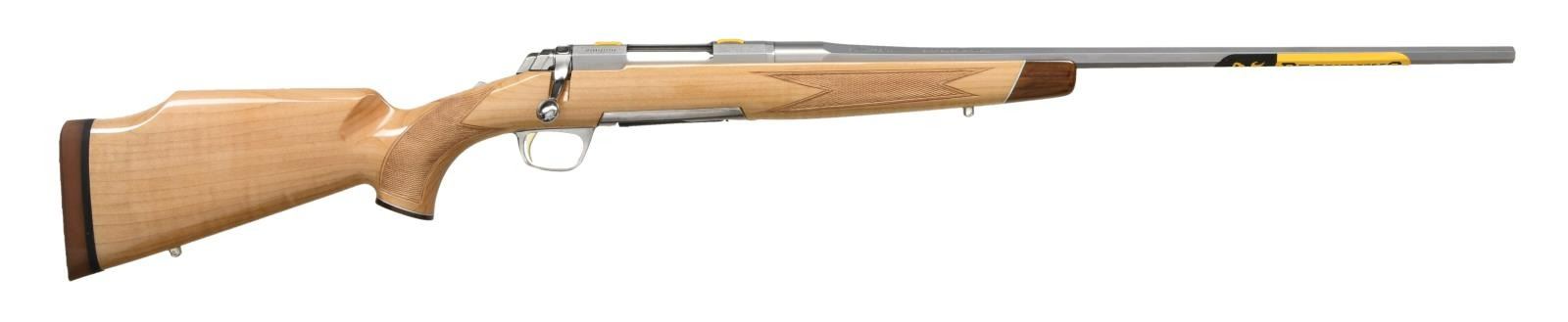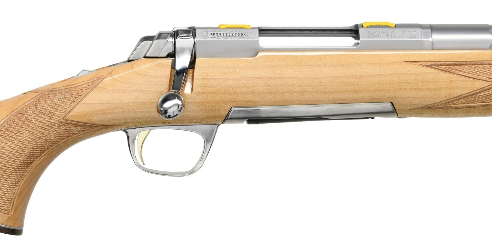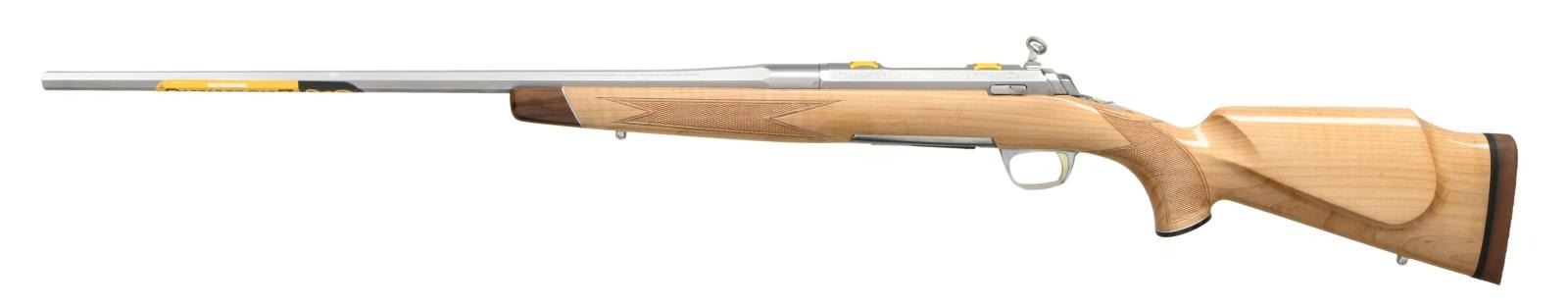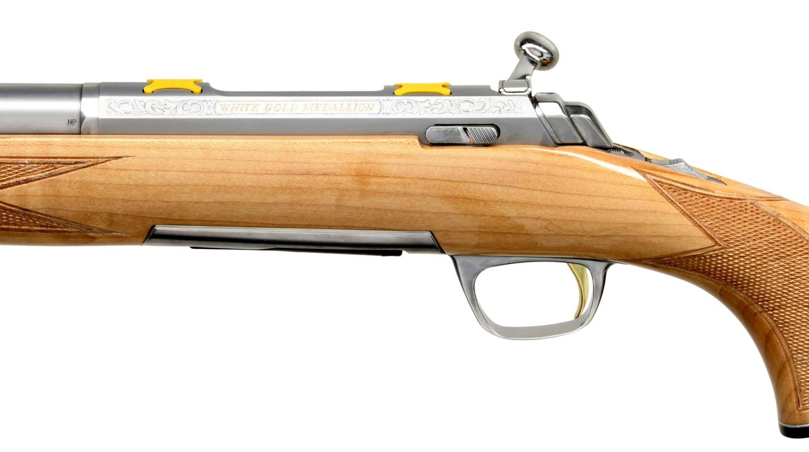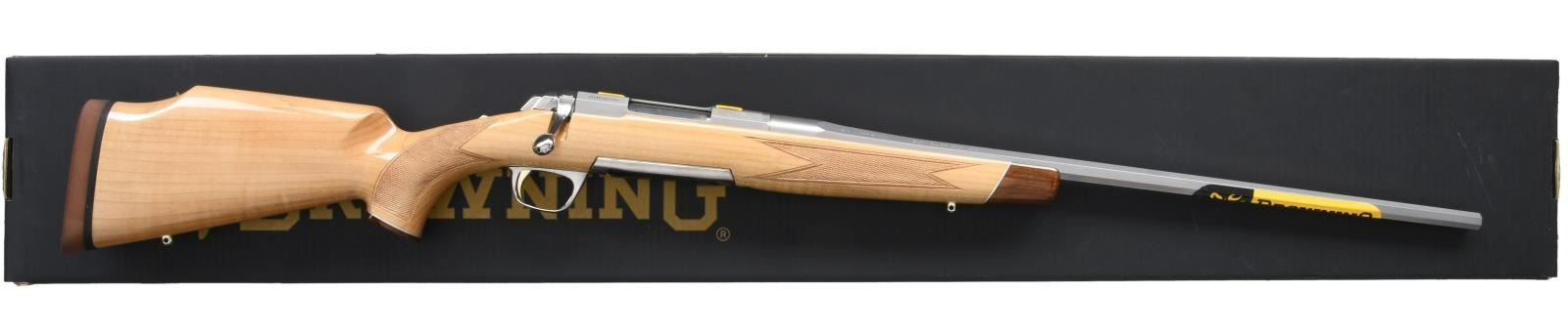 RIFLE WITH MATCHING FACTORY BOX. Cal. 6.8 Western. S# JP28820YY354. Bbl 24". X-Bolt White Gold Medallion bolt action rifle manufactured by Miroku and imported by Browning Arms Company. The octagonal barrel is stamped with Browning's importer information on the left, with "STAINLESS STEEL" followed by the model and caliber designations on the right. Receiver features light scroll engraved on either side, with "WHITE GOLD MEDALLION" in gold on the left. Metal components exhibit a stainless steel finish, with the trigger featuring a gold plated finish. Maple Monte Carlo pattern stock featuring checkering at the wrist and forearm and being mounted with a Pachmayr Decelerator red rubber recoil pad. UNATTACHED ACCESSORIES: matching factory box containing its styrofoam insert and factory paperwork. CONDITION: near new, with metal components retaining virtually all of their original factory finishes overall. Mirror bore, exhibiting well defined rifling throughout. Stock is excellent overall. Box shows some mild exterior wear, but otherwise remains sturdy and serviceable. PROVENANCE: The Collection of Gun Sport Ltd. owned by Jon R. Thomas. (23-3274/MLW). MODERN. $1,200-1,800.