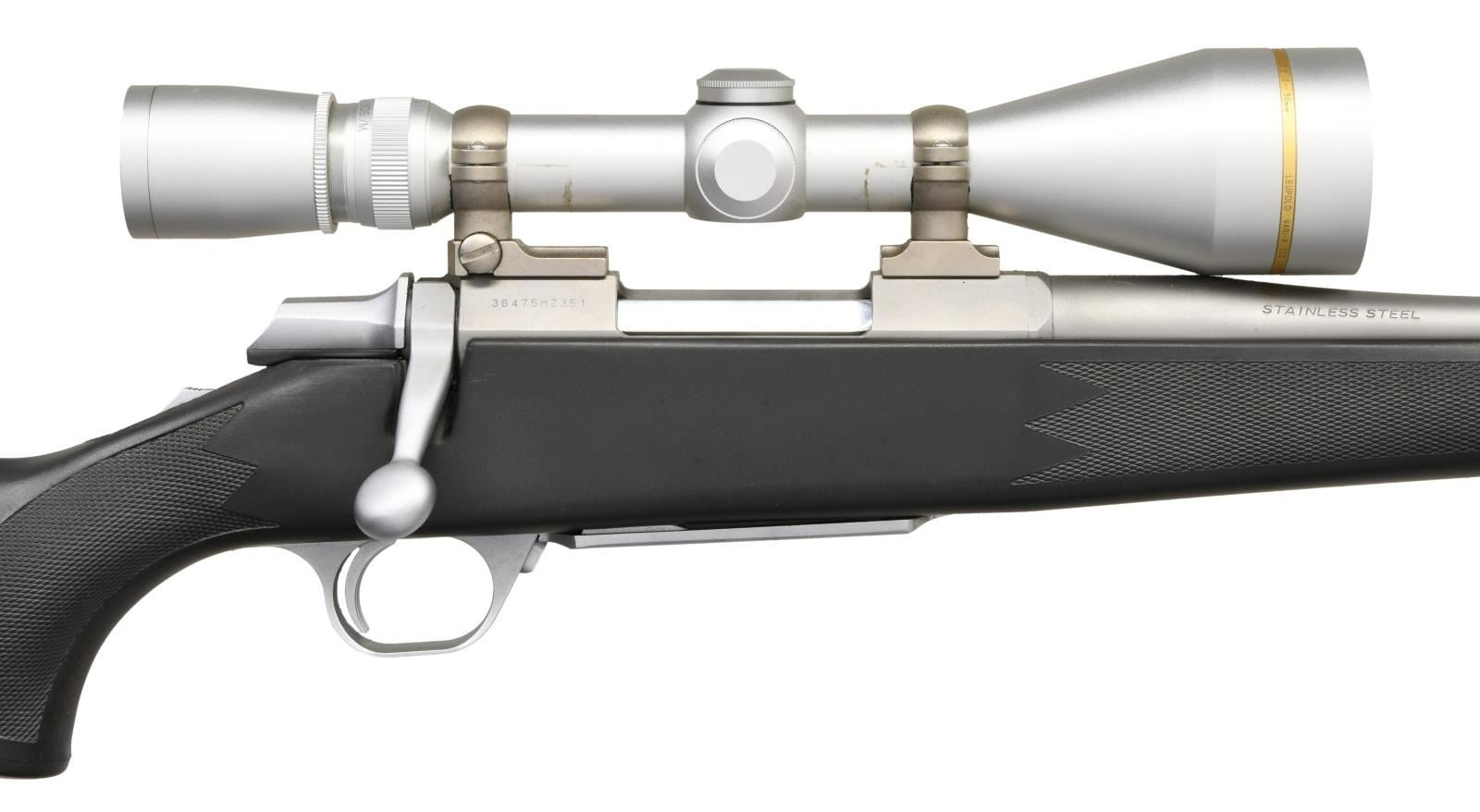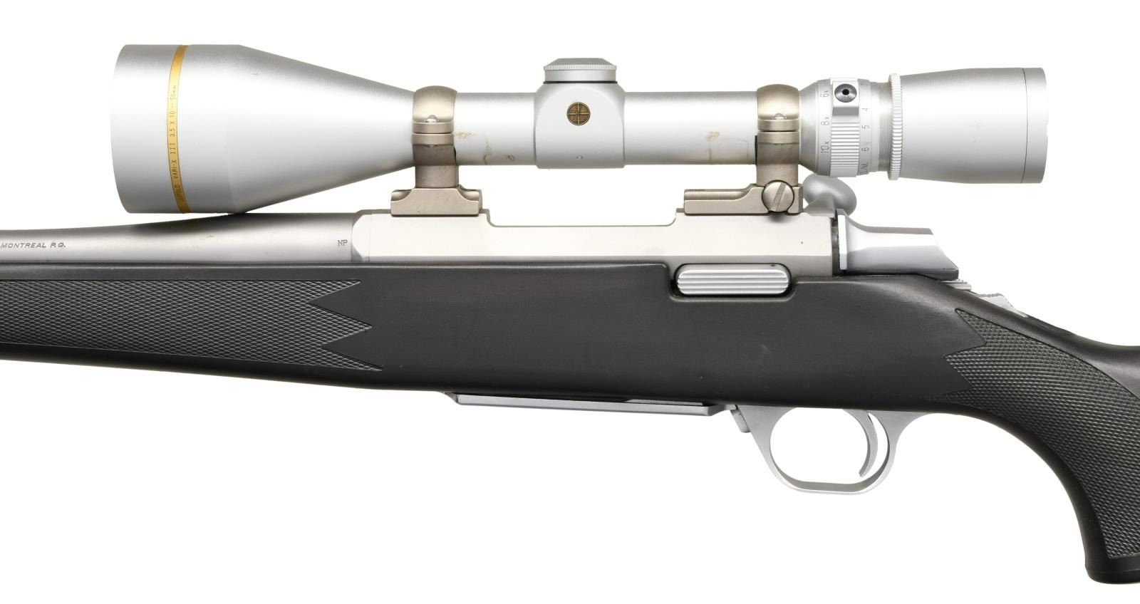Cal. 300 WSM. S# 36475MZ351. Bbl 25 1/2". A-Bolt bolt action rifle manufactured by Miroku and imported by Browning Arms Company. Left side of barrel is stamped with Browning's importer information, with the right side being stamped with patent information, followed by the model and caliber designations. Stainless steel finish with checkered black polymer stock. Integral muzzle brake. Receiver is mounted with a Leupold Vari-X 3.5-10x50mm scope. CONDITION: metal component exhibit some light superficial marks from handling and storage, with a couple small spots of minor discoloration. Mirror bore, exhibiting well defined rifling throughout. Stock shows some light superficial marks from handling and storage, but otherwise is very good overall. Scope retains a clear and sharp optic. (23-2525/MLW). MODERN. $1,000-1,500.