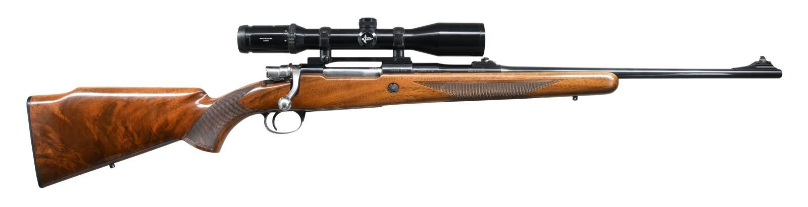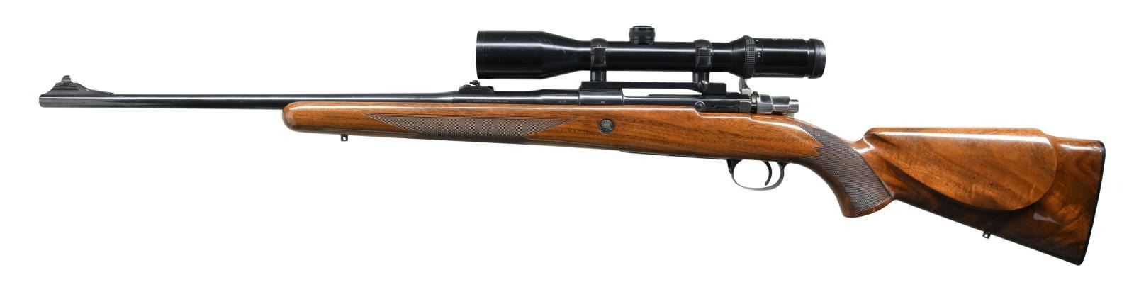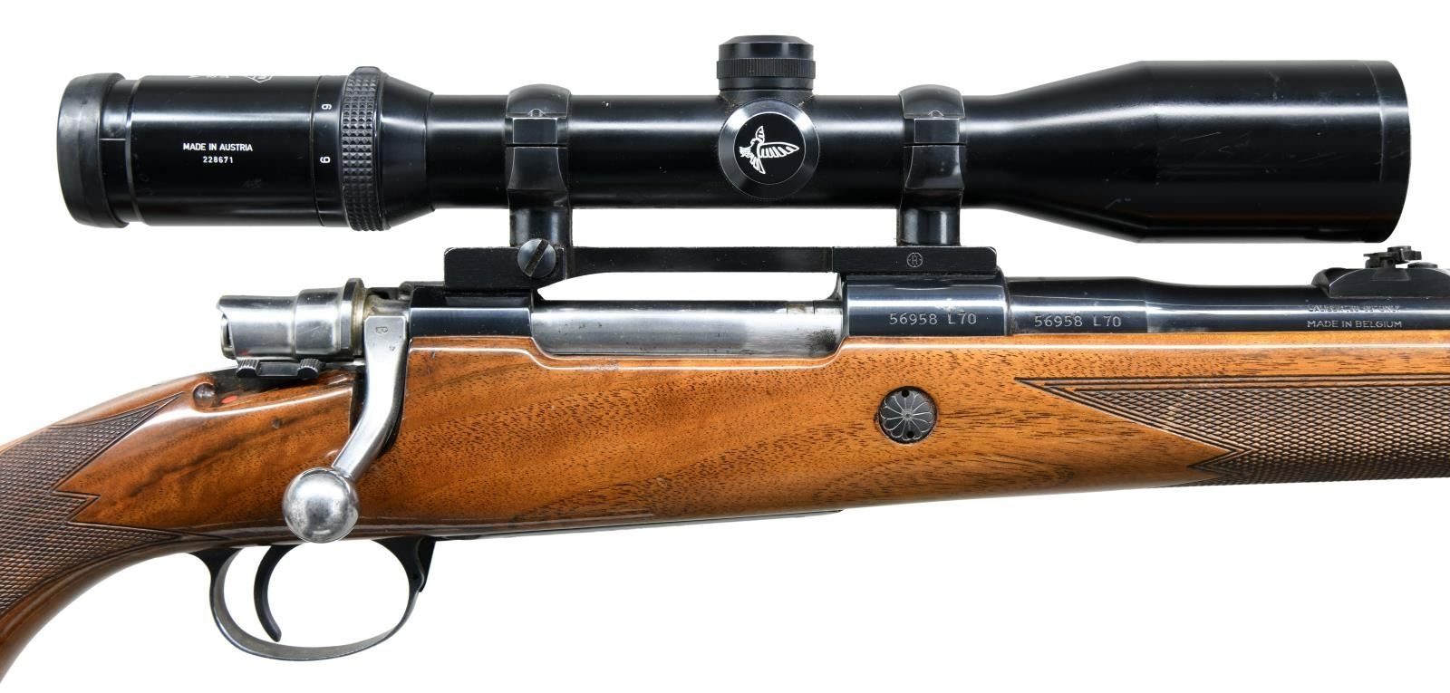 Cal. 30-06. S# 56958 L70. BBL: 22"medium sporter weight with ramp mounted bead front sight and island mounted folding leaf rear. FN M98 Supreme long extractor action. Alloy bottom metal has gold filled highlights. Monte Carlo cheekpiece stock of gloss finished fancy walnut with hand checkering & swivel bases. LOP: 13 5/8" over original buttplate. Swarovski 30mm 2.2-9x42 Nova gloss finished scope with heavy duplex reticle. Redfield mounts. 1970 Belgian mfg. Weight with scope 9 lbs., 5.4 ozs. CONDITION: Over 95% metal finish. Original stock finish shows areas of crazing with scratches & marks. Very good bright bore. Scope has bright optics. (23-1291/DS). CURIO. $1500-2000.