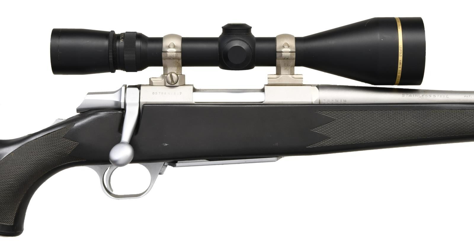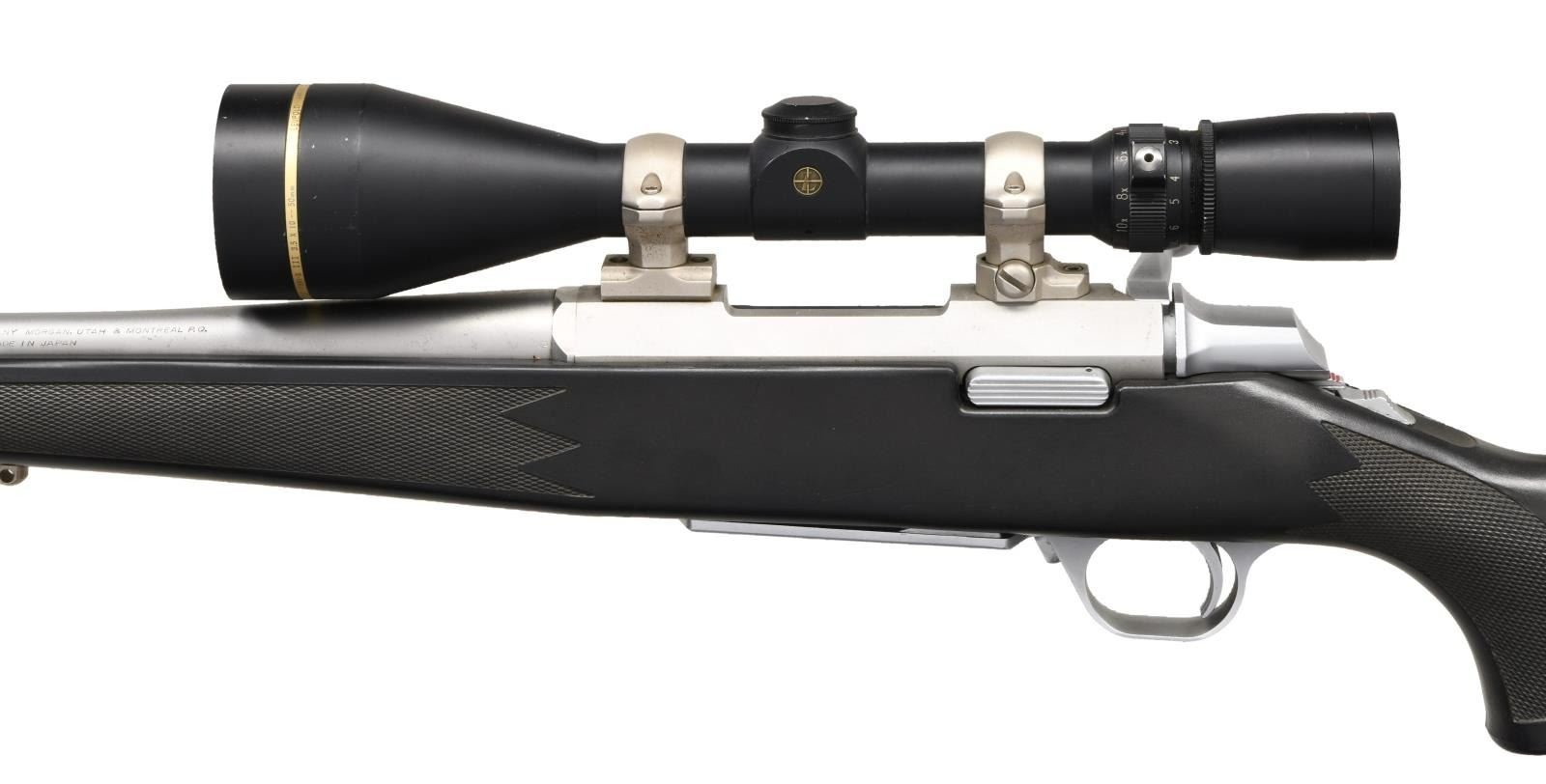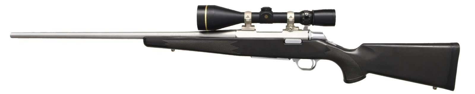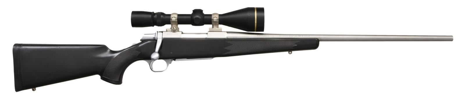 Cal. 204 Win. S# 65788NV8S7. Bbl 22". A-Bolt bolt action rifle manufactured by Miroku and imported by Browning Arms Company. Left side of barrel bears Browning's importer information, with the right side exhibiting the model and caliber designations. Factory stamped caliber designation has been crossed out, with "284 WIN" stamped at the breech. Stainless steel finish, with 1 piece checkered black synthetic stock. Receiver is mounted with a Leupold Vari-X 3.5-10x50mm scope. CONDITION: metal components exhibit some light superficial handling marks, as well as some scattered spots of rust and discoloration. Mirror bore, exhibiting well defined rifling throughout. Stock shows some scattered marks from handling and storage, but otherwise remains sturdy and serviceable. (23-2524/MLW). CURIO. $1,000-1,500.