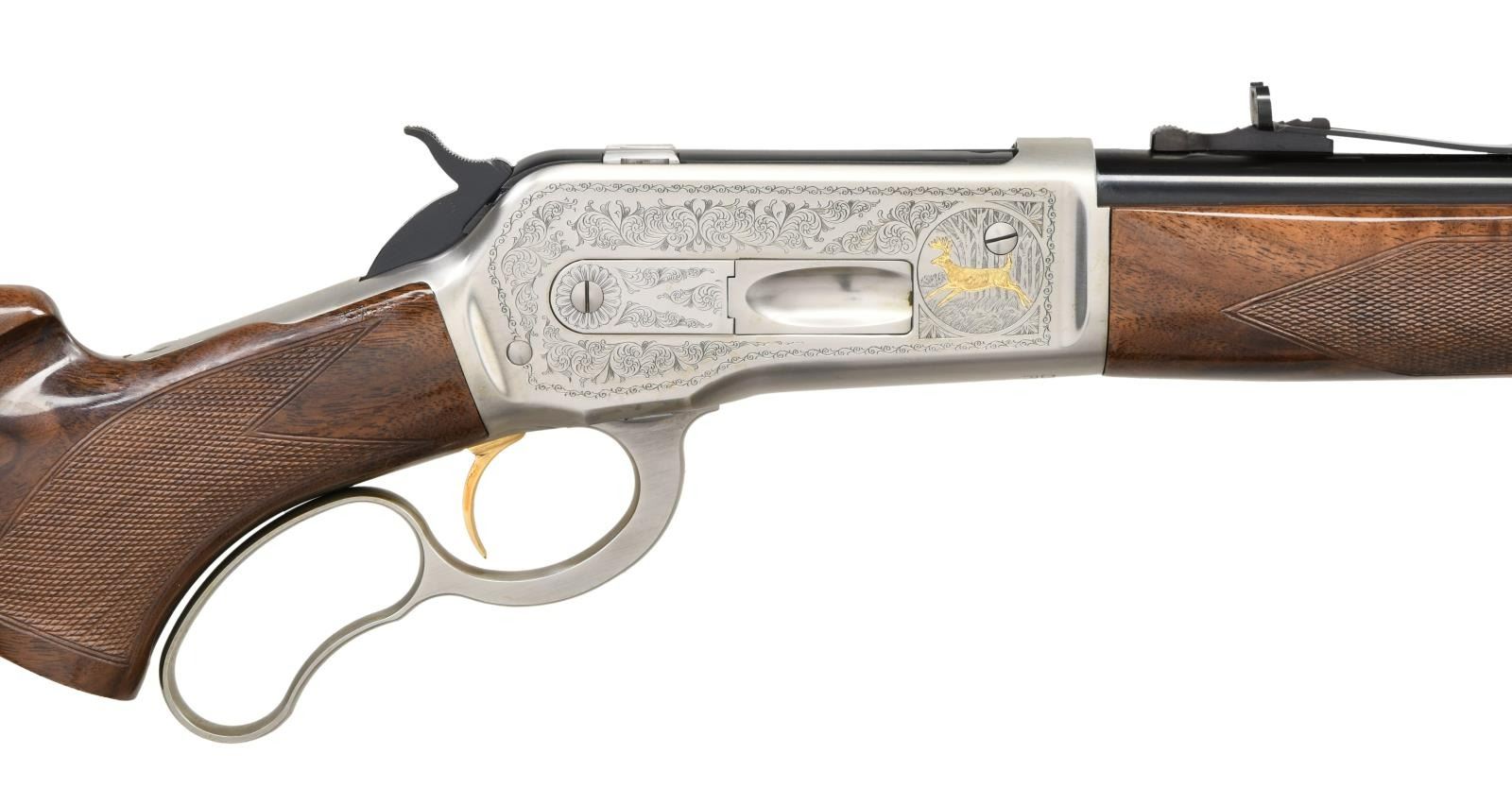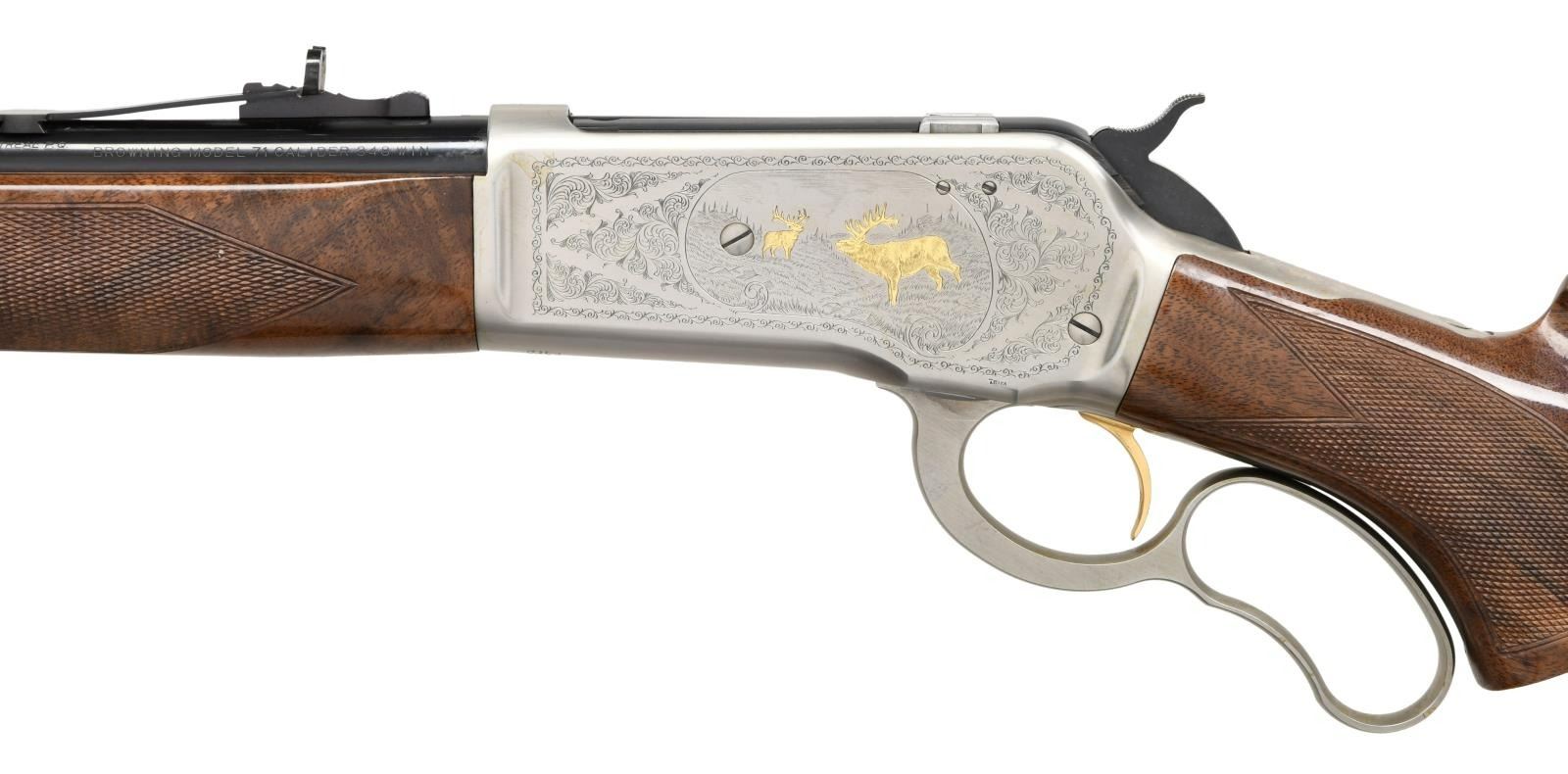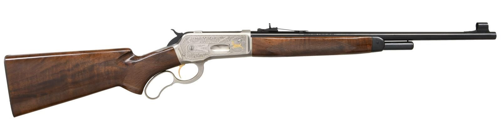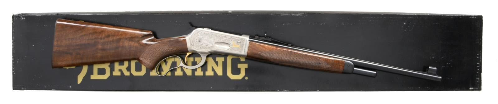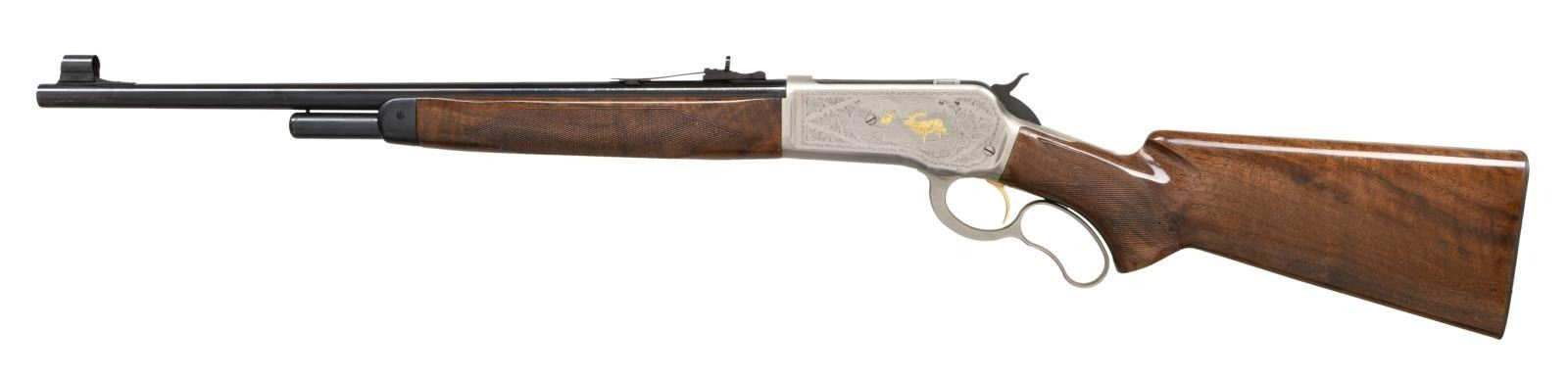 Cal. 348 Win. S#. 00693PR6C7. Bbl. 20" round with hooded ramp bead front & sporting rear sight. Grey finished action features gold plated deer on right with elk on left. Scenes are surrounded arabesque scroll. Gold plated trigger. Forend & pistol grip stock with checkered steel buttplate of gloss finished fancy walnut. Limited edition of 3000 mfg. 1986-1987. UNATTACHED ACCESORIES: Original box with owners manual & gun safe brochure. CONDITION: As new in box. (23-1325/DS). MODERN. $1500-2000.