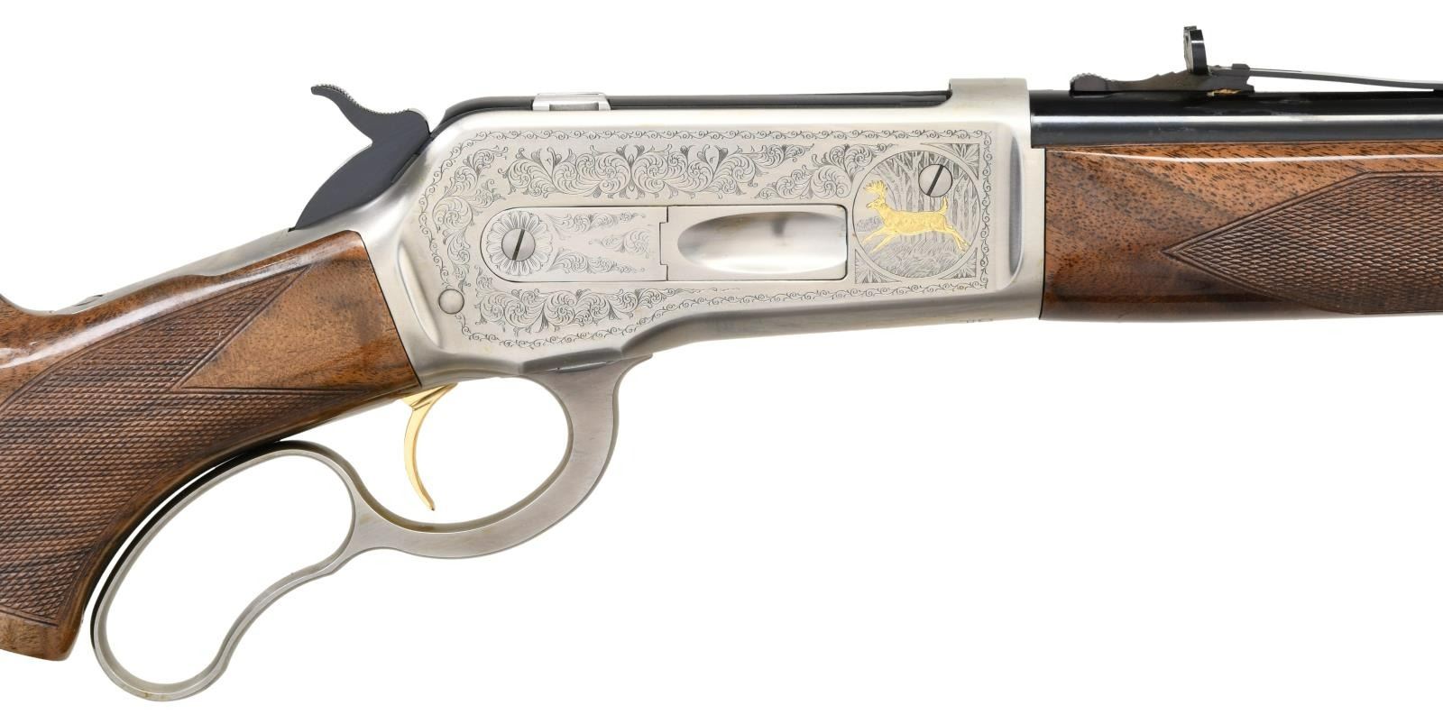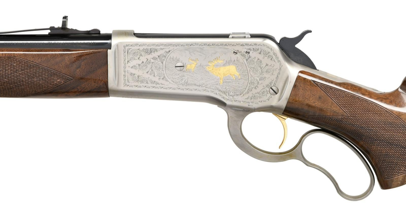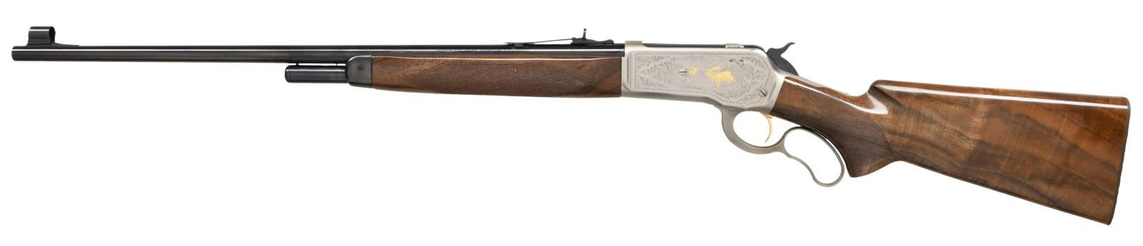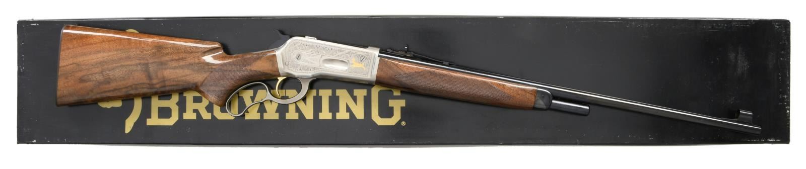 Cal. 348 Win. S# 00693PR6R7. Bbl. 24" round with hooded ramp bead front & sporting rear sights. Grey finished action has gold plated deer on right with gold plated elk on left side. Scenes are surrounded by arabesque scroll ornamentation. Forearm & pistol grips stock of gloss finished fancy walnut have cut checkering & checkered steel buttplate. Gold finished trigger. Limited edition of 3000 mfg. 1986-1987. UNATTACHED ACCESORIES: Original box with owners manual & gun safe brochure. CONDITION: As new in box. (23-1327/DS). MODERN. $1500-2000.