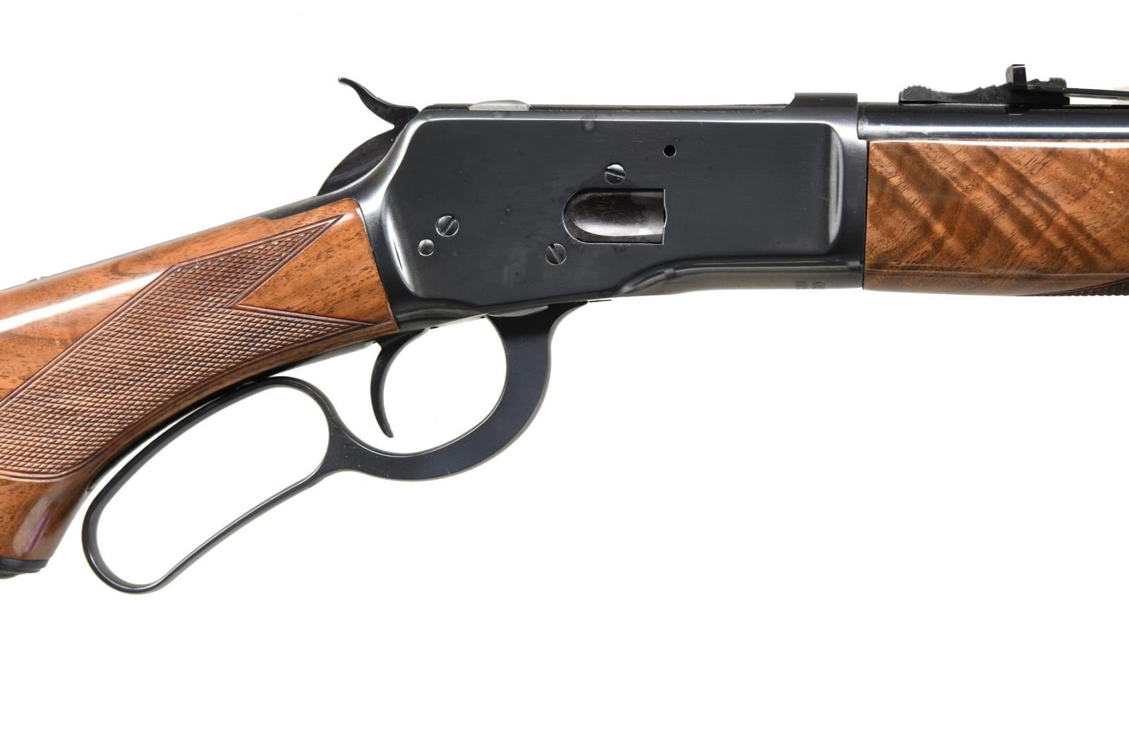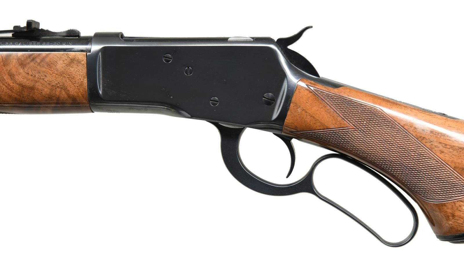 Cal. 32-20. S#. 00693NM3F7. Bbl. 22" round with bead front & sporting rear sights. Button mag. Blue finish. Forend & capped pistol grip stock with grooved steel buttplate of gloss finished fancy walnut. Limited edition of 5000 mfg. 1990. UNATTACHED ACCESORIES: original box with owners manual & knife brochure. CONDITION: As new in box. (23-1321/DS). MODERN. $800-1200.