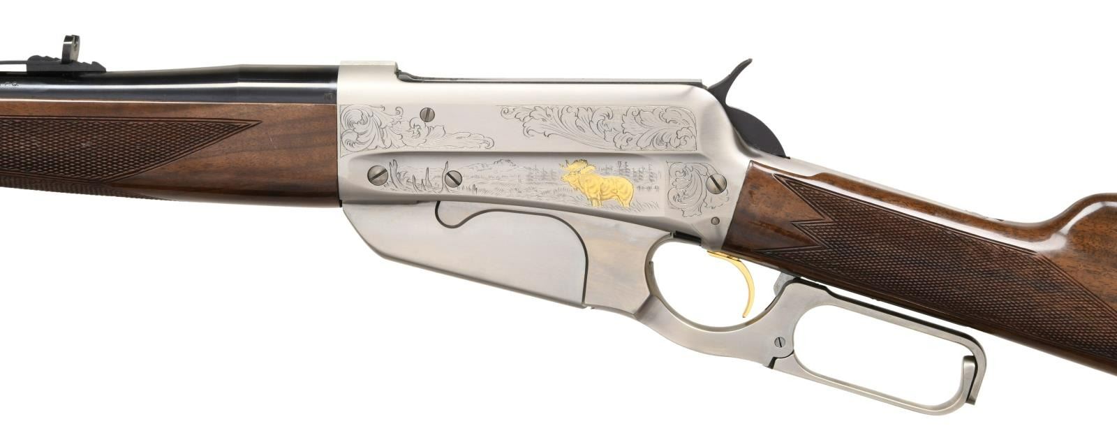 Cal. 30-06. S#. 00693PW687. Bbl. 24" tapered round with bead front & sporting rear sights. Grey finished action has foliate scroll surrounding scenes with gold plated moose & bear. Schnabel tipped forend & straight grip stock of gloss finished walnut with cut checkering and steel buttplate. Limited edition of 1000,1984 mfg. UNATTACHES ACCESORIES: Original box. CONDITION: Appears unfired retaining nearly all finish. Checkering shows some residue from storage. Near excellent bore. (23-1329/DS). MODERN. $1500-2000.