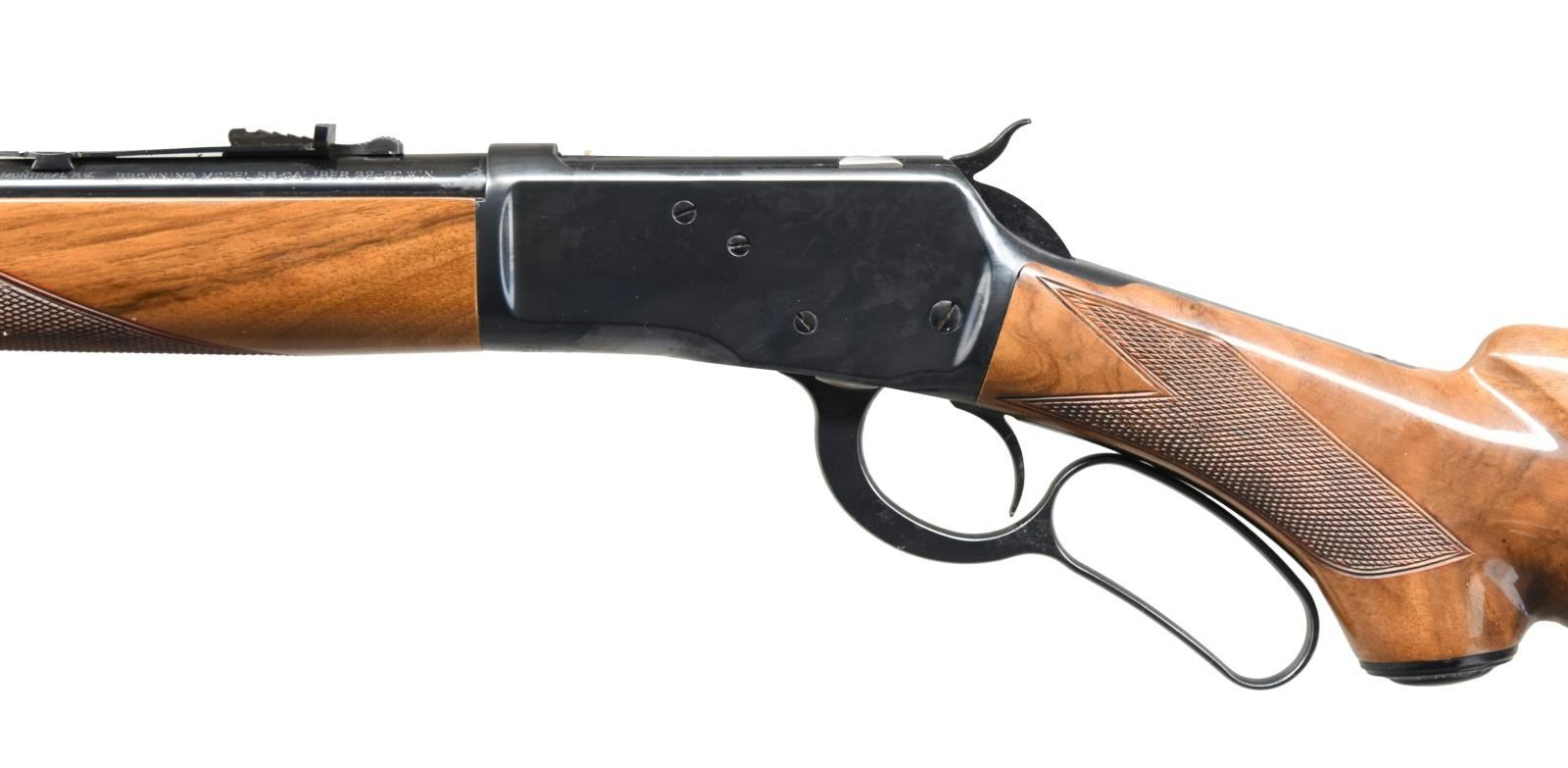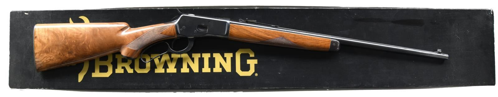 ACTION RIFLE. Cal. 32-20 Win. S# 00519NM3F7 (only 5,000 mfg. 1990). Tapered 22" bbl. w/ open sights. Blue finish. High grade checkered walnut stock set w/ grip cap & shotgun style buttplate. UNTTACHED ACCESSORIES: matching numbered Browning box w/ manual. CONDITION: near excellent metal & wood finish. Near excellent bore. (23-2354/MD). MODERN. $700-1,000.