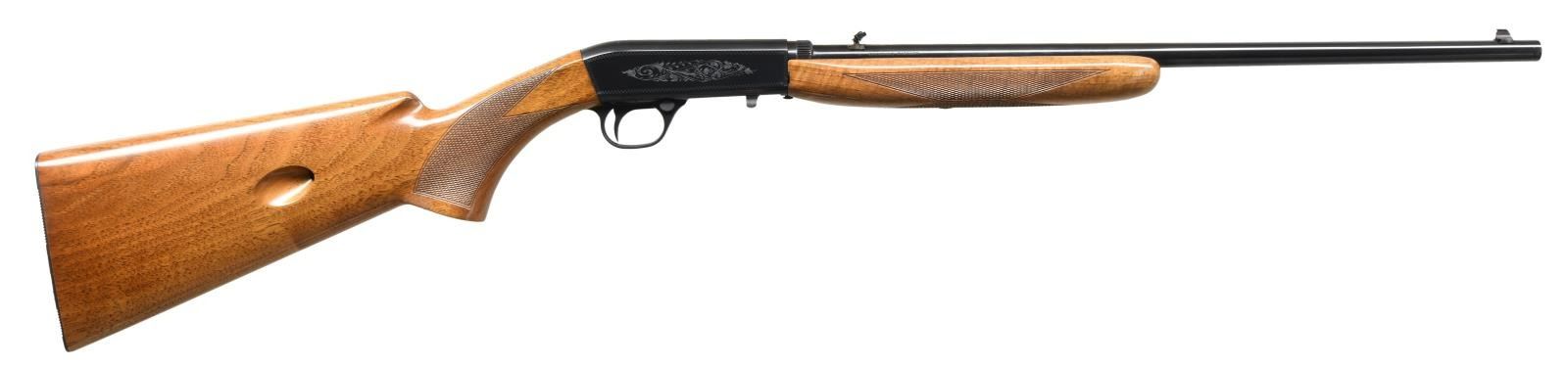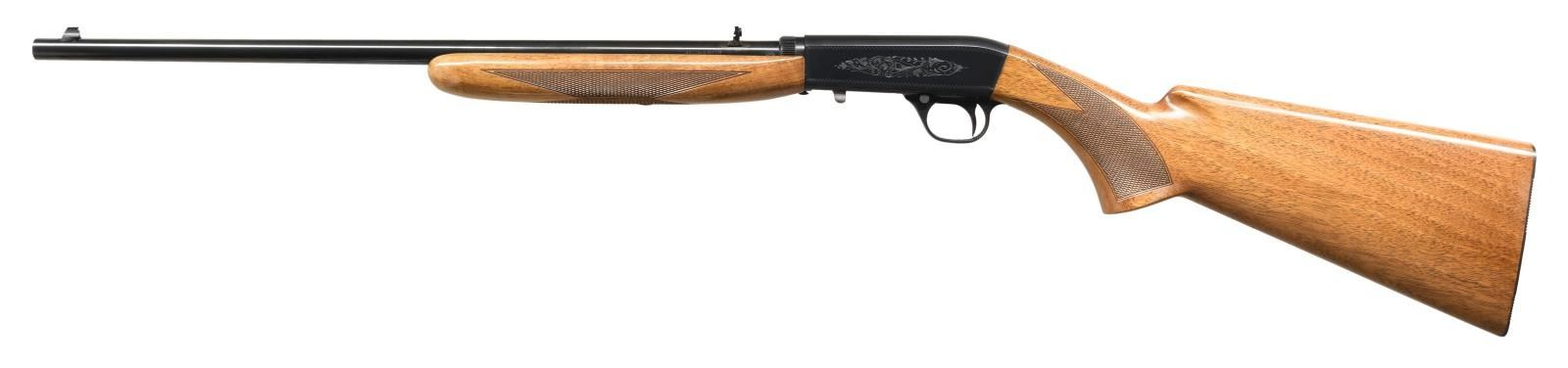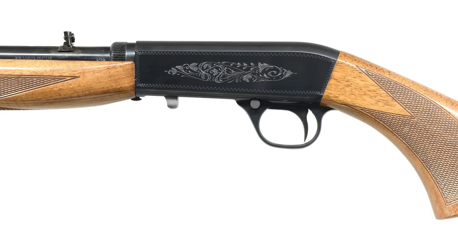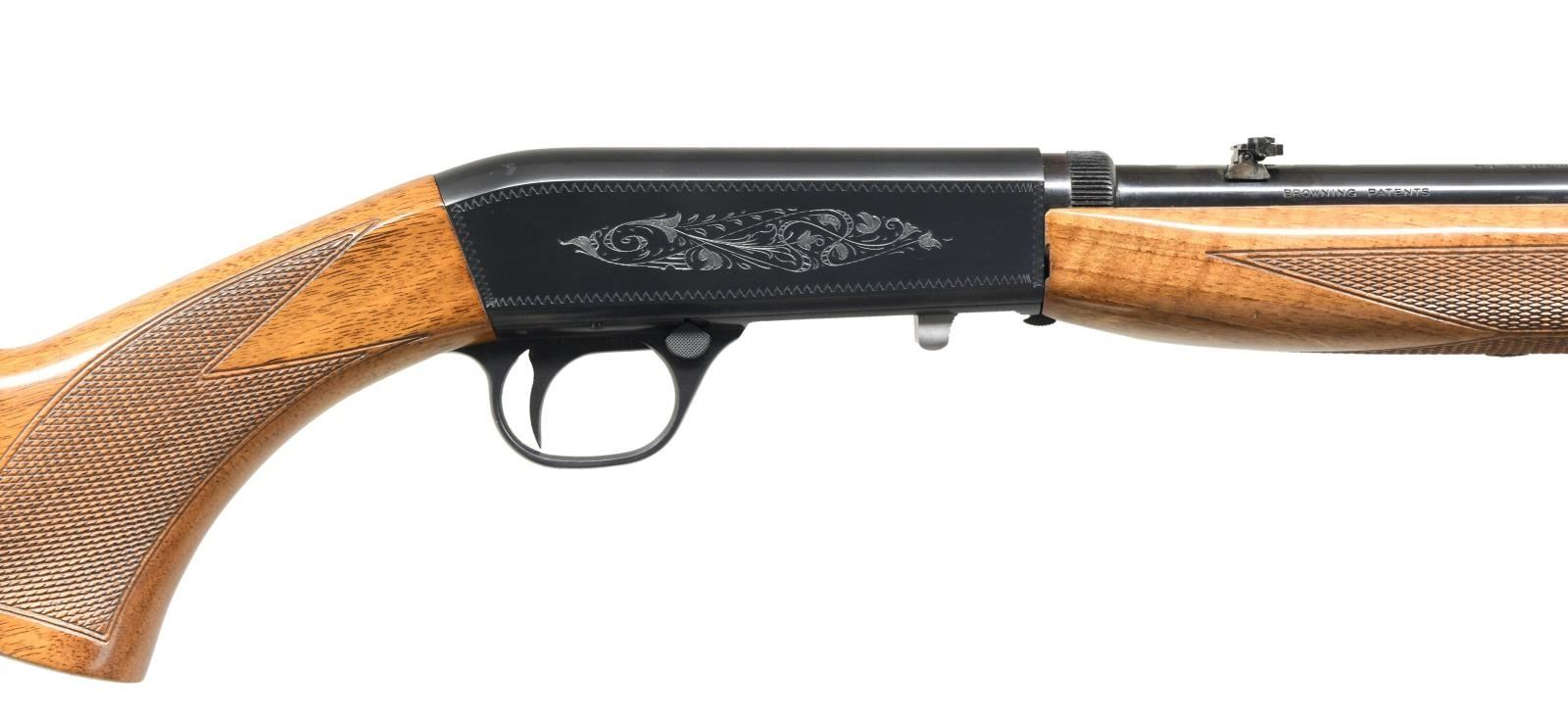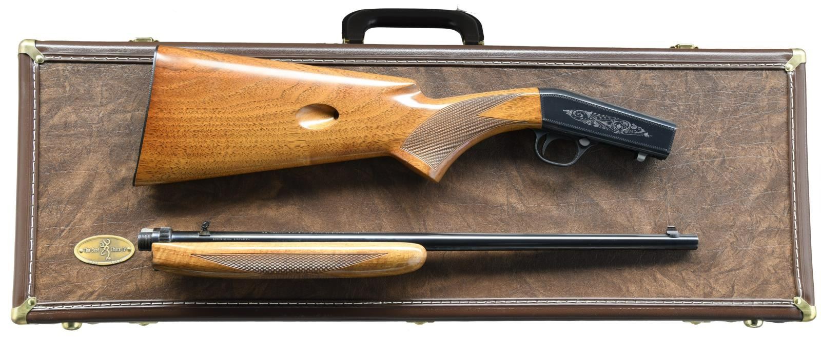 TAKEDOWN RIFLE. Cal. 22 LR. S# 69T17202. Bbl. 19 3/8". SA-22 semi-automatic rifle manufactured by FN in Belgium and imported/retailed by Browning Arms Company in 1969. The top of the barrel is marked with Browning's importer information above "MADE IN BELGIUM", with the caliber designation stamped on the left towards the breech. Sides of receiver exhibit light foliate engraved with a wavy line border. Belgian proofs are present on the underside of the bolt and left side of the barrel. Metal components exhibit a blued finish. Checkered wood buttstock with grooved steel buttplate, and checkered wood forend. Matching numbers are present on the frame (front face) and on the underside of the barrel. UNATTACHED ACCESSORIES: Contemporary Browning leatherette case with brown "fur" lining. CONDITION: very good overall, with metal components retaining the majority of their original factory blue finish, exhibiting a spot of finish loss around the rear sight base and underside of barrel that shows through to a gray and brown patina. Brilliant mirror bore, exhibiting sharp and well defined rifling throughout. Wood furniture shows a couple superficial marks from handling and storage, but is otherwise very good overall. Case is excellent. PROVENANCE: The Collection of Gun Sport Ltd. owned by Jon R. Thomas. (23-3837/MLW). CURIO. $1,250-1,750.