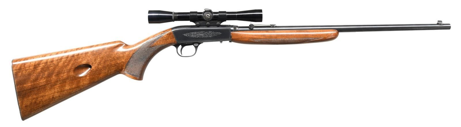 BROWNING SCOPE. Cal. 22 LR. S# T49490. Bbl. 19 3/8". SA-22 semi-automatic rifle manufactured in Belgium by FN and imported/retailed by Browning Arms Company. The barrel is marked with Browning's importer information above "MADE BELGIUM" over the top, with the caliber designation on the left. Receiver features light foliate engraving with a wavy line border on either side. Metal components exhibit a blued finish. Checkered wood buttstock with checkered wood forend. Buttstock has been sanded and revarnished at one time. Dovetailed blade front sight with dovetailed adjustable square notch rear sight. Receiver is mounted with a Browning 4x scope. CONDITION: metal components retain bountiful amounts of their original factory blue finish, exhibiting some light superficial marks from handling and storage. Mirror bore, exhibiting well defined rifling throughout. Wood furniture is very good overall. Scope retains a clear optic. PROVENANCE: The Collection of Gun Sport Ltd. owned by Jon R. Thomas. (23-3620/MLW). CURIO. $1,200-1,800.