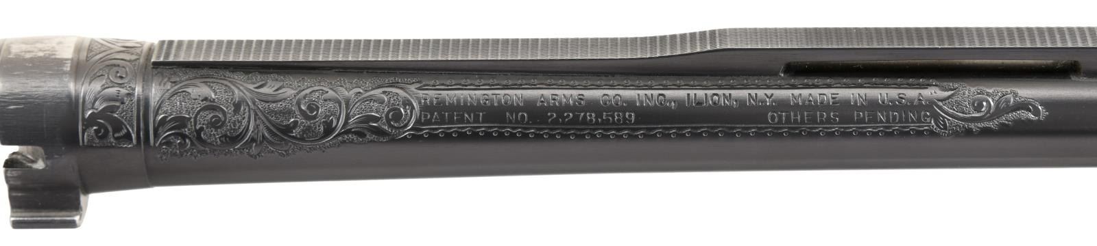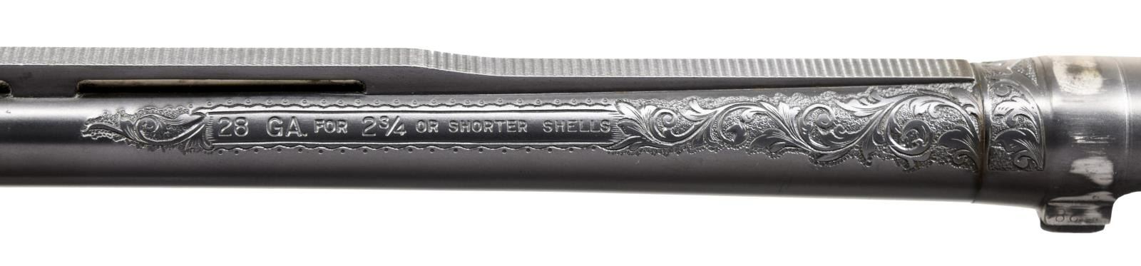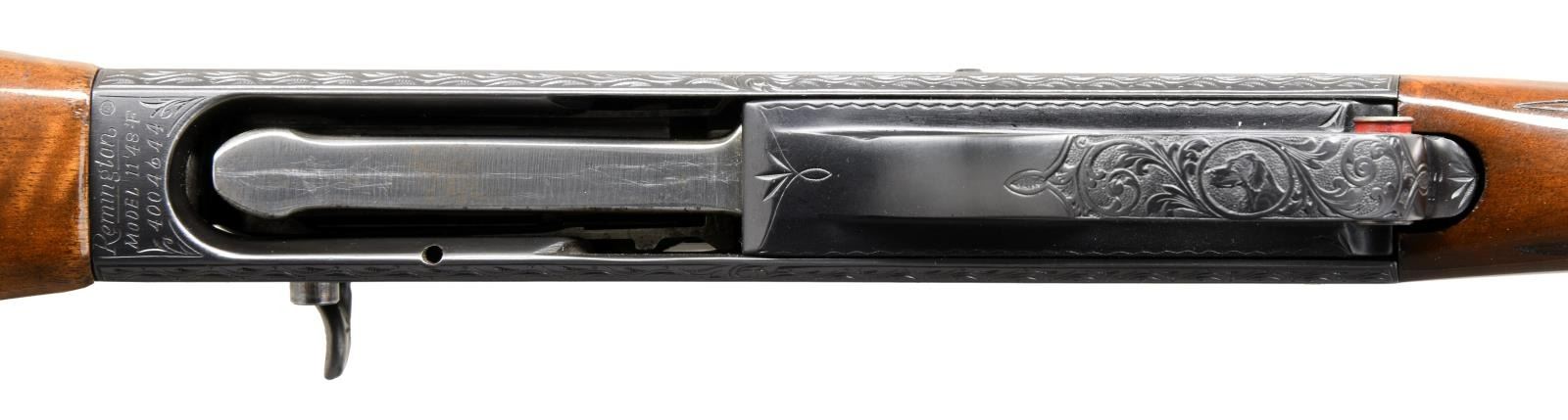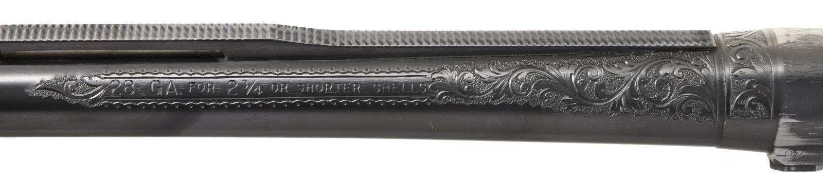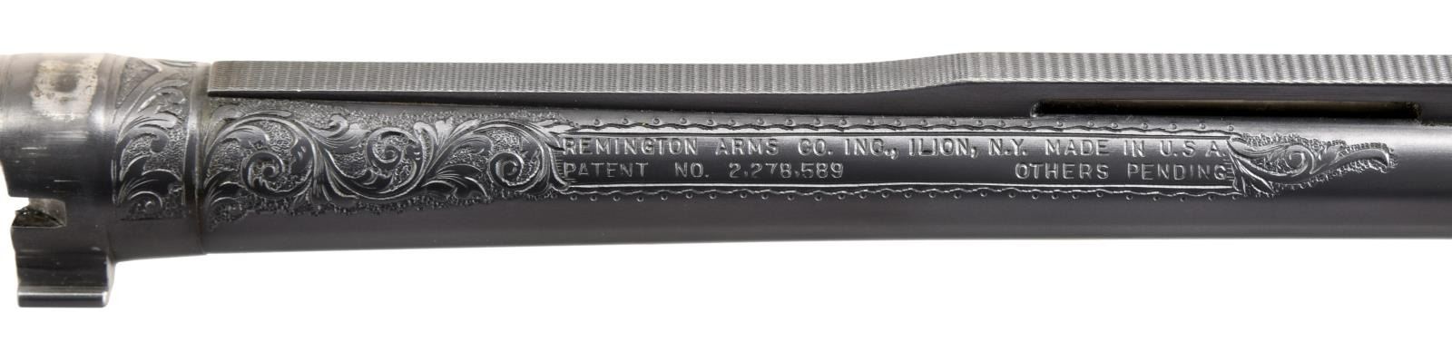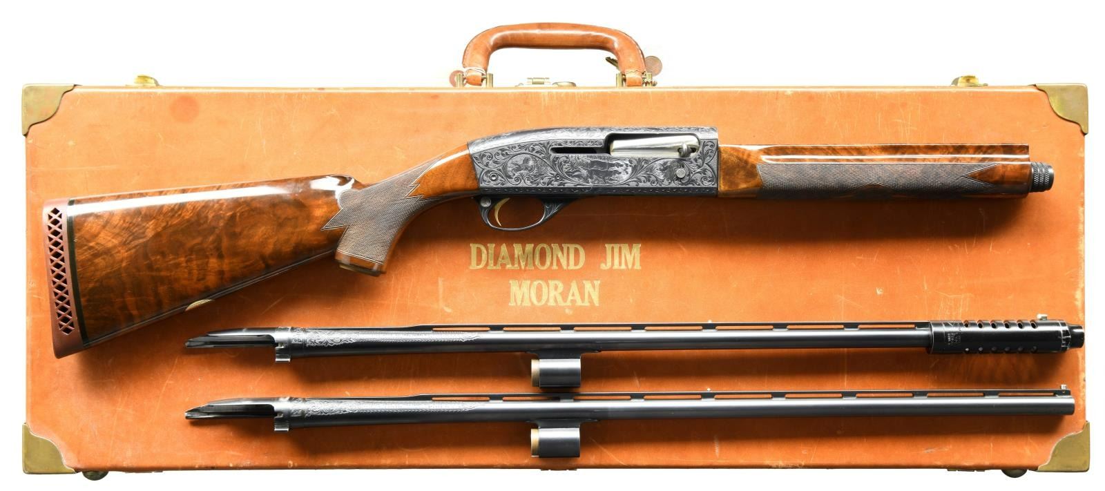 SHOTGUN. Cal. 28 Ga. 2 3/4". S# 4004644. The delightful 11-48 was a recoil operated shotgun produced from1949 to 1968. The "F" or "Premier" was the highest grade produced. Each side of the action features 3 vignettes with pointing dogs and game birds. The scenes are surrounded by vine type foliate engraving with finely stippled backgrounds that extend to upper & lower receiver areas as well the breech ends of both bbls. The unsigned engraving is likely the work of Remington Master Engraver Robert P. Runge. The blued finish is highlighted by a gold washed trigger. Trim finger groove forearm and hard rubber capped pistol grip stock of exhibition grade American black walnut is gloss finished. Fine "F" grade hand checkering. Oval brass presentation plate toeline is engraved "To Gov. Allen Shivers From Diamond Jim Moran". Allan Shivers was governor of Texas for a 7 1/2" year period beginning in 1949. Diamond Jim Moran was a flamboyant French Quarter restaurateur & gambler with reputed ties to the New Orleans mob. Born James Brocato, he was a former boxer and bodyguard to slain Sen. Huey Long. Diamond Jim became one of the most powerful figures in the most corrupt & colorful city in America. He wore mink & diamonds everywhere and was known as "The King of New Orleans". LOP: 14" over original red ventilated Pachmayr pad. Bbl. 1: 25" vent rib with fixed full choke. White mid bead is paired with an uncommon aluminum base diamond cut glass front sight. Bbl. 2: 25 1/4" vent rib with factory (no choke marking) alloy Cutts Compensator with spreader tube installed. White Bradley type target front sight with white mid bead. Both bbls. are numbered to the gun and have original factory "F" grade engraving. UNATTACHED ACCESSORIES: leather covered luggage case with brass fittings & purple velour fitted interior is engraved on the lid & front "DIAMOND JIM MORAN". Case contains cloth bbl. covers & 2 spare Full choke Cutts tubes. One tube is steel the other aluminum. Also included are 4 typed pages of historical information about Robert Allan Shivers and Diamond Jim Moran. CONDITION: very fine retaining over 98% original blue. Original wood finish shows small wear spots & handling marks. Bright near excellent bores. PROVENANCE: From the Estate of Jon Thomas. (23-4782/DS). CURIO. $10,000-15,000.