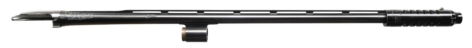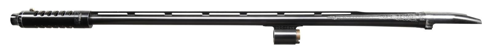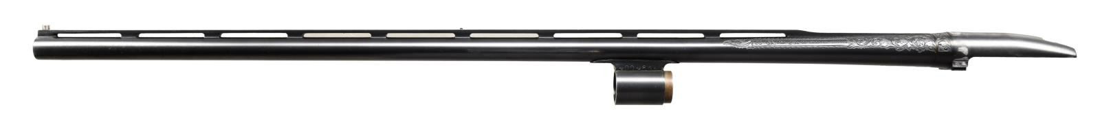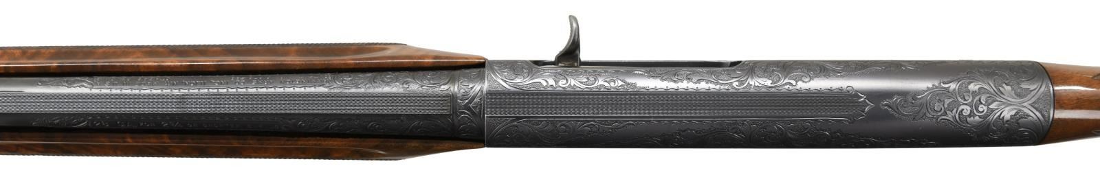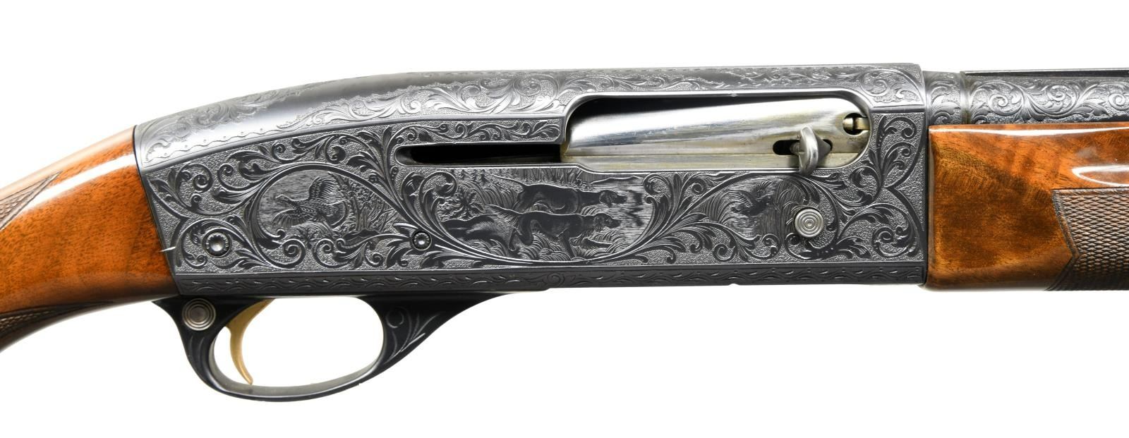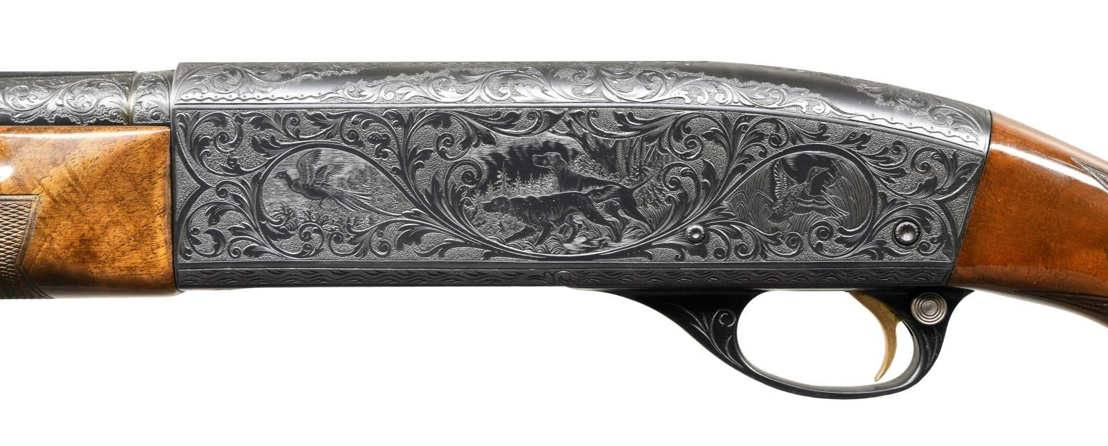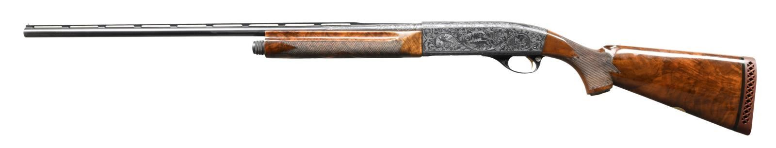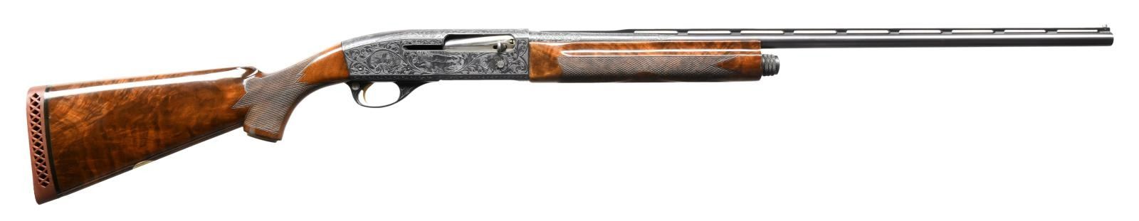 SHOTGUN. Cal. 28 Ga. 2 3/4". S# 4004644. The delightful 11-48 was a recoil operated shotgun produced from1949 to 1968. The "F" or "Premier" was the highest grade produced. Each side of the action features 3 vignettes with pointing dogs and game birds. The scenes are surrounded by vine type foliate engraving with finely stippled backgrounds that extend to upper & lower receiver areas as well the breech ends of both bbls. The unsigned engraving is likely the work of Remington Master Engraver Robert P. Runge. The blued finish is highlighted by a gold washed trigger. Trim finger groove forearm and hard rubber capped pistol grip stock of exhibition grade American black walnut is gloss finished. Fine "F" grade hand checkering. Oval brass presentation plate toeline is engraved "To Gov. Allen Shivers From Diamond Jim Moran". Allan Shivers was governor of Texas for a 7 1/2" year period beginning in 1949. Diamond Jim Moran was a flamboyant French Quarter restaurateur & gambler with reputed ties to the New Orleans mob. Born James Brocato, he was a former boxer and bodyguard to slain Sen. Huey Long. Diamond Jim became one of the most powerful figures in the most corrupt & colorful city in America. He wore mink & diamonds everywhere and was known as "The King of New Orleans". LOP: 14" over original red ventilated Pachmayr pad. Bbl. 1: 25" vent rib with fixed full choke. White mid bead is paired with an uncommon aluminum base diamond cut glass front sight. Bbl. 2: 25 1/4" vent rib with factory (no choke marking) alloy Cutts Compensator with spreader tube installed. White Bradley type target front sight with white mid bead. Both bbls. are numbered to the gun and have original factory "F" grade engraving. UNATTACHED ACCESSORIES: leather covered luggage case with brass fittings & purple velour fitted interior is engraved on the lid & front "DIAMOND JIM MORAN". Case contains cloth bbl. covers & 2 spare Full choke Cutts tubes. One tube is steel the other aluminum. Also included are 4 typed pages of historical information about Robert Allan Shivers and Diamond Jim Moran. CONDITION: very fine retaining over 98% original blue. Original wood finish shows small wear spots & handling marks. Bright near excellent bores. PROVENANCE: From the Estate of Jon Thomas. (23-4782/DS). CURIO. $10,000-15,000.