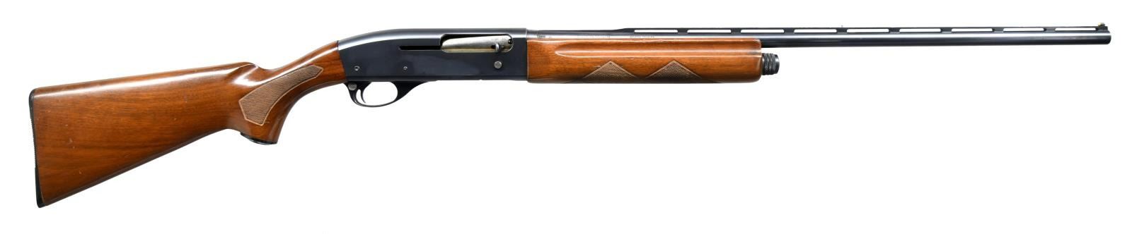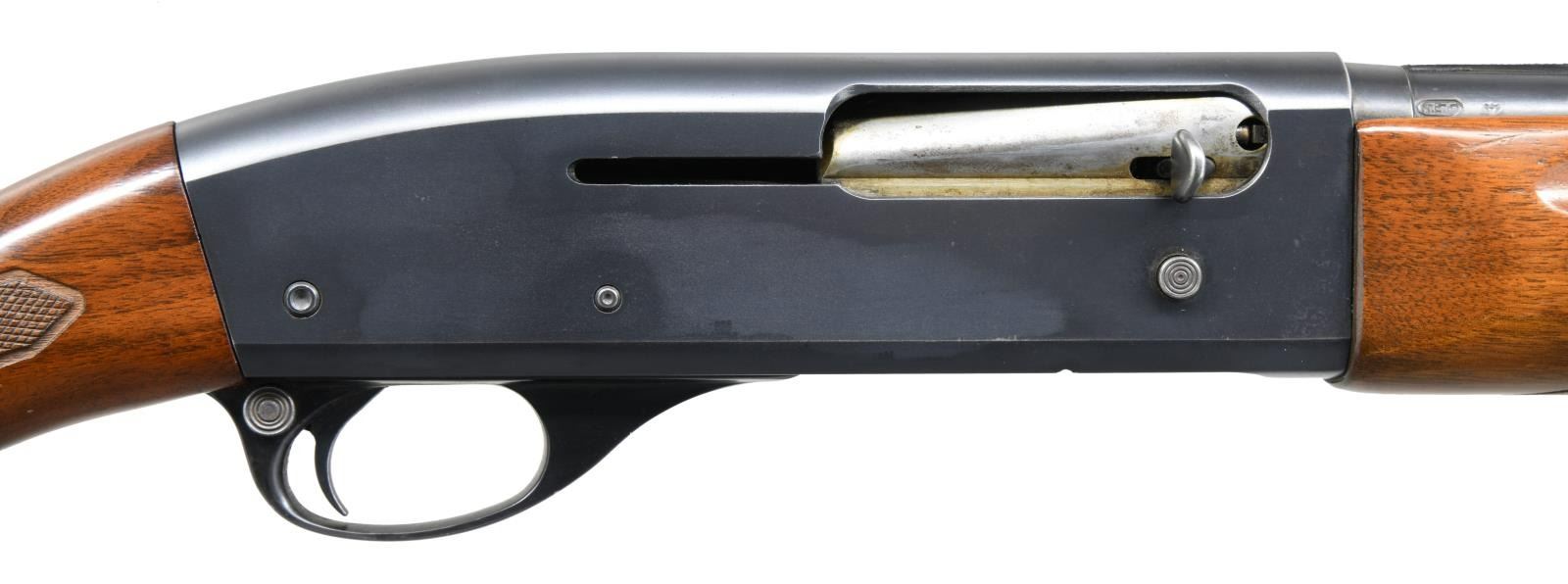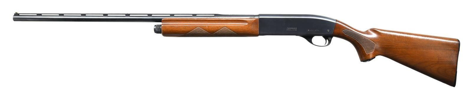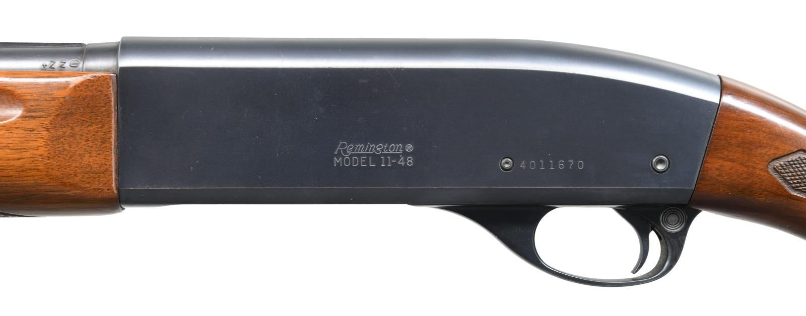 SHOTGUN. Cal. 28 GA, 2 3/4". S# 4011670. Bbl 25". Model 11-48 Skeet semi-automatic shotgun manufactured by Remington. Left side of barrel bears the caliber designation followed by "SKEET" and "ZZ" date code, with Remington's manufacturer information stamped on the right. Left side of receiver is stamped "Remington/ MODEL 11-48" followed by the serial number. Metal components are blued, with the stock and forend being comprised of checkered wood. Vent rib with ivory front sight CONDITION: metal components retain the majority of their original factory blue finish, exhibiting some light wear, as well as areas of light surface oxidation. Mirror bore. Wood furniture shows some scattered marks from handling and storage, but otherwise remains sturdy and serviceable. (23-2048/MLW). CURIO. $600-900.