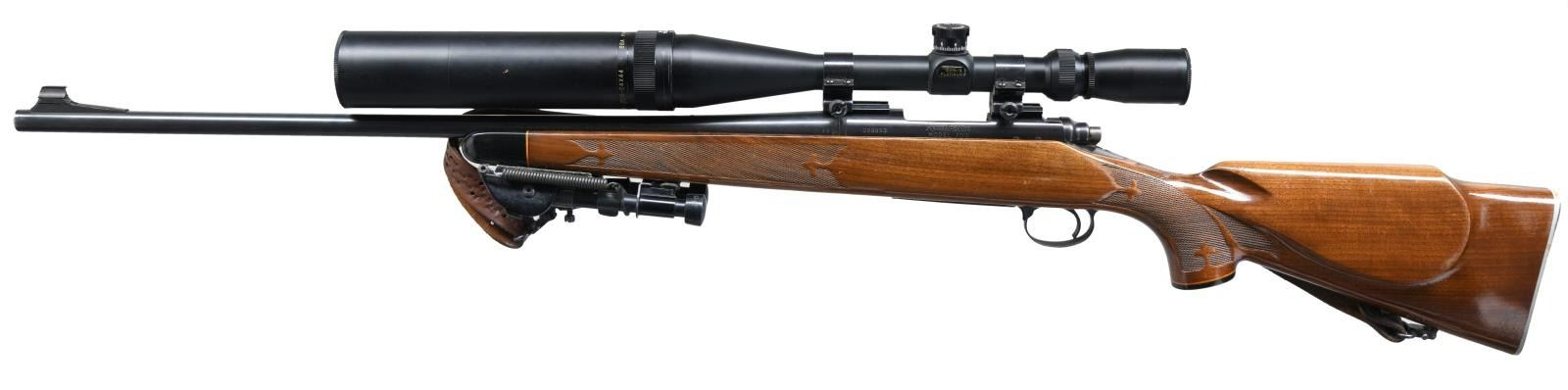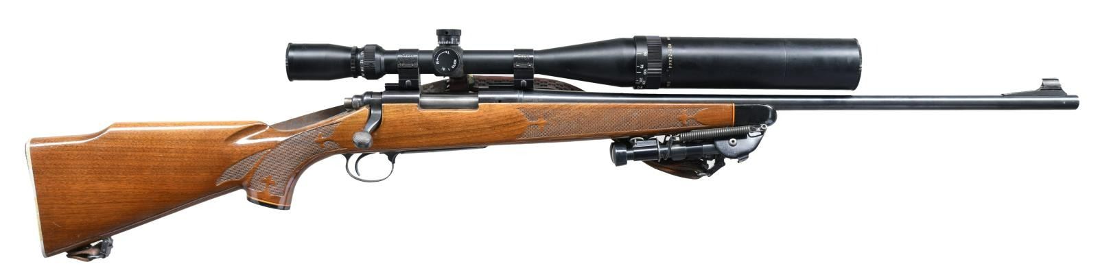 Cal. .22-250 Remington. S# 289853. Bbl 24". Blued finish with a 1-piece solid wood stock featuring fleur-de-lis checkered panels at the forend and wrist. Receiver is mounted with a BSA Platinum 6-24x44 scope. Rifle is mounted with an unmarked adjustable bipod and a brown leather sling. CONDITION: Metal components retain the majority of their original factory blue finish, exhibiting some mild wear at the muzzle and on the bolt knob. Bright bore, exhibiting good rifling throughout. Stock exhibits some scattered superficial marks from storage and handling. Optic retains a clear sight picture. (23-1910/MLW). MODERN. $600-1000