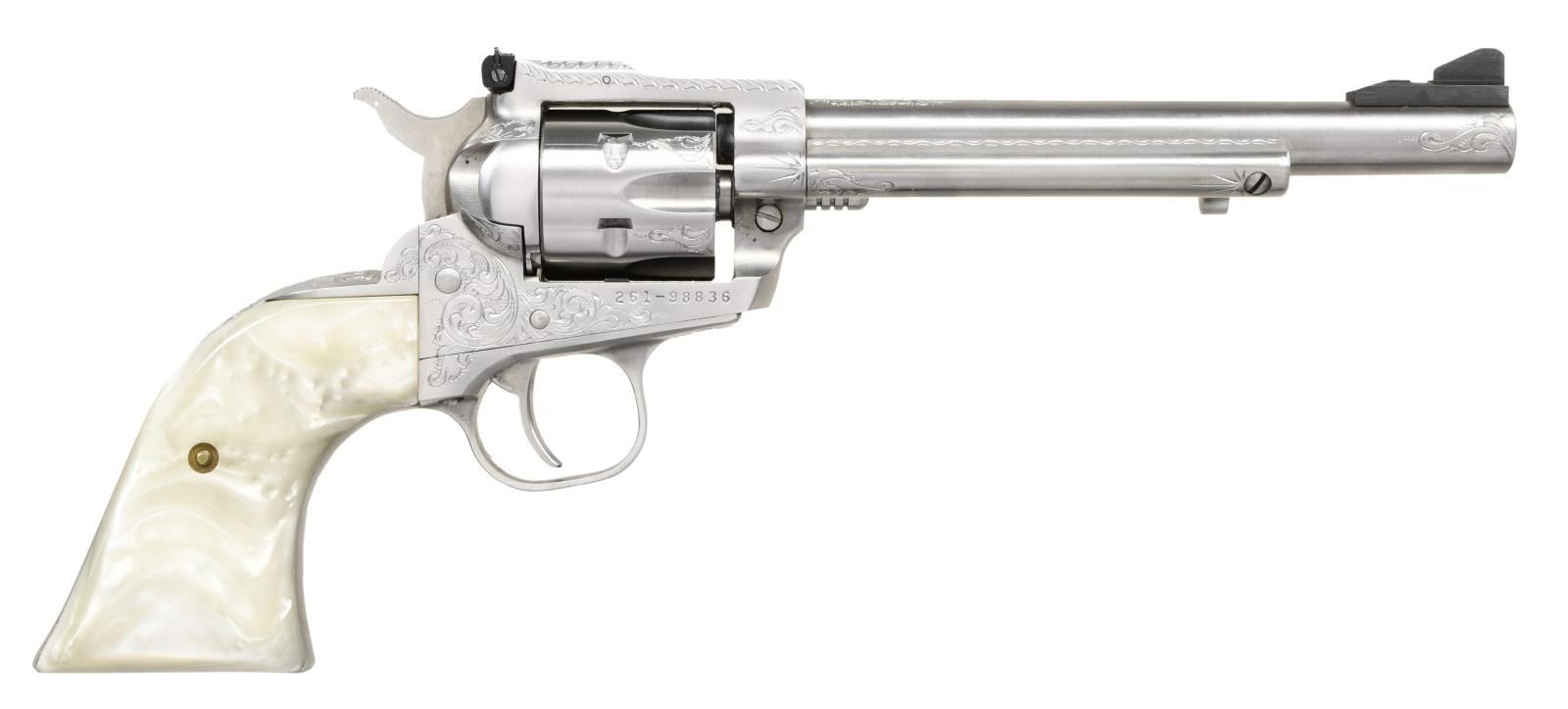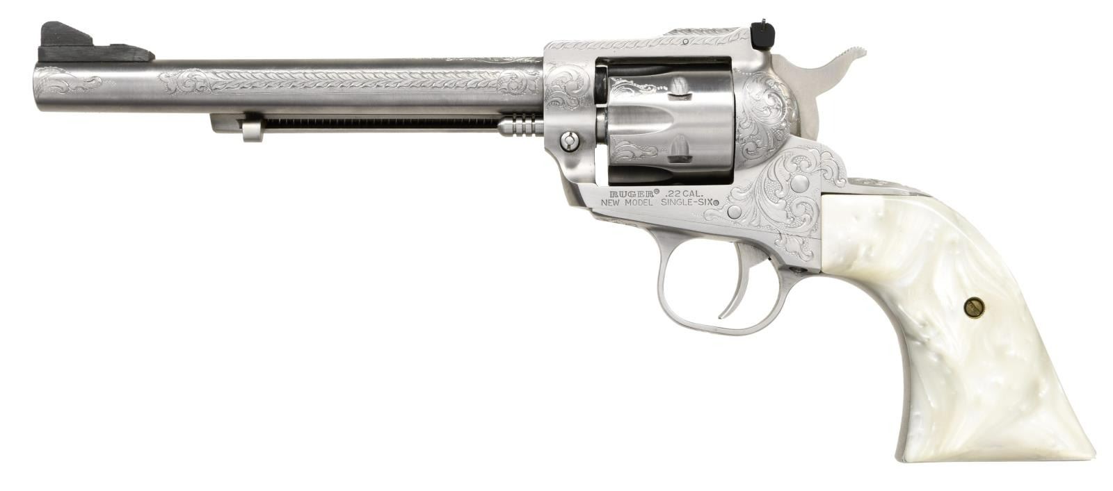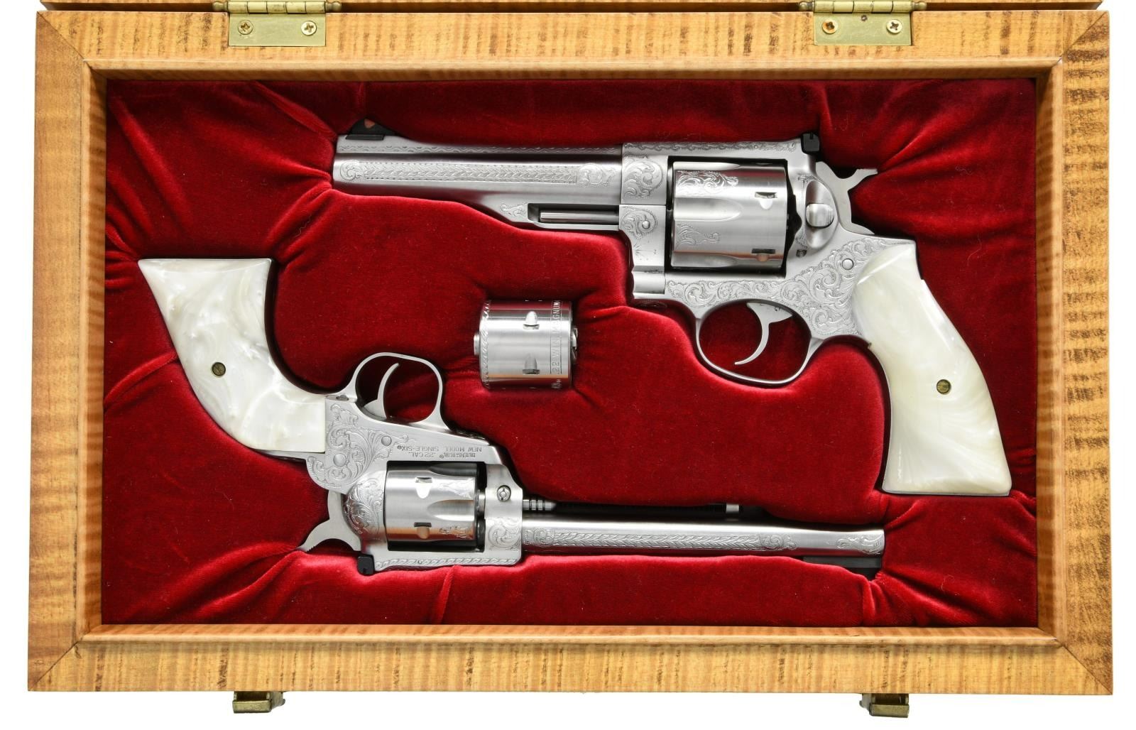 REDHAWK & SINGLE-SIX. 1) NEW MODEL SINGLE-SIX CONVERTIBLE. Cal. 22 LR / 22 Mag. S# 261-98836. Bbl. 6 1/2". Mfg. 1989; fluted LR cyl.; no firing pin groove. 2) REDHAWK. Cal. 44 Mag. S# 503-19527. Bbl. 5 1/2". Mfg. 1997. BOTH: Engraved by Adams & Adams of Vershire, VT; John Sr. & Jr. John Sr. renowned for engraving over 3,000 firearms for Colt. Chiseled scroll engraving having punch dot backgrounds. Very full coverage; each signed "J. ADAMS" (front butt of Single-Six & front bottom of Redhawk frame). Simulated pearl grips of unknown make. Factory adjustable sights; Redhawk having red insert front plus white outlined rear. UNATTACHED ACCESSORIES: matching numbered unfluted 22 Mag. cyl. for Single-Six having fine circular engraved band at front. Finely made, glass topped display case of fiddleback maple having dark wood finger joints on corners. Plush red padded velvet outlined interior; brass hardware. CONDITION: all aspects of offering are near excellent. Careful examination of revolvers indicates firing more than factory testing, but superbly cleaned; no turn lines on cyls. (23-1554 & 23-1613/NW). BOTH MODERN. $3,500-4,500.