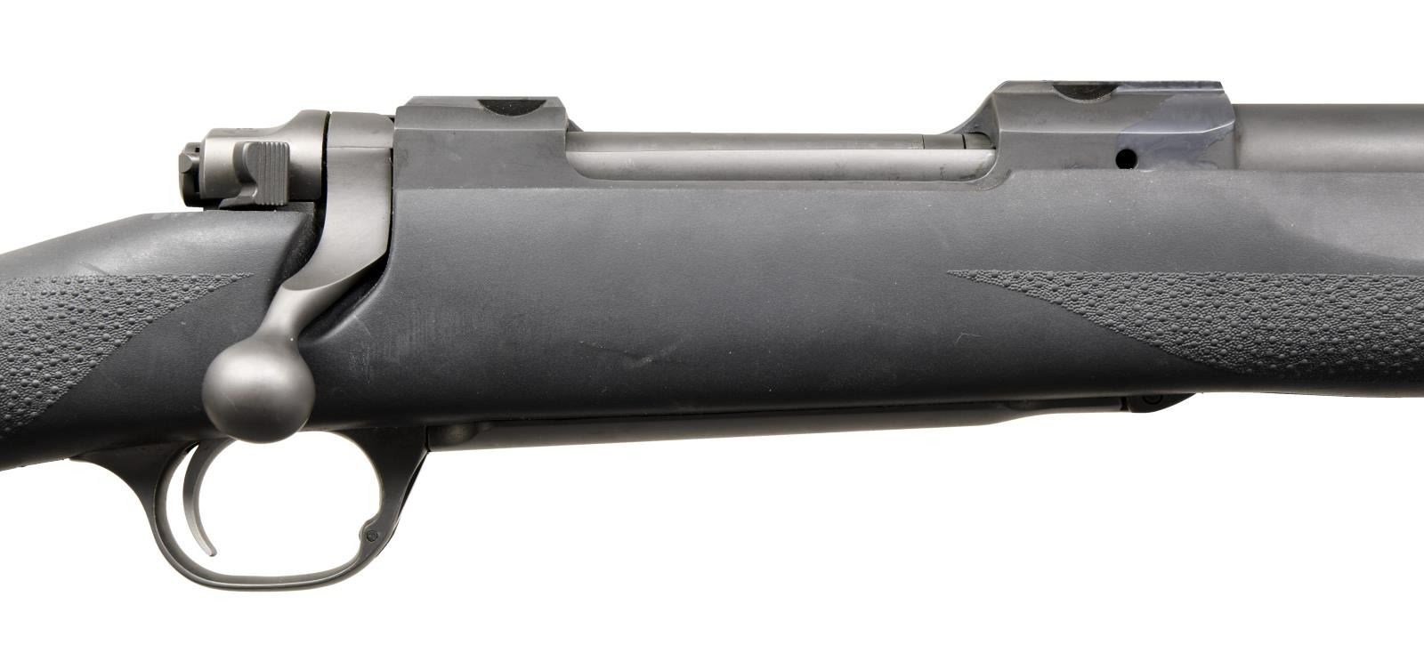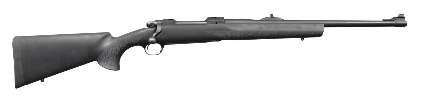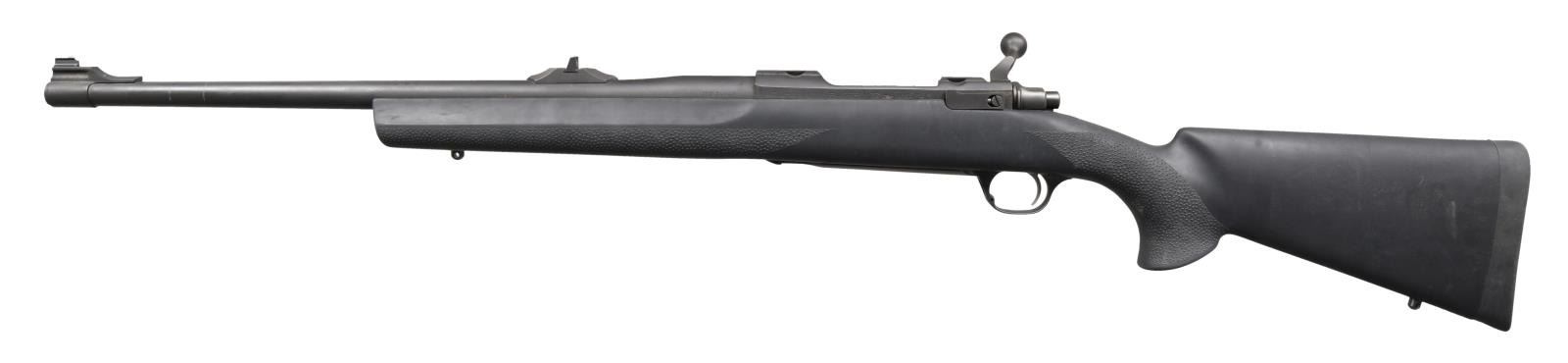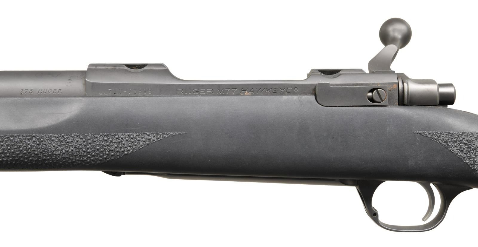 Cal. 375 Ruger. S# 710-03898. Bbl. 20". Express style sights. Matte gray finish. Black synthetic stock w/ bottom mounted sling studs. Hogue recoil pad. LOP: 13 3/4". CONDITION: all aspects rate about very good w/ a couple small spots of light oxidation, some dust staining & scattered handling wear. Bright bore. (23-4796/MJC). MODERN. $1100-1500.