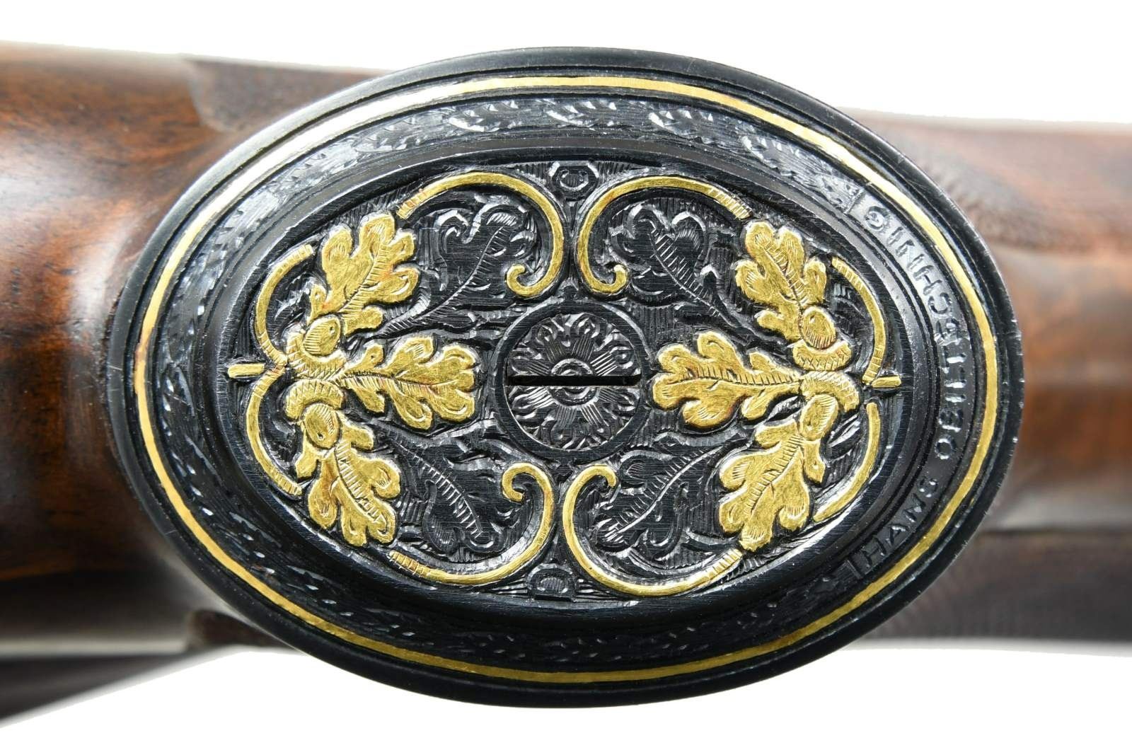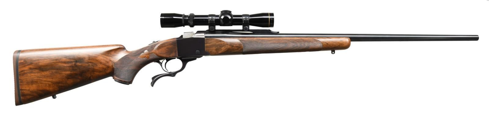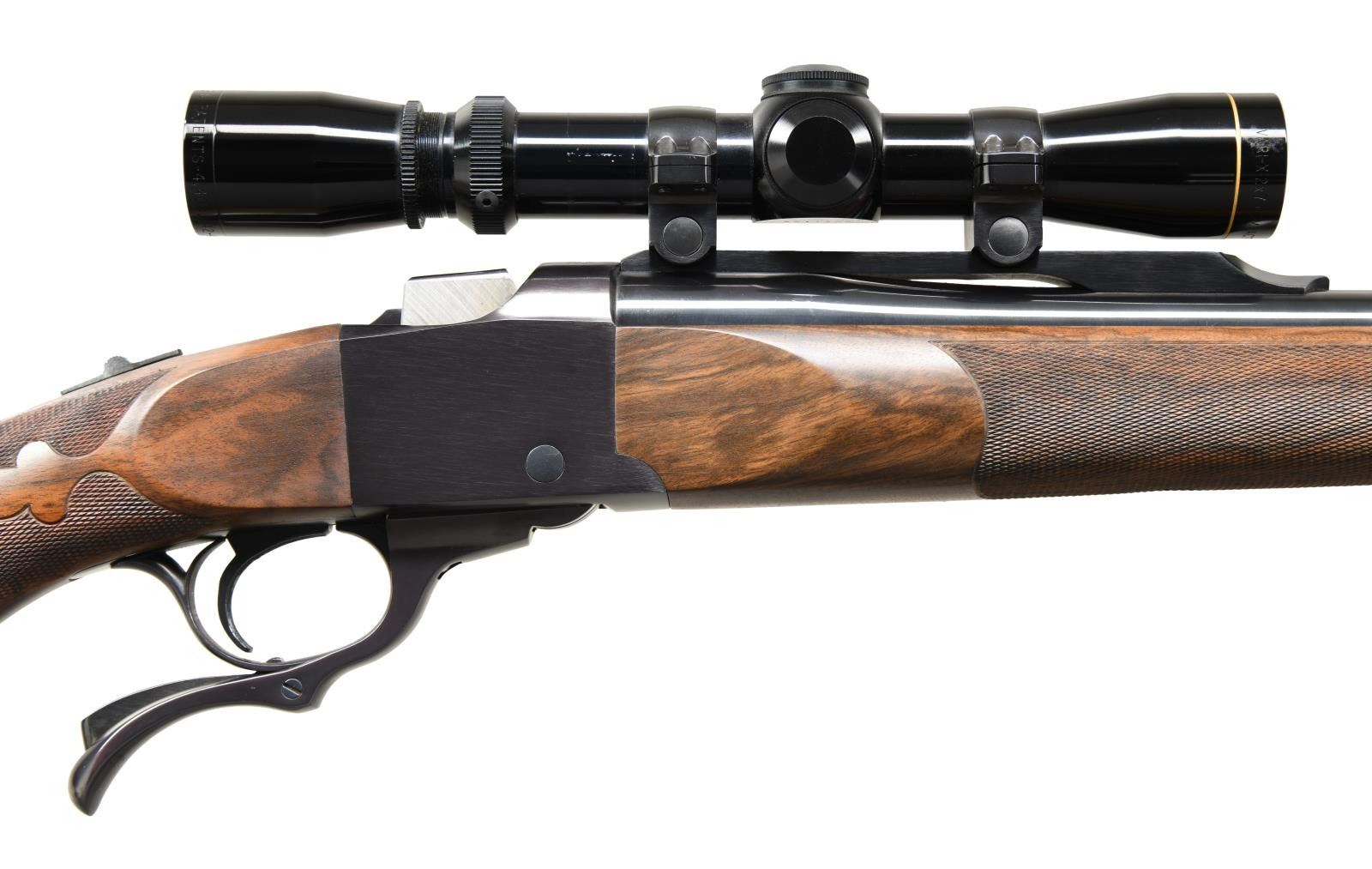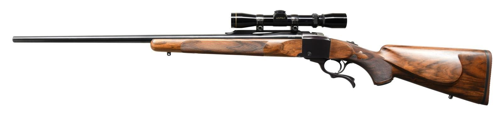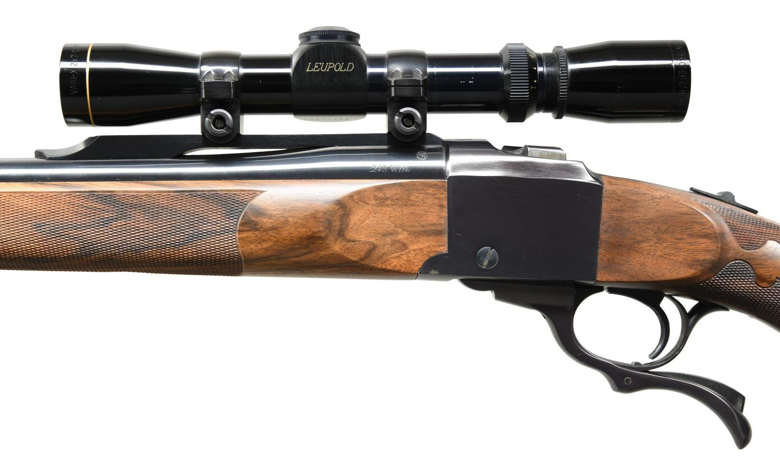 Cal. 243 Win. S# 130-05290. Bbl. 26" w/ factory quarter rib milled for Ruger rings holding Leupold gloss finished Vari-X Compact 2-7 power scope (S# S211700) w/ Duplex reticle. Mfg. 1974 prior to stamping of "warning marks" on bbl. (initiated 1978). Restocked w/ superbly figured Turkish walnut stock having straight comb, raised cheekpiece, hand rubbed oil finish, sling studs, solid brown Pachmayr basket weave patterned pad (13 1/2" LOP), exquisitely engraved grip cap having gold oak leafs & border plus very fine LPI checkering w/ Fleur-de-Lis accents (2 panels in grip area plus wrap around on forend) . Marvelous restocking by Clayton Nelson (per consignor). CONDITION: scope has light prior ring marks; all other aspects of rifle are near excellent including bore & optics. PROVENANCE: formerly of Thomas W. Connally Estate Collection. (23-5034/NW). MODERN. $1,300-1,900.