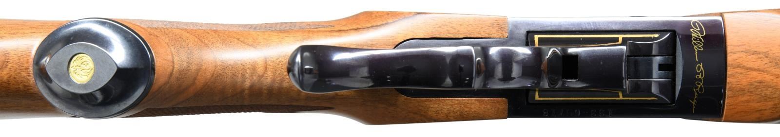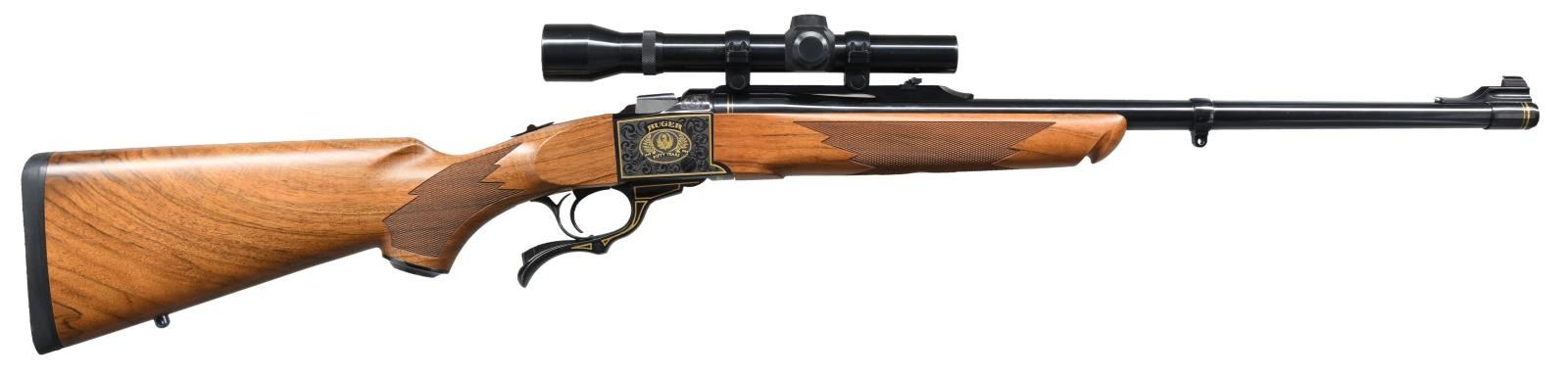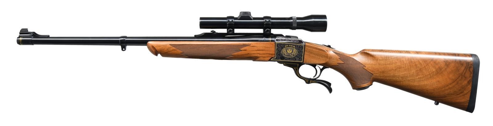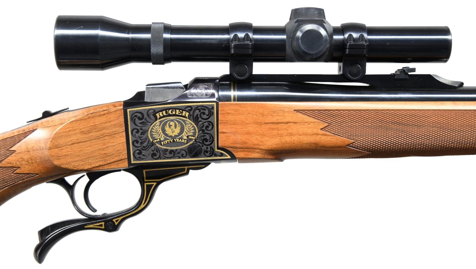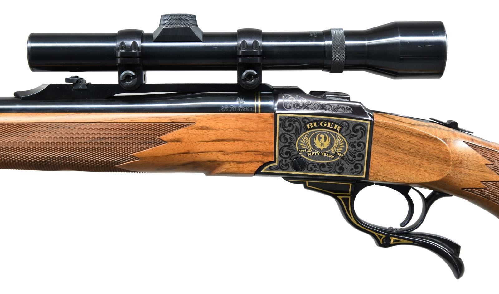 Cal. 45-70. S# 133-65718. Bbl. 22". Mfg. 1999 to commemorate Ruger's 50th anniversary . Ramped gold bead front sight. Folding rear sight. Weaver K2.5x scope mounted on Ruger rings w/ fine crosshair reticle & very good optics. Both sides of receiver has gold Ruger logo w/ gold wreaths & the years "1949-1999". Bottom of receiver has golden Bill Ruger signature. Nicely figured walnut stock w/ factory recoil pad. Alexander Henry forend. Bottom mounted sling studs. CONDITION: right side of butt has a few scratches, other aspects rate near excellent. PROVENANCE: From the Estate of Jon Thomas. (23-1669/MJC). MODERN. $1,000-1,500.
