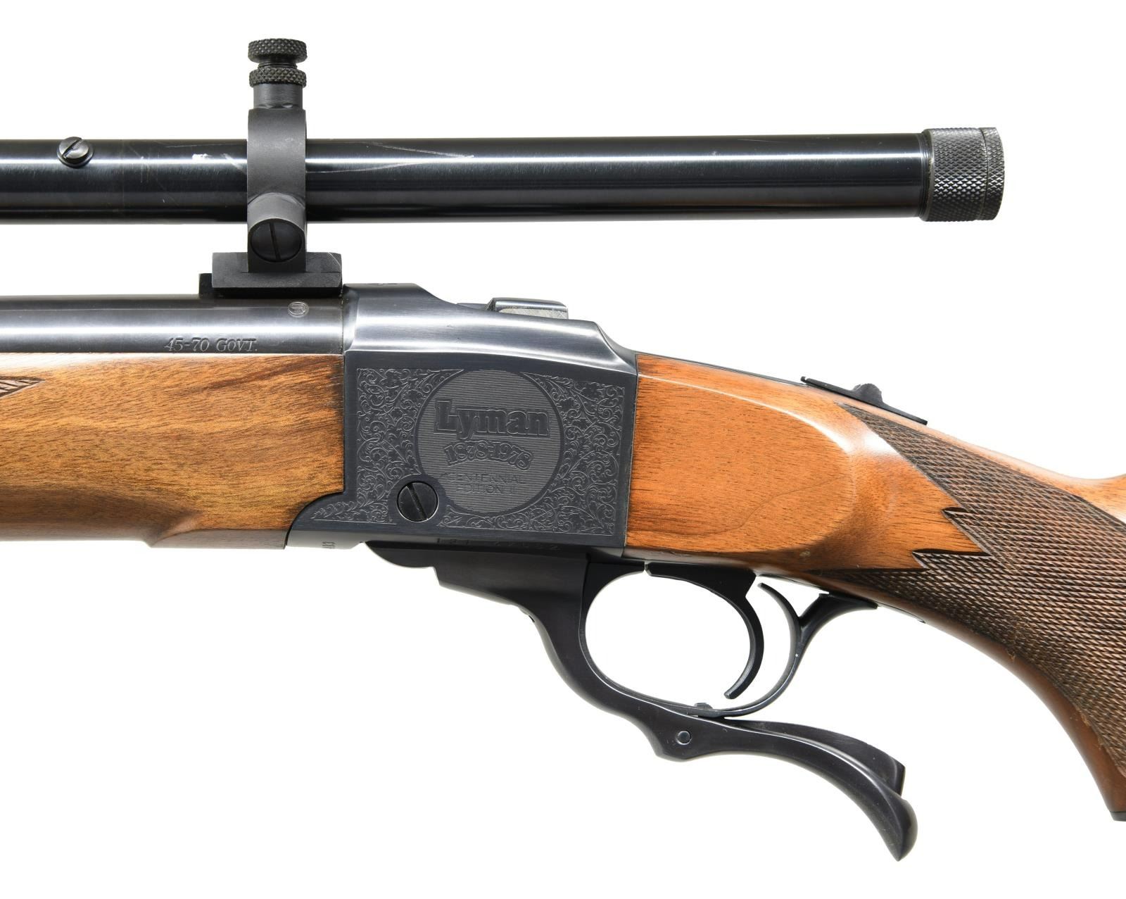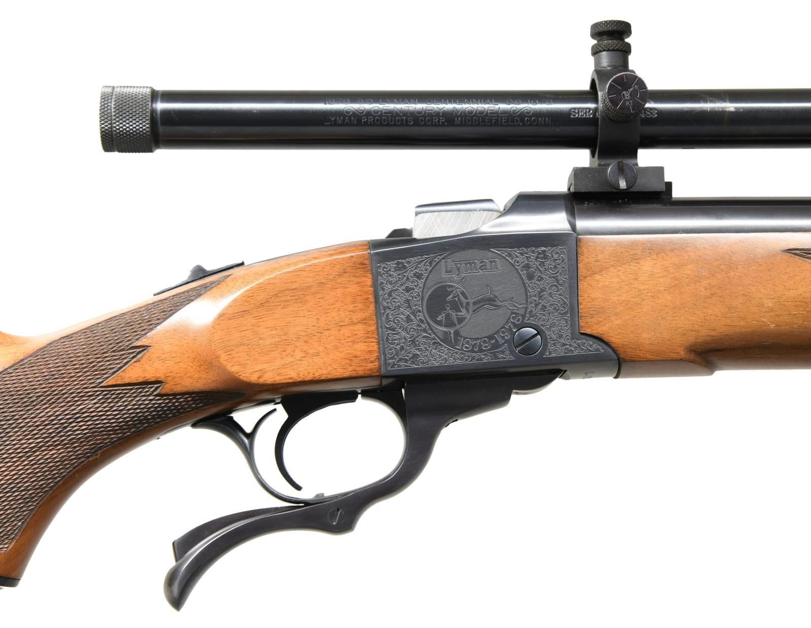 Cal. 45-70. S# 131-47682. Bbl. 28?. Lyman 4x power Century commemorative scope w/ fine crosshair reticle & very good optics. Scope caps also present. Mfg. 1978 to commemorate 100 years of Lyman products. Bottom of receiver has additional Lyman number ?L-78-0483?. Blue finish w/ receiver having floral engraving. Right side of receiver has running dear w/ ?1878-1978?. Left side of receiver has Lyman logo w/ ?1878-1978?. Checkered pistol grip walnut stock & Alexander Henry forend. Stock has bottom mounted sling studs & factory recoil pad. LOP: 13 ??. UNATTACHED ACCESSORIES: 48 1/2" length by 17 1/2" width wooden display case w/ bullet mold, Lyman Centennial Journal, medallion, factory paperwork, cleaning rod & three reloading die set. CONDITION: scope exhibits some scratches & a couple areas of finish loss. Stock set shows a couple dings & some scattered light handling marks. Metal retains 97% original blue. Bright near excellent bore. PROVENANCE: The Collection of Gun Sport Ltd. owned by Jon R. Thomas. (23-3686/MJC). MODERN. $1,000-2,000.