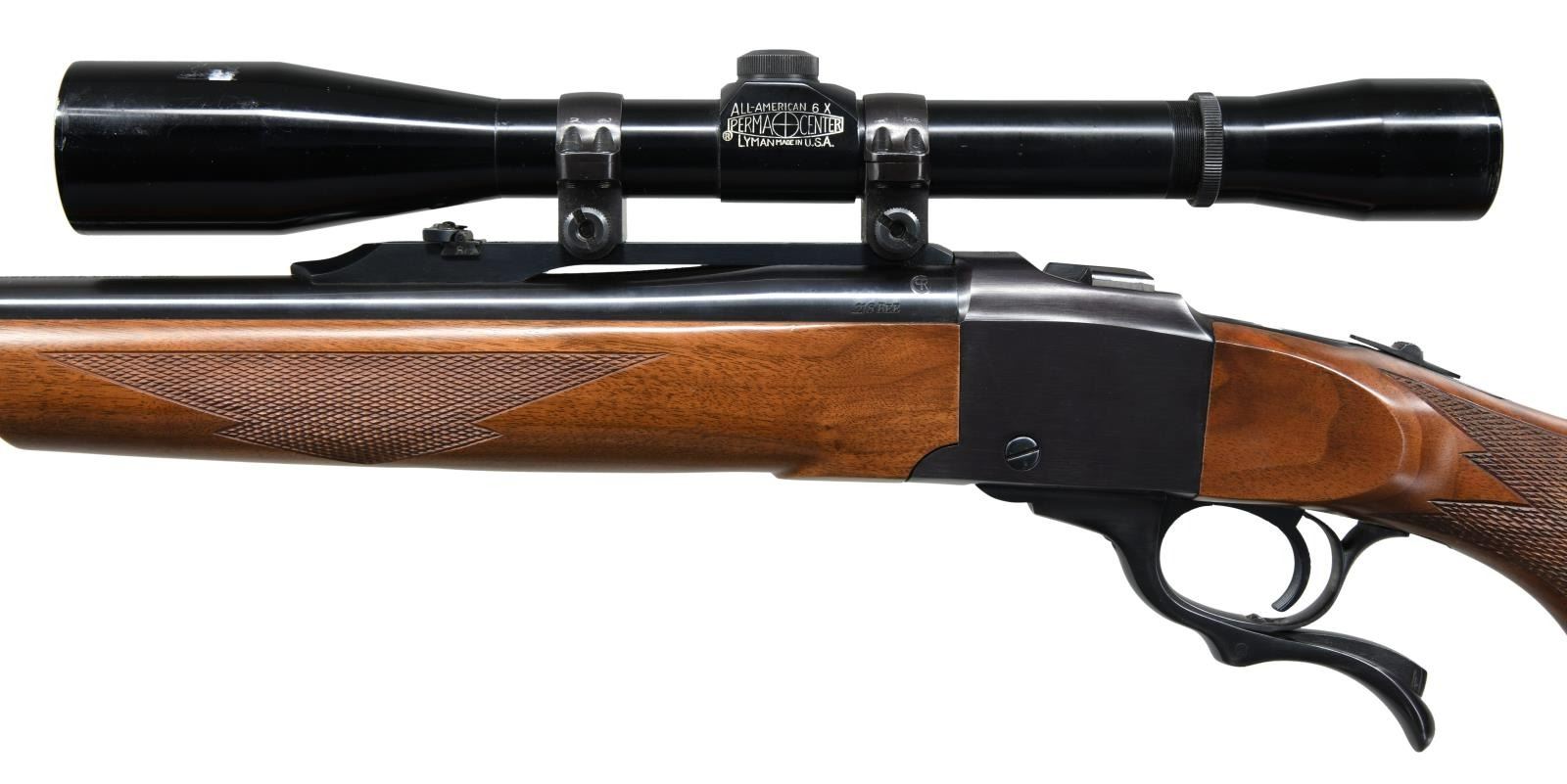Cal. 218 Bee. S# 133-11502. Bbl. 26". Mfg. 1993. Ramped gold bead front sight. Folding leaf rear sight. Lyman All American 6x power scope mounted on Ruger rings w/ fine crosshair reticle & green tinted optics. Checkered walnut pistol grip stock w/ factory recoil pad. Alexander Henry forend. Bottom mounted sling studs. CONDITION: all aspects near excellent. PROVENANCE: From the Estate of Jon Thomas. (23-1666/MJC). MODERN. $1,000-1,500.