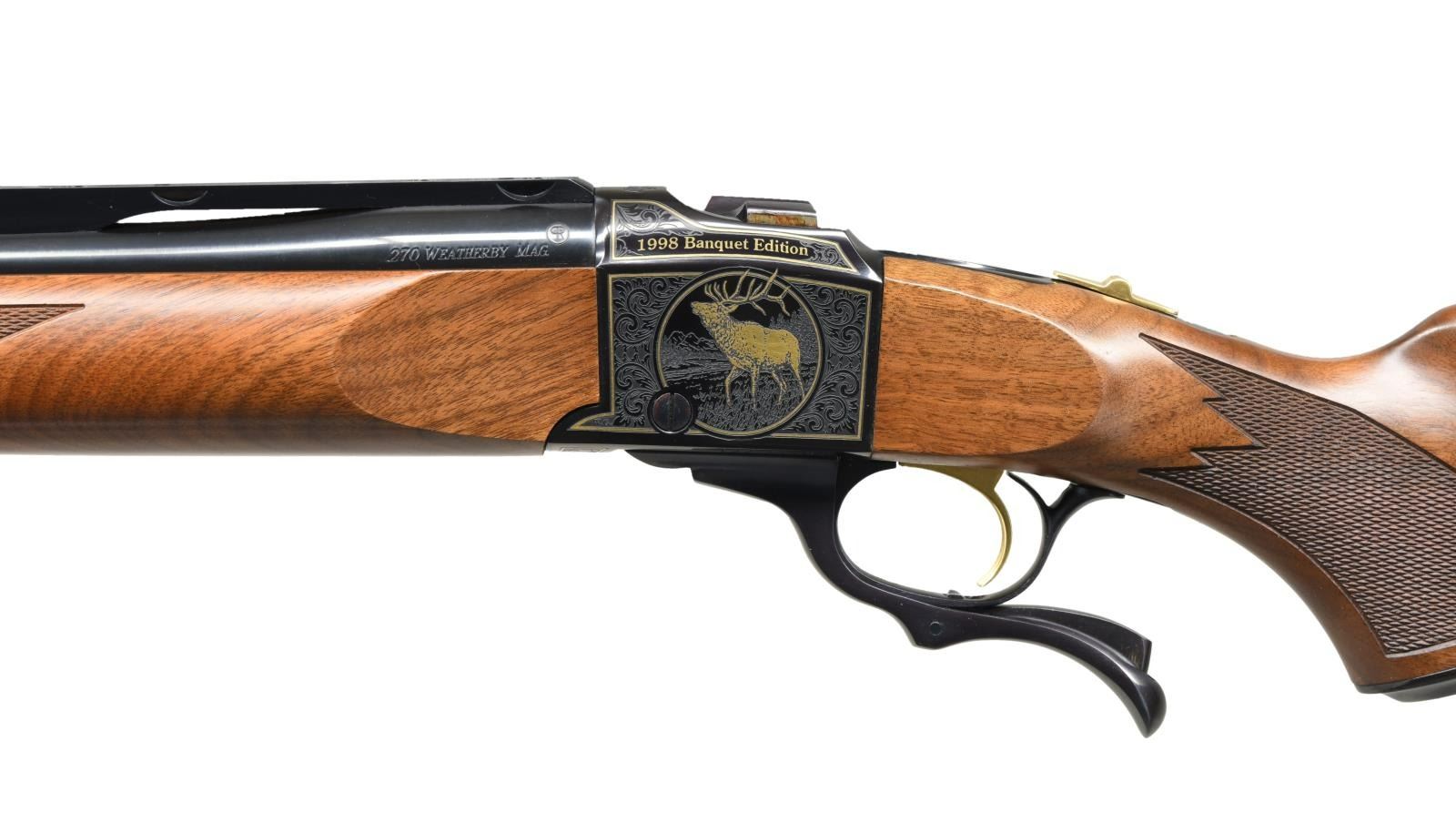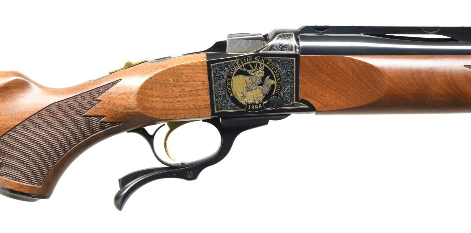SHOT RIFLE. Cal. 270 Wby Mag. S#133-45981. Bbl. 26". No sights fitted. Scope mount present. Number 114 of only 400 No. 1 rifles made for the Rocky Mountain Elk Foundation banquet in 1998. Receiver has gold elk scenes on both sides & floral engraving w/ gold borders. Blued finish w/ gold safety & trigger. Checkered walnut stock & forend w/ factory recoil pad. Bottom mounted sling studs. UNATTACHED ACCESSORIES: green Rocky Mountain Elk foundation case w/ keys. CONDITION: all aspects near excellent. (23-362/MJC). MODERN. $900-1400.