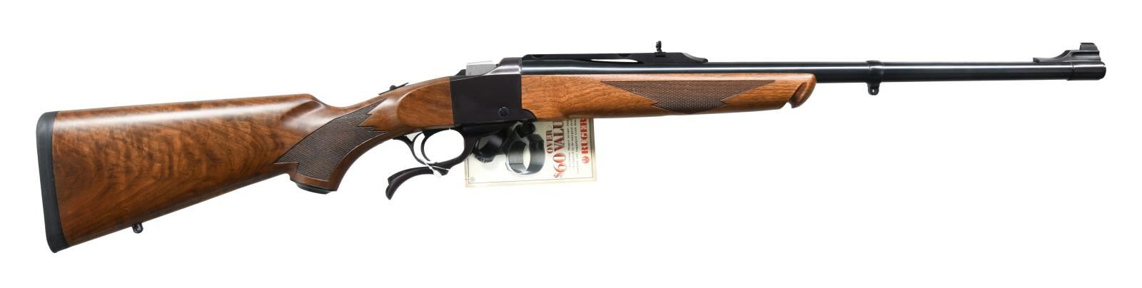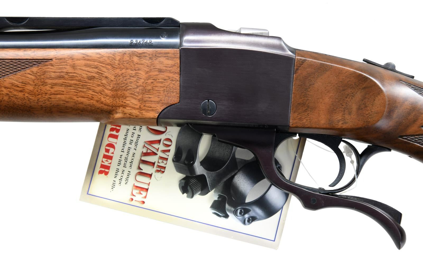 Cal. 9.3x74R. S# 134-23940. Bbl. 22". Mfg. 2008. Ramped gold bead front sight. Folding rear sight. Checkered walnut stock w/ factory recoil pad. Alexander Henry forend. Bottom mounted sling studs. Ruger ring hang tag present on trigger guard. CONDITION: all aspects near excellent. PROVENANCE: From the Estate of Jon Thomas. (23-1667/MJC). MODERN. $1,000-1,500.