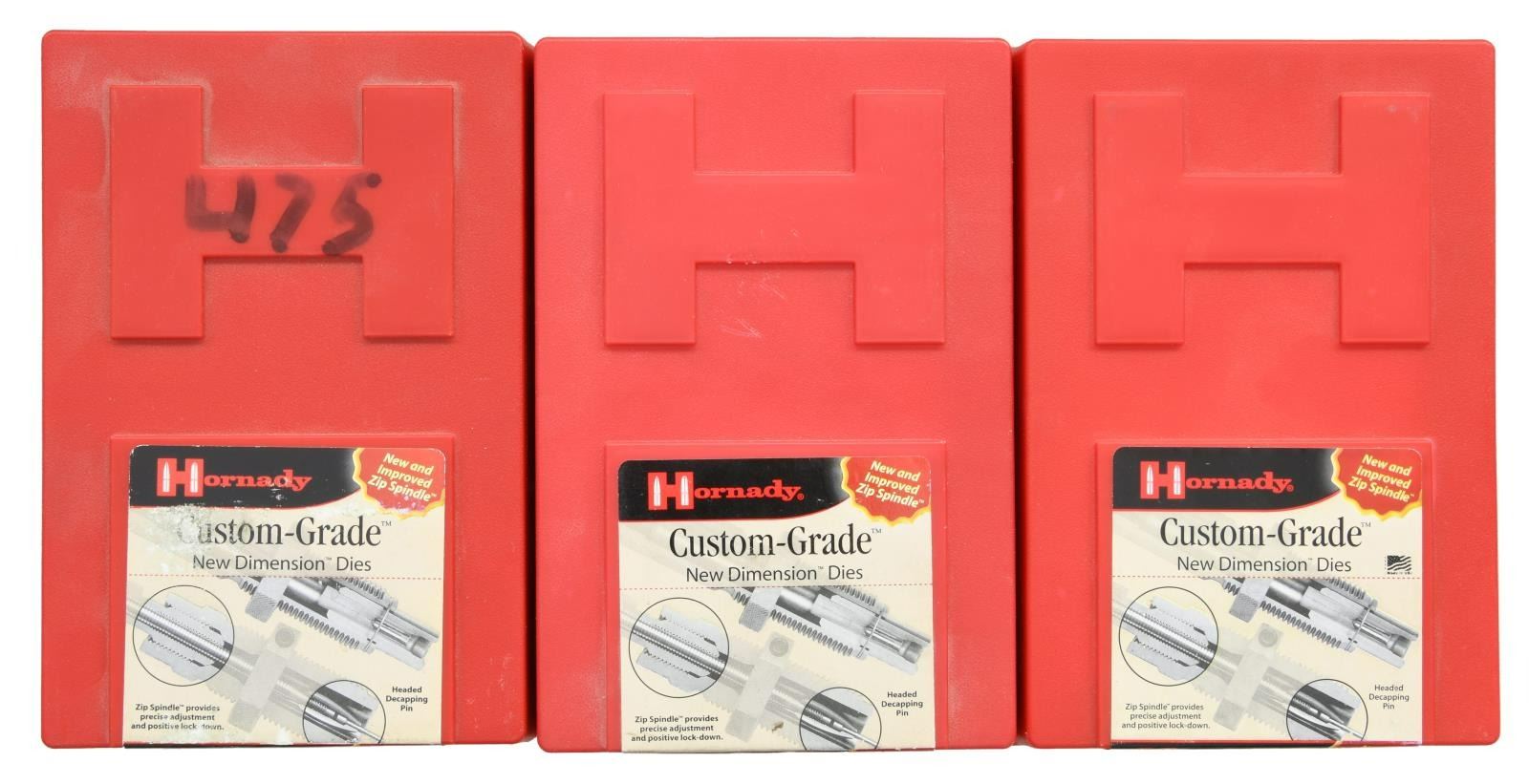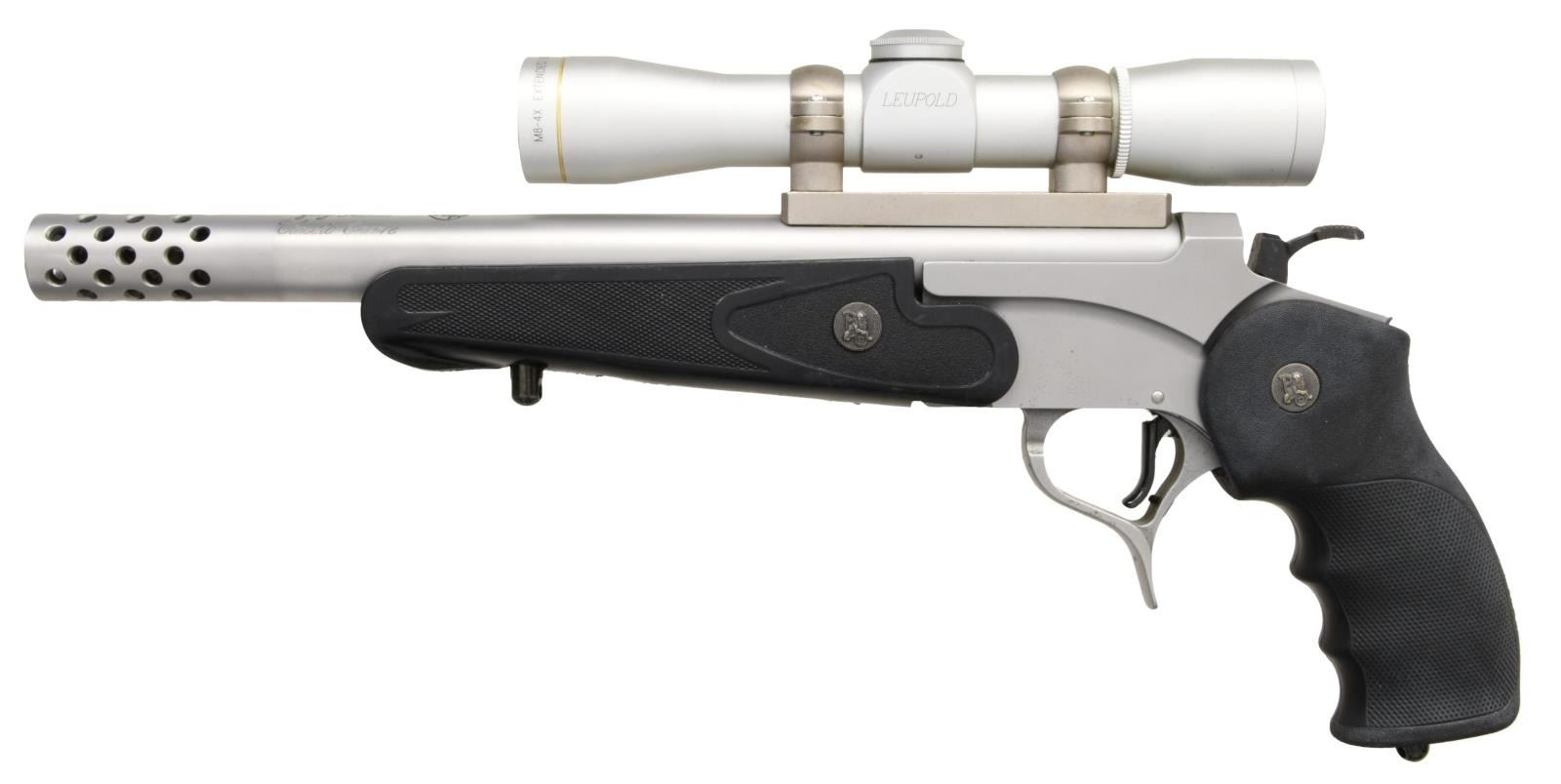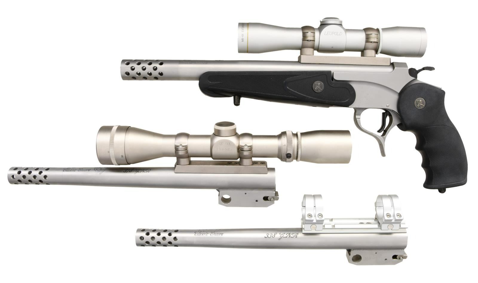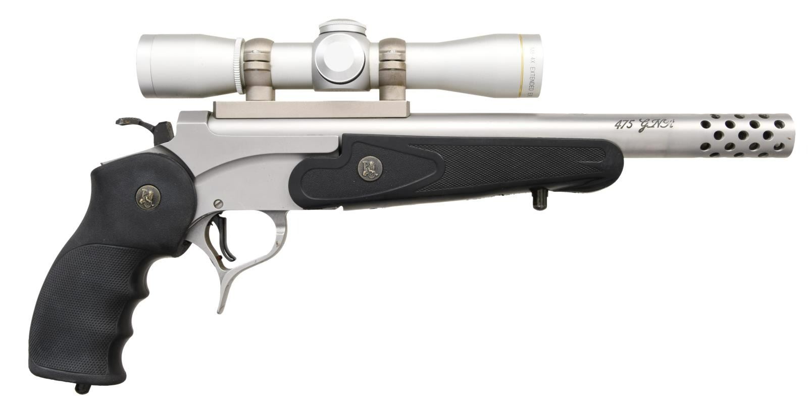 SHOT PISTOL WITH ADDITIONAL CONFIGURATION BARRELS & RELOADING DIES. Cal. 475 GNR. S# S141225. Bbl 12 1/8". Custom Thompson Center Encore single shot pistol by Gary Reeder. The barrel is marked "Gary Reeder/ Classic Encore" followed by a encircled portait of a bear, with the caliber designation "475 GNR" on the right. Receiver bears no markings with the exception of the serial number. Stainless steel finish with black checkered rubber Pachmayr grips. Barrel features an integral muzzle brake and is mounted with a Leupold M8-4X Extended E.R. scope. UNATTACHED ACCESSORIES: Gary Reeder custom .338 GNR barrel, Gary Reeder custom .378 GNR barrel mounted with a 3x-9x Burris scope, .338 GNR, .378 GNR, and .475 GNR reloading dies, 50 unprimed .310-8mm GNR brass casings, as well as 50 unprimed .475 GNR cartridges. CONDITION: metal components exhibit some mild superficial marks from handling and storage, with some areas of light oxidation on sides and underside of the receiver, as well as on the lever. Mirror bore, exhibiting well defined rifling throughout. Pachmayr furniture shows some minor marks from handling and storage, but is otherwise very good overall. Scope retains a clear and sharp optic. Additional barrel exhibits some mild superficial marks from handling and storage, and retain mirror bores with well defined rifling throughout. .378 GNR barrel's Burris scope retains a clear and sharp optic. A nice Encore pistol, with desirable accessories. (23-2528/MLW). MODERN. $1,500-2,250.