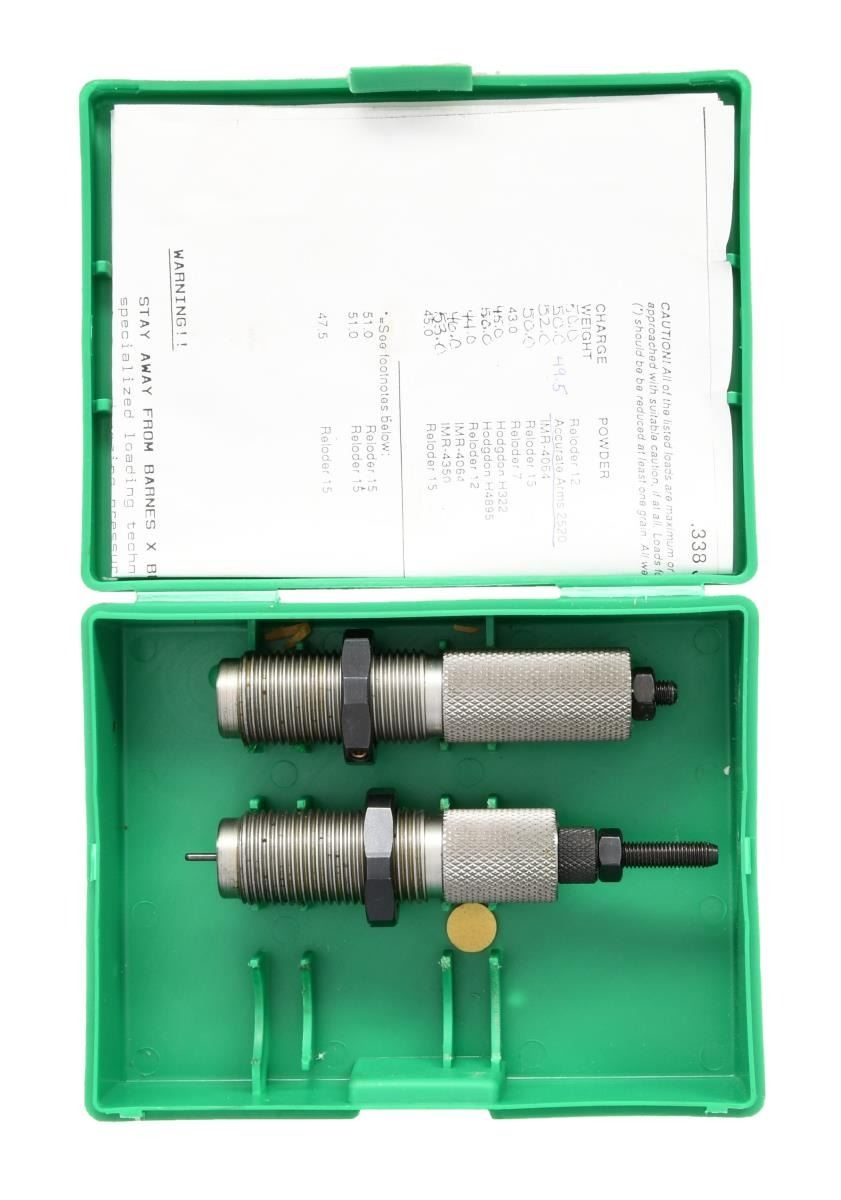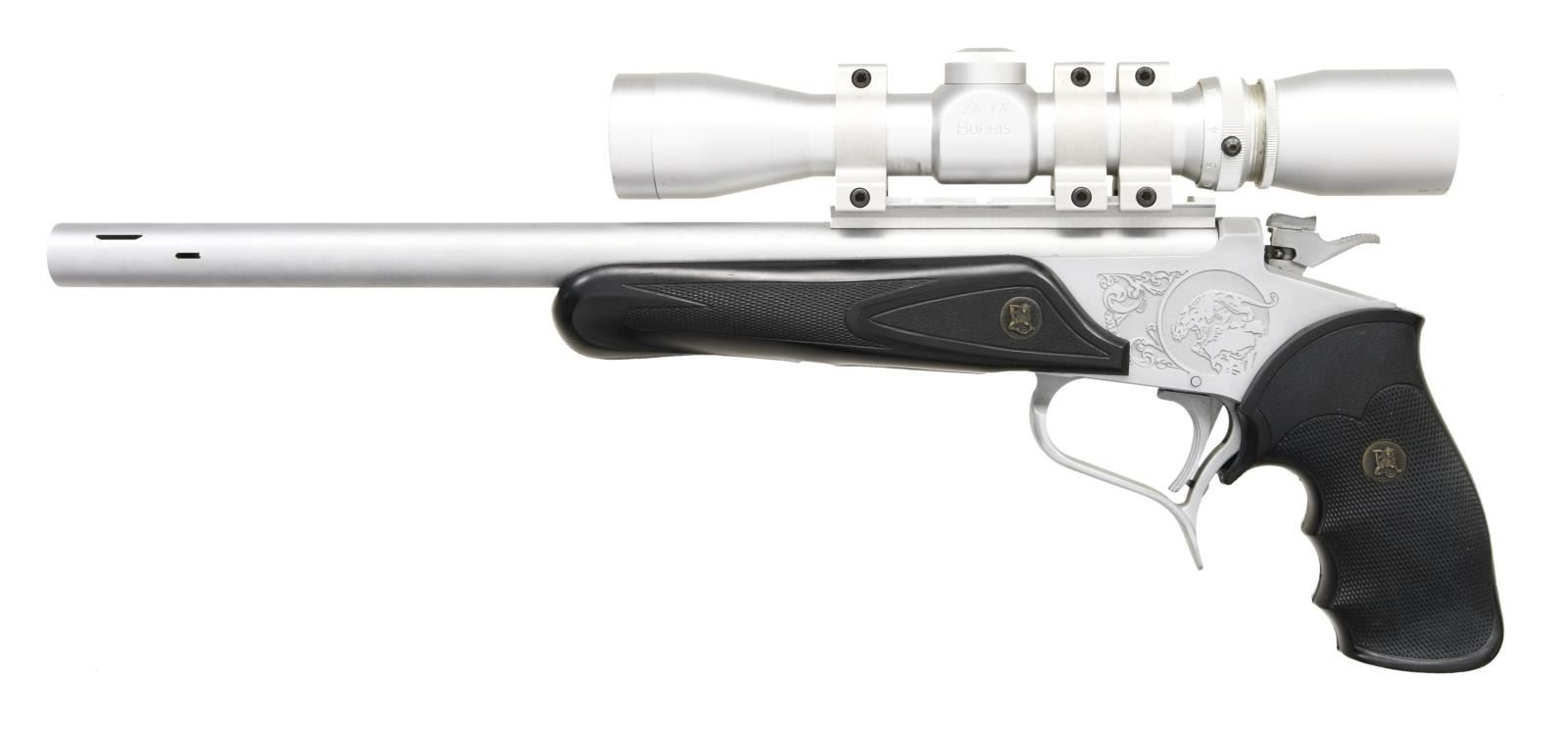 CUSTOM SSK .338 JDJ BARREL & RELOADING DIES. Cal. 338 JDJ. S# 383607. Bbl 14". Contender single shot pistol manufactured by Thompson Center Arms and fitted with a custom SSK .338 JDJ barrel. Left side of barrel is marked "S S K 338 JDJ #2" on the left side. Left and right sides of frame exhibit a relief laser engraved scene of a mountain lion. Stainless steel finish with checkered black rubber Pachmayr grip and forend. Barrel is fitted with an aluminum picatinny rail that features a 3 ring mounted 2x-7x Burris scope. UNATTACHED ACCESSORIES: set of .338 JDJ caliber reloading dies. CONDITION: metal components show some scattered superficial handling marks, but are otherwise very good. Mirror bore, exhibiting well defined rifling throughout. Pachmayr furniture shows some mild marks from handling and storage, but otherwise is very good overall. Scope retains a clear and sharp image. (23-2529/MLW). MODERN. $900-1,300.