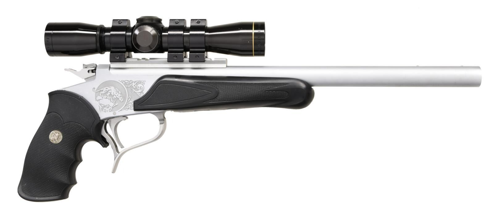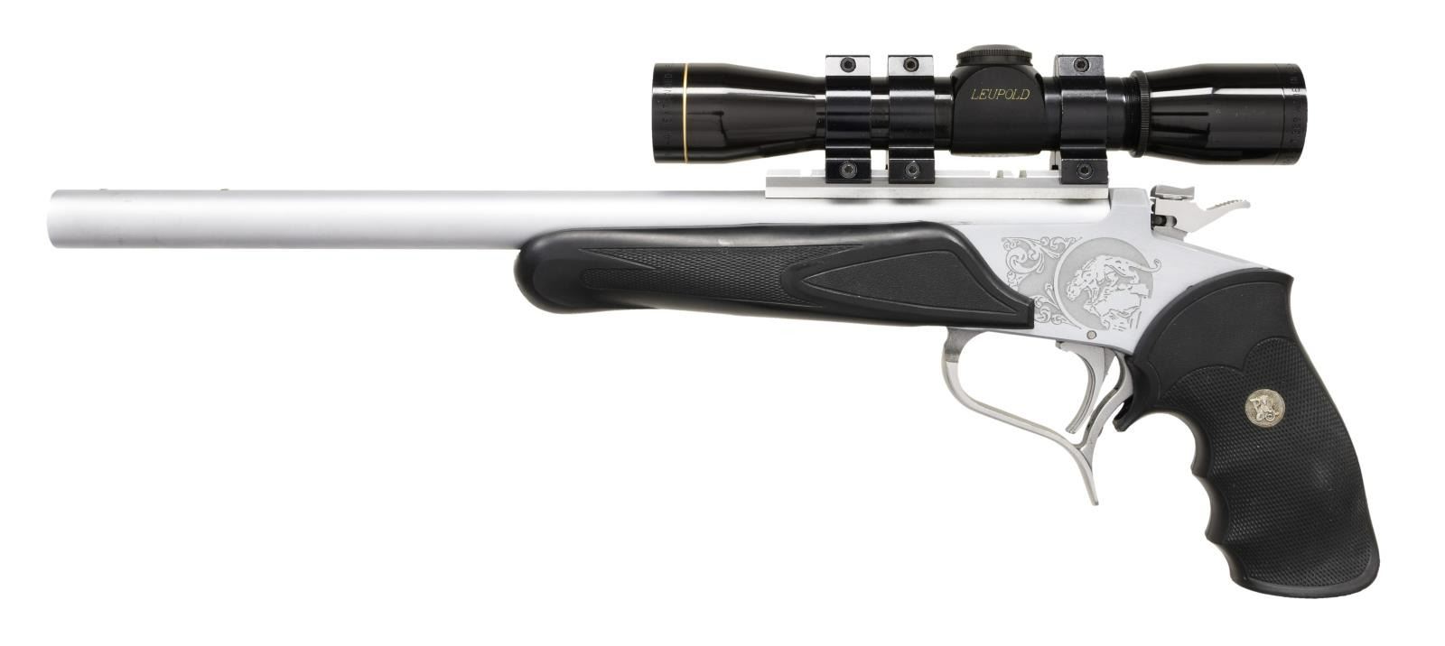 .411 JDJ BARREL & RELOADING DIES. Cal. 411 JDJ. S# 171662. Bbl 14". Contender single shot pistol manufactured by Thompson Center Arms. Barrel is stamped "411 JDJ" on the left side of the lug. Engraved scene of a mountain lion on either side of the receiver. Stainless steel finish with Pachmayr checkered black rubber grip. SSK industries picatinny rail mounted with a Leupold M8-4X Extended E.R. scope. UNATTACHED ACCESSORIES: set of 411 JDJ reloading dies. CONDITION: very good overall, with metal components exhibiting some superficial handling marks. Mirror bore exhibiting well defined rifling throughout. Pachmayr furniture shows some mild handling marks, but is otherwise very good overall. Scope retains a clear and sharp optic. (23-2530/MLW). MODERN. $900-1,300.