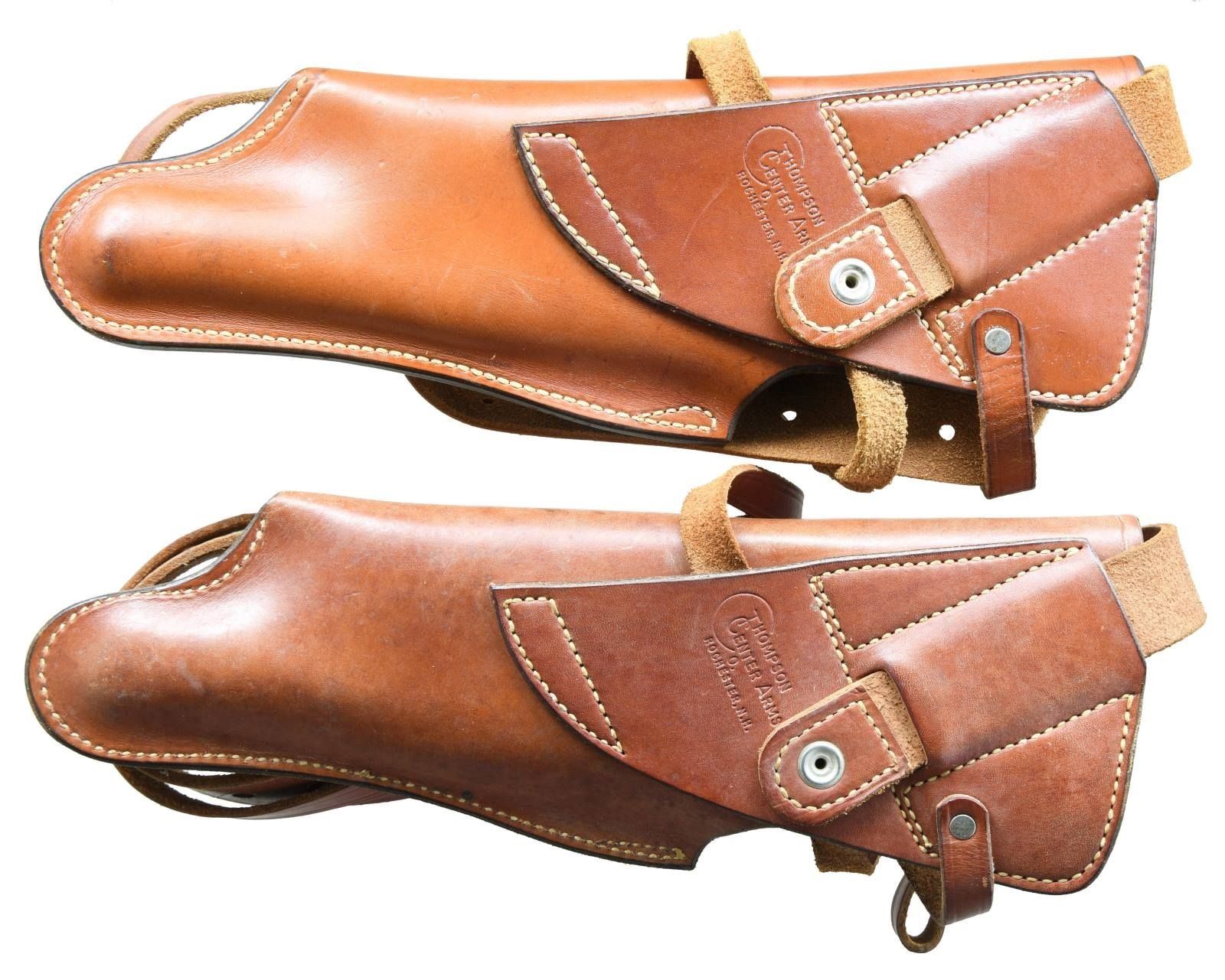 DESIRABLE ASSORTMENT OF ACCESSORIES. Cal. 22 WMRF. S# 399722. Bbl 10". Contender single shot pistol manufactured by Thompson Center. Left side of barrel is marked with the manufacturer information, followed by the caliber designation. Engraved scene of a mountain lion on left and right of frame. Metal components exhibit a blued finish. 1 Piece wood stock with black rubber rear panel, and a smooth wood forend. UNATTACHED ACCESSORIES: box containing factory paperwork, 1 .44 Magnum barrel, 1 .22 LR Match barrel (with box), 1 .45/410 GA barrel (with box), as well as .223 Remington barrel in its plastic packaging. Also includes 2 Thompson Center leather shoulder holsters for 10" bbls. Both holsters show light wear & handling marks, 1 has some mildew spots. CONDITION: very good overall, with metal components retaining the vast majority of their original factory blue finish. Mirror bore, exhibiting well defined rifling throughout. Wood furniture shows a few minor marks from storage and handling, but is otherwise fine. Boxes all show mild exterior wear and remain sturdy and serviceable. (23-4677/MLW). MODERN. $750-1,250.