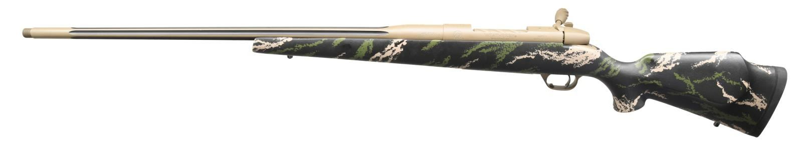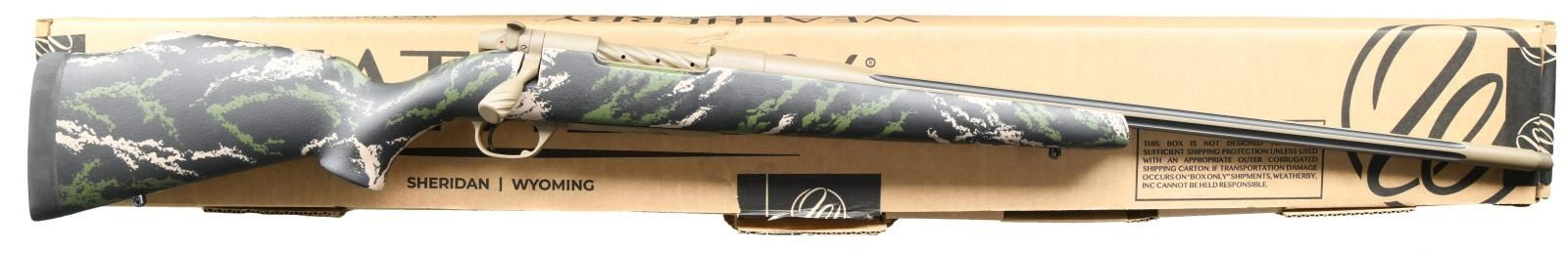 RIFLE WITH MATCHING FACTORY BOX & RANGE CERTIFICATION. Cal. 30-378 Wby Mag. S# WY018610. Bbl 26". Mark V Accumark manufactured the the Weatherby Custom Shop. The left side of the fluted 26" barrel is stamped with the caliber designation on the left side of the breech. The left side of the receiver is marked with the Weatherby trademark logo, followed by stampings stipulating Weatherby's manufacturer information, as well as the model. Custom Shop floorplate. Serial number is stamped across the right side of the chamber. Receiver is factory drilled and tapped with brass screws. Threaded muzzle brake. Metal components exhibit a coyote tan Cerakote finish, with the flutes of the barrel exhibiting a black Cerakote finish. Black synthetic stock with green and tan camoflauge. UNATTACHED ACCESSORIES: matching factory box containing factory paperwork, as well as the Weatherby Custom Shop Range Certification. CONDITION: near new, with metal components retaining virtually all of their original factory Cerakote finish. Brilliant mirror bore, exhibiting sharp and well defined rifling throughout. Stock is excellent. Box shows some tearing and mild exterior wear, but otherwise remains sturdy and serviceable. An extremely attractive Weatherby Custom Shop Mark V Accumark rifle. PROVENANCE: The Collection of Gun Sport Ltd. owned by Jon R. Thomas. (23-3443/MLW). MODERN. $3,250-4,000.