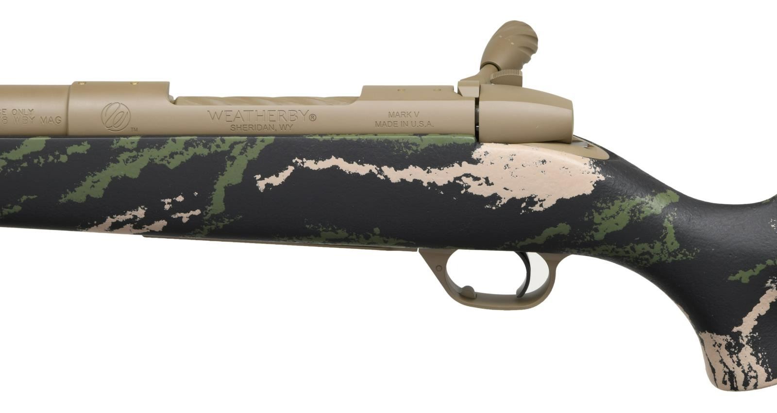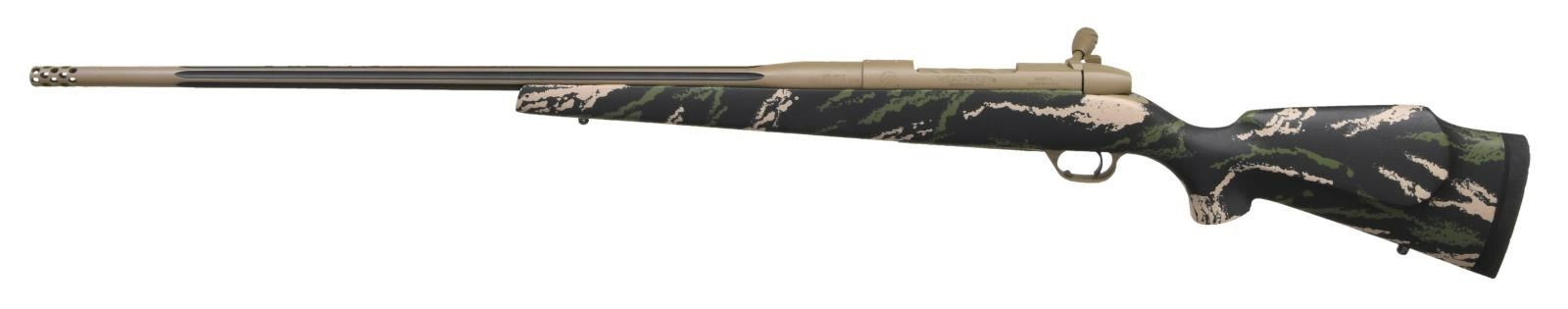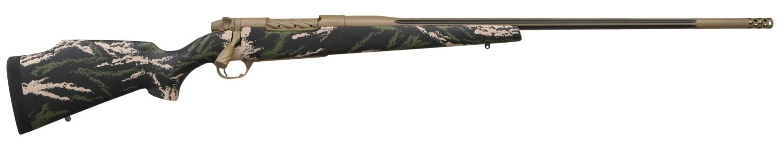 RIFLE. Cal. 338-378 Wby Mag. S# WY017065. Bbl. 28" fluted w/ integral muzzle brake. Receiver factory drilled & tapped for scope mounts. Gray parkerized finish. Turned down bolt w/ oversize handle. Floorplate has Weatherby Custom shop logo. Smoke & stone quarry synthetic stock w/ raised cheekpiece, bottom mounted sling studs & Decelerator recoil pad. LOP: 13 1/2". CONDITION: all aspects rate very good plus or better w/ some light flaking on bolt handle & dust staining on buttplate. PROVENANCE: The Collection of Gun Sport Ltd. owned by Jon R. Thomas. (23-3557/MJC). MODERN. $3,000-4,000.