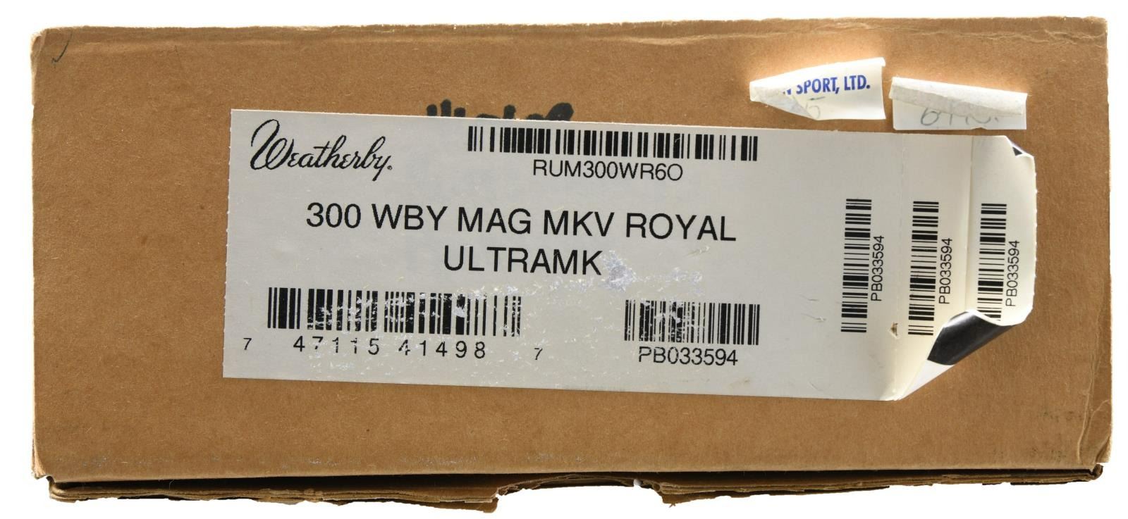 WITH MATCHING FACTORY BOX. Cal. 300 Wby Mag. S# PB033594. Bbl 26". Mark V Royal Ultramark bolt action rifle manufactured by Weatherby. The left side of the barrel is marked "USE ONLY/ 300 WBY MAG", with "MARK V" followed by Weatherby's manufacturer information, and "MADE IN U.S.A." on the left side of the receiver. Receiver and bolt sleeve feature gold bordered Grade III scroll engraved panels. Floorplate features matching gold bordering and scroll engraving, along with a scene of a gold inlaid elk. Barrel exhibits a gold and a nickel band at the breech and muzzle. Damascened bolt body and follower. Exhibition grade walnut stock featuring a Monte Carlo buttstock pistol grip butt and fine checkered panels at the wrist and forearm. UNATTACHED ACCESSORIES: matching factory box containing its styrofoam insert. CONDITION: near new, with metal components retaining virtually all of their original factory applied finishes overall. Brilliant mirror bore, exhibiting sharp and well defined rifling throughout. Stock is extremely fine, with a few minute marks from handling and storage. Box shows some exterior wear, but otherwise remains sturdy and serviceable. An extremely attractive variation of the Weatherby Mark V rifle. PROVENANCE: The Collection of Gun Sport Ltd. owned by Jon R. Thomas. (23-3815/MLW). MODERN. $3,000-4,000.