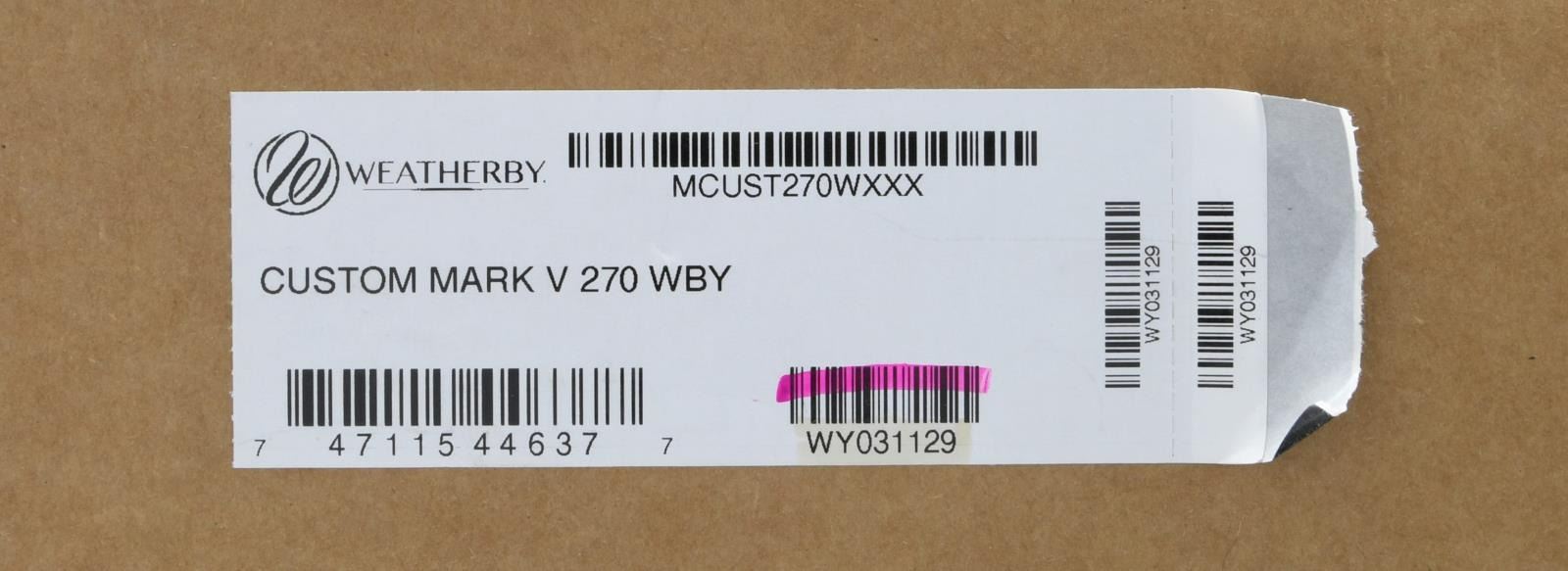 ACTION RIFLE. Cal. 270 Wby. S# WY031129. Factory sealed Weatherby Custom Mark V bolt action rifle of unknown bbl. length. Item number: MCUST270WXXX. CONDITION: new in box. PROVENANCE: The Collection of Gun Sport Ltd. owned by Jon R. Thomas. (23-3349/MJC). MODERN. $1,500-2,250.