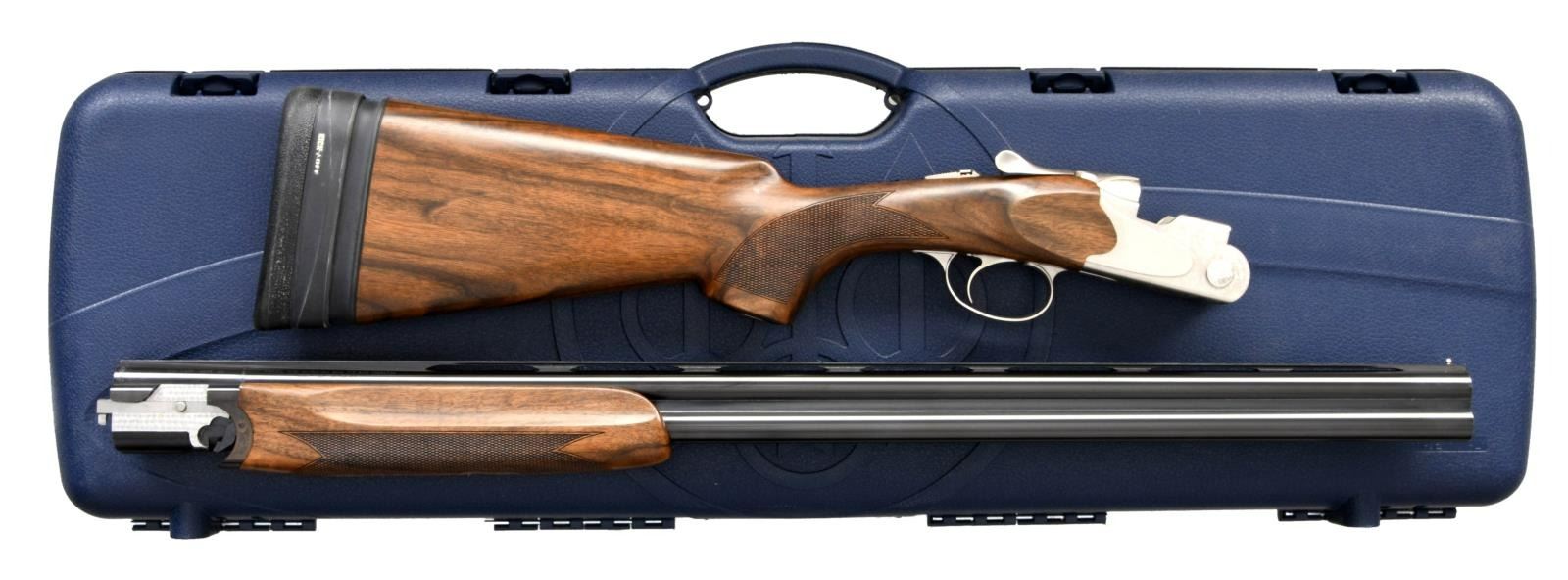 Cal. 20 Ga., 3". S# N57999S (CF = 2010). Excelsior Steel 28" VR bbls. w/ bright front bead. Optima-Bore HP chokes tubes; full set of 5 included. Satin silver alloy finish receiver w/ laser engraving. Boxlock action w/ removedable titanium SST group, & ejectors. Satin finished checkered walnut forearm & pistol grip stock. Patented Q-Stock quick takedown system. LOP: 14 3/4" to Beretta Kick-Off recoil system. DAC: 1 3/8". DAH: 1 7/8". WEIGHT: 6.3 LBS. UNATTACHED ACCESSORIES: Beretta blue molded case containing choke tubes, choke wrench, paperwork envelope, sling swivels & stock screwdriver. CONDITION: near excellent wood & metal finish showing minor handling marks. Bright shiny bores. Ejectors appear in time. (23-1288/MD). MODERN. $1,500-2,250