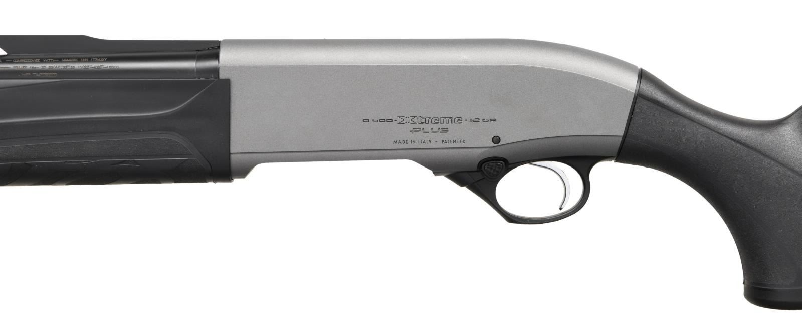 SHOTGUN. Cal. 12 GA, 2 3/4", 3", 3 1/2". S# MA027039. Bbl 28". A400 Xtreme Plus semi-automatic shotgun manufactured by Beretta in Italy and imported by Beretta USA Corp. Barrel markings exhibit a factory error and have been stamped twice. Standard markings on left and right sides of receiver. Matte gray anodized receiver with blued barrel. Black polymer Kick Off recoil reduction buttstock, with black polymer forend. High matte vent rib with red fiber optic front sight and removable Modified choke. CONDITION: extremely fine, with metal components retaining virtually all of their original factory applied finishes, exhibiting few light superficial marks from handling and storage. Mirror bore. Black polymer furniture is excellent overall. PROVENANCE: The Collection of Gun Sport Ltd. owned by Jon R. Thomas. (23-3823/MLW). MODERN. $1,000-1,500.