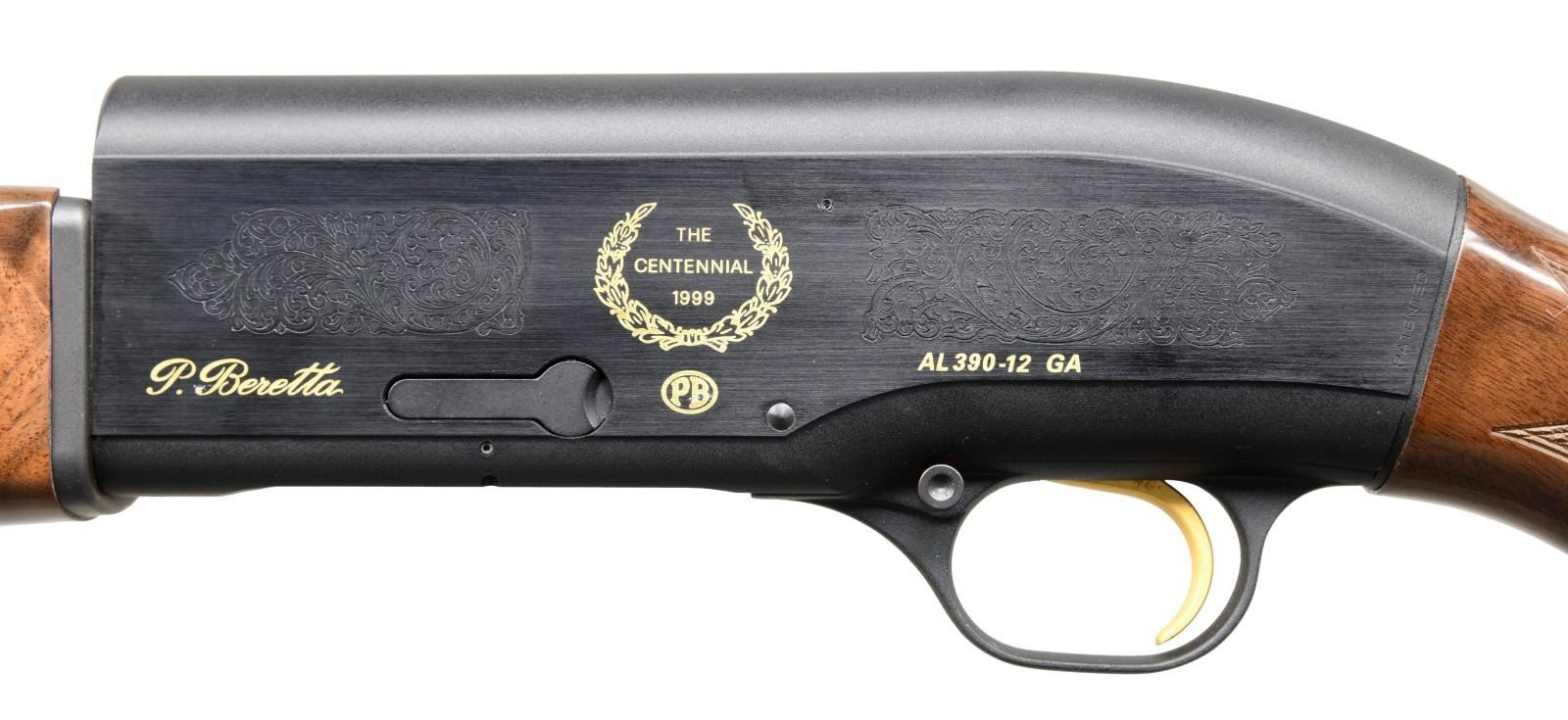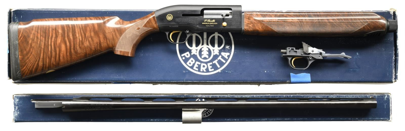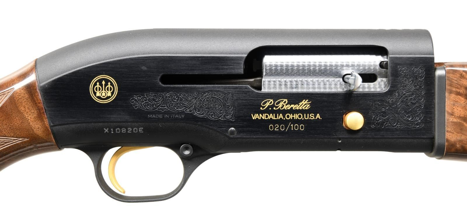 FOR THE 1999 GRAND CENTENNIAL IN VANDALIA, OHIO. Cal. 12 Ga., 3". S# X10820E (BM = 1999). The 30" VR bbl. has white bead front sight & bright mid bead. Comes w/ 4 Mobil choke tubes: Full, IM, Mod, & IC. Action has gold plated Centennial markings & logo along side laser scroll engraving. Gloss finished checkered forearm & pistol grip Monte Carlo stock w/ gold plate on toeline. LOP: 15" to Beretta black pad. UNATTACHED ACCESSORIES: matching numbered box for action & bbl. Extra trigger assembly. CONDITION: shotgun appears unfired w/ near excellent blue & wood finish. While bbl. light a few wear spots, it appears never fully assembled & cycled. (23-1694/MD). MODERN. $1,200-1,800.