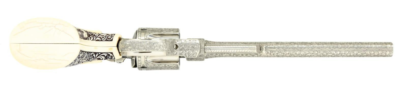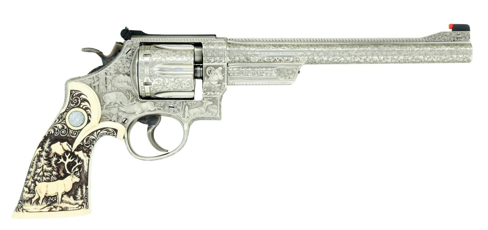 HIGHLY EMBELLISHED SMITH & WESSON PRE MODEL 27 REVOLVER. Cal. 357 Magnum. S#. S 84079. "The Shooting Linds", Ernie and Dot were a renowned husband & wife exhibition shooting team that carried on the tradition of the famed shooter's of previous times. Over their career they performed shooting demonstrations for the Winchester Repeating Arms Co,. Western Cartridge Co., Metro-Goldyn-Mayer Motion Picture Co. and the U.S. Army. This stunning work of art is a Smith & Wesson pre-27 post WWII 357 revolver. Bbl. 8 3/8" with checkered rib and shrouded ejector. Red ramp front sight with white outline adjustable target rear. Case colored target hammer and target trigger. Exhibition quality full coverage engraving and coin finish. The right side plate features a forest scene with 2 fighting bull elk. Additionally the right side shows a whitetail buck and a big horn sheep portrait. Left side scene features a charging grizzly and bobcat portrait. The crane display a pronghorn antelope portrait. The balance of the bbl., frame and flat portion of the 6 shot fluted cylinder are covered with masterfully executed vine type scroll. The 2 piece ivory target grips have silver S&W medallions. The outstanding scrimshaw features a woodland mountain scene with a double shovel bull caribou on the right panel. This scene is bordered by vine type foliate scroll that continues to the entire right panel and is accentuated by dark brown backgrounds. The back of the right panel is pencil marked "Grips made by Ernie Lind". UNATTACHED ACCESORIES: An 8x11 black & white photo, dated 3-1-1957, shows Dot Lind holding the revolver upside down over her shoulder and aiming with a mirror. A smaller 5x4 photo shows 8 embellished handguns including this one. The caption on the back reads "some of the Ernie Lind collection. All Sold." A brochure titled 'GUNTHUNDER HILL" promotes the Lind's famous shooting act. Also included is a copy of Ernie's 'The Complete Book of Trick & Fancy Shooting". Also included is a Don Mundell Smith & Wesson letter dated July 14, 2023 detailing the history of the 357 Magnum revolver, noting "The invoice shows serial number S84079 was delivered to Mr. Miller, Sales Manager on August 30, 1951. It was through Jurek Brothers Inc., 53 School Street, Greenfield, Massachusetts. The invoice reads "FOR ERNEST LIND". The only details on the invoice indicates it shipped with a 8 3/8-inch barrel with a nickel finish. Fred Miller hand delivered this revolver to Ernie Lind at Gunthunder Hill in West Swanzey, New Hampshire. The engraving and the stocks were added sometime after S84079 left Smith & Wesson". Letter from Michael Helms of the Smith & Wesson Historical Foundation also confirms the information in the previous letter. Copied Invoice #WR26361 from Smith & Wesson dated Aug. 30, 1951 for this revolver. CONDITION: Near excellent, retaining almost all finish showing a slight cyl. drag line. The hammer & trigger retain 80% case colors. The ivory grips are in very good condition showing age related checking at the butt. The right panel has a small hairline crack at the top of the backstrap. Smooth mechanics. Bright near excellent bore. PROVENANCE: From the Estate of Jon Thomas. (23-4917/DS). CURIO. $15,000-20,000.