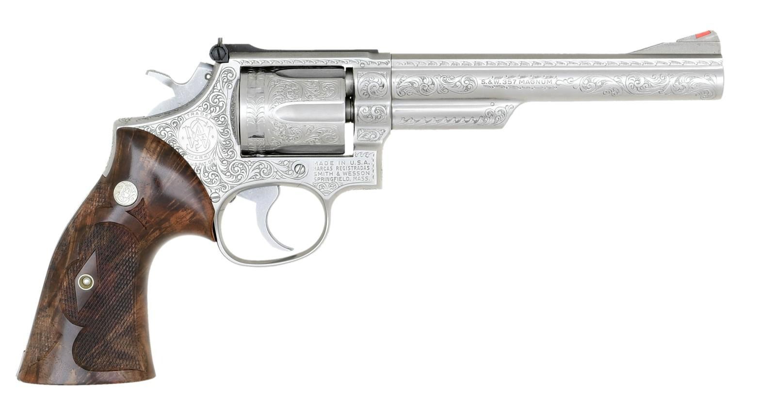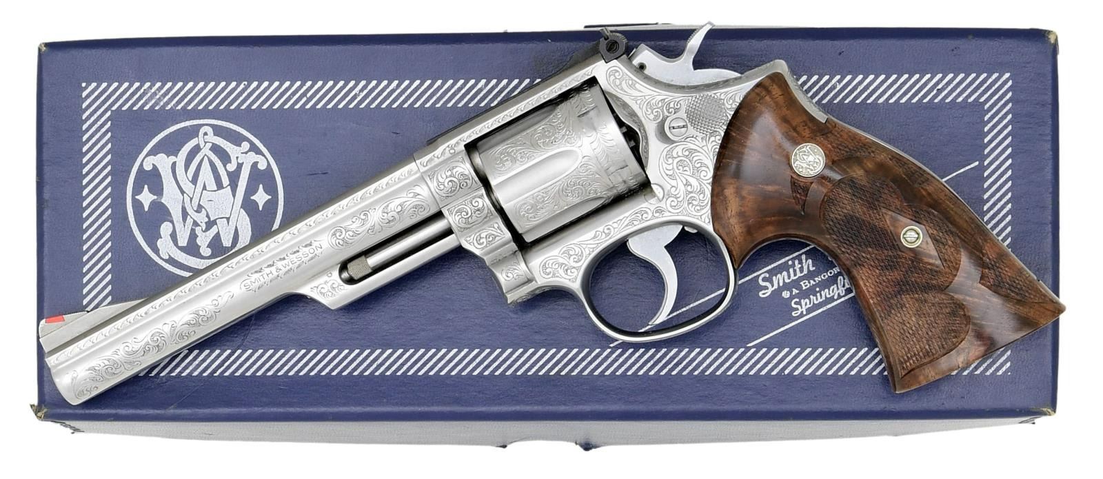 DOUBLE ACTION REVOLVER WITH MATCHING FACTORY BOX. Cal. 357 Mag. S# 35K0334. Bbl 6 1/8". Model 66 double action revolver manufactured by Smith & Wesson. The left side of the barrel is stamped "SMITH & WESSON", with the caliber designation stamped across the right. Right side of frame is marked with the S&W trademark logo, followed by Smith & Wesson's address. Frame and barrel exhibit scroll engraving on a punch dot background. Metal components exhibit a stainless steel finish, with the frame being mounted with 2 piece S&W silver medallion fancy checkered wood Roper style grips which were an added option available at the time for an additional fee. Red ramp front sight with adjustable square notch rear sight. UNATTACHED ACCESSORIES: matching factory box containing factory paperwork, cleaning brush, and screwdriver. CONDITION: excellent, with metal components exhibiting few superficial marks from handling and storage overall. Brilliant mirror bore, exhibiting well defined rifling throughout. Grips are excellent overall. Box show some minor exterior wear, but otherwise remains sturdy and serviceable. (23-2661/MLW). MODERN. $2,000-3,000.