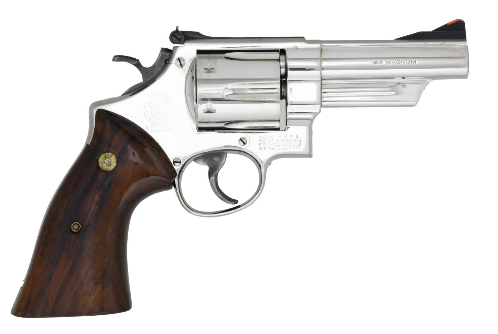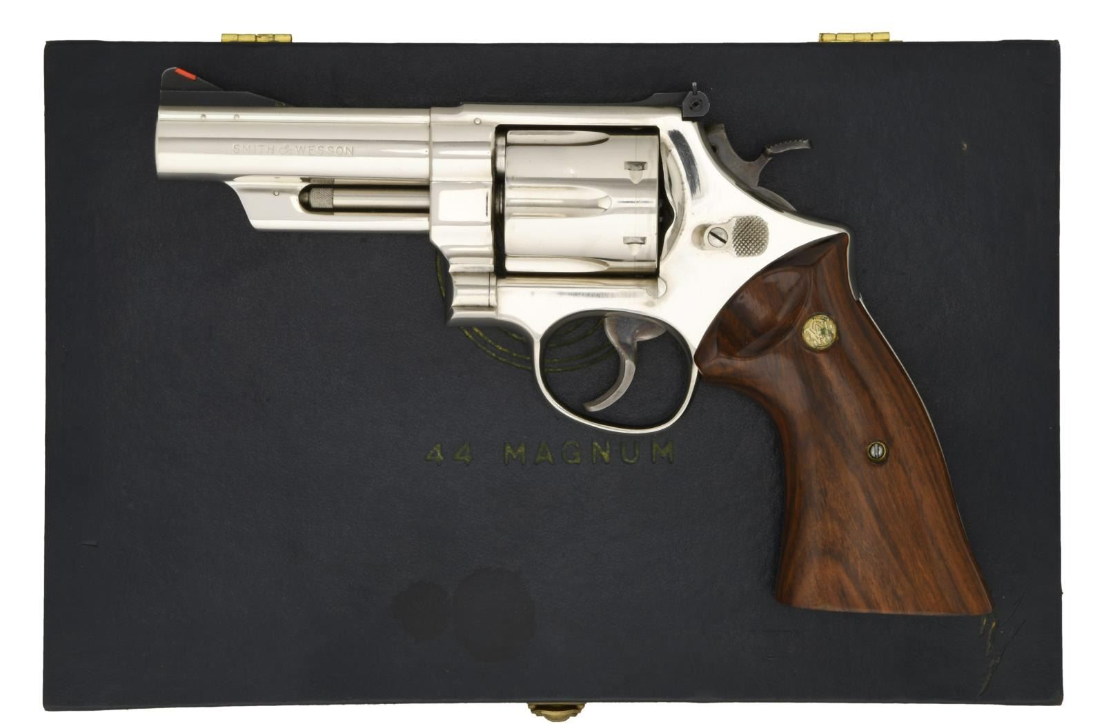 REVOLVER WITH 4" BARREL. Cal. 44 Magnum. S# S168521. Bbl. 4". Mfg. 1956-1957. Double action revolver built on 5-screw, square butt N frame. .500" checkered target hammer. .500" serrated target trigger. Red ramp insert front sight. White outline, micrometer click, adjustable rear sight. Shrouded extractor. Fluted, counter-bored, 6 shot cylinder. Nickel finish. 6 groove serrated front strap & backstrap. Matching numbers on frame, barrel, cylinder & extractor. Smooth wood grips w/ S&W medallions. UNATTACHED ACCESSORIES: Correct dark blue S&W case, blue satin lined w/ clasp latch. Original cleaning kit including knurled aluminum screwdriver, patches, brush & rod. CONDITION: renickeled finish 9-14-66 according to stamp on frame under grips is complete & consistent w/ some light signs of use visible under close inspection. A few tiny areas of flaking & staining. Butt is star marked without āNā for nickel. Thin drag line on cylinder. 1970s vintage smooth target grips in nice shape w/ a few light impressions and a small area of finish delamination on rear of right grip. Mainspring has been shaved & grips refinished. Timing appears to be correct. Bore is bright w/ strong rifling. (23-2128/JZ). CURIO. $2,500-3,500.