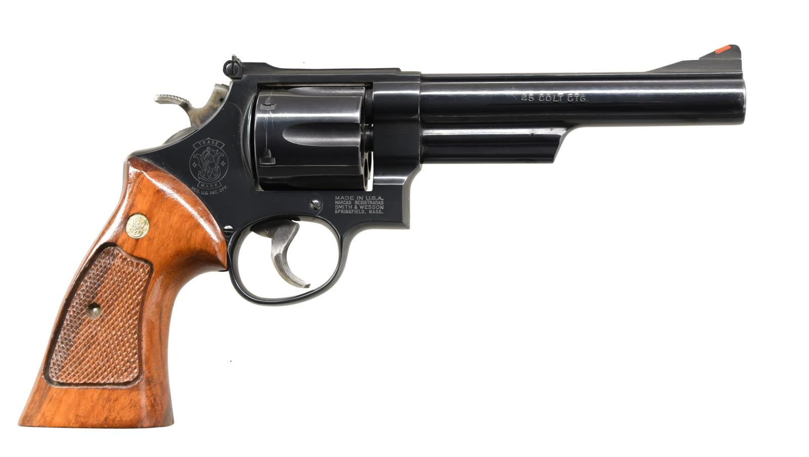 Cal. 45 Colt. S# BAR5075. Bbl. 6" pinned. Serrated ramp front sight w/ orange insert. White outline micrometer adjustable rear sight. Blue finish. Case colored target hammer & trigger. Checkered target grips w/ silver S&W medallions. CONDITION: right grip panel has a chip at front, grips otherwise show some dings & handling wear. Hammer & trigger show some fading to gray w/ light oxidation, operational wear & strong amounts of original case colors. Balance of metal retains 93% original blue w/ some edge wear, light handling wear & a drag line on cyl. Very good plus bright bore. (23-1886/MJC). MODERN. $600-1000.