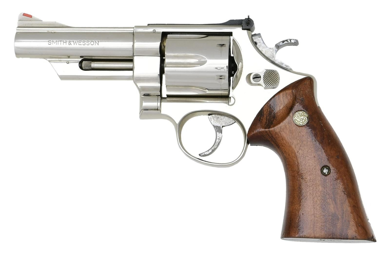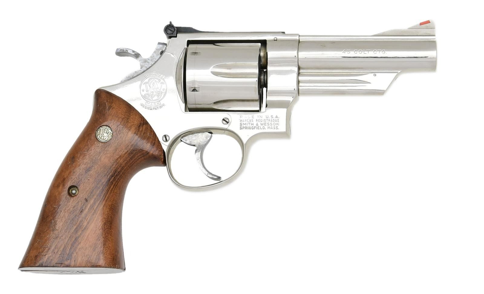 Cal. 45 Colt. S# N824052. Bbl. 4" pinned. Serrated ramp front sight w/ orange insert. Micrometer adjustable rear sight w/ white outline. Nickel finish. Bright nickel target hammer & trigger. Smooth target grips w/ silver S&W medallions. CONDITION: grips show some chipping on bottom, flaking, dings most notably on bottom & scattered handling wear. Hammer & trigger show some light oxidation staining. Balance of metal retains much original nickel w/ a drag line on cyl. & some handling wear. Very good bore. (23-2265/MJC). MODERN. $700-1000.