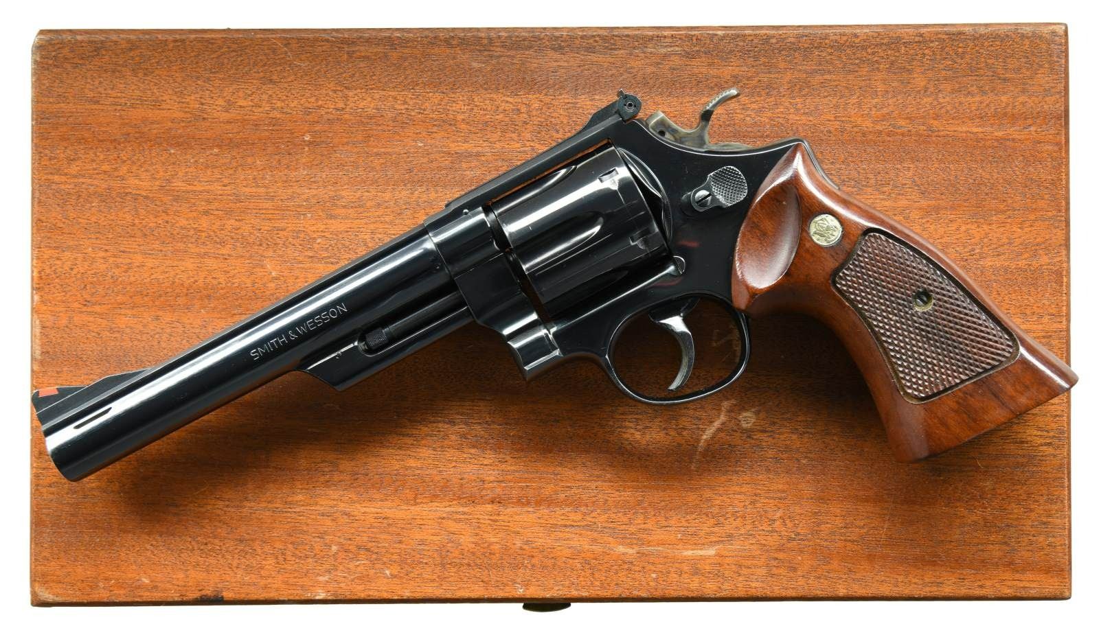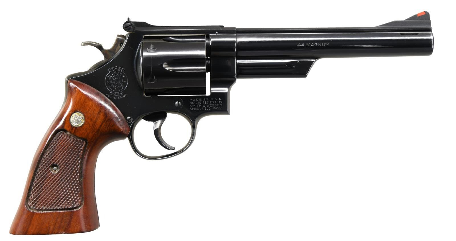 Cal. 44 Mag. S# N483547. Bbl. 6 1/2" pinned w/ Magna style ports. Serrated ramp front sight w/ orange insert. Micrometer adjustable rear sight w/ white outline. Blued finish. Case colored target hammer. Reblued target trigger. Hammer will occasionally hang up at half cock & may require attention. Target grips w/ silver S&W medallions. UNATTACHED ACCESSORIES: presentation case w/ cleaning rod, two bore brushes & S&W screwdriver. Exterior shows some scuffs & inside lining shows a few cracks. CONDITION: grips show some light handling wear. Hammer retains much of its original case colors w/ light operational wear. Trigger retains most of its reblue finish w/ some pitting underneath. Balance of metal retains 95% original blue w/ a drag line on cyl. & some handling wear. Bright very good plus bore. (22-2284/MJC). MODERN. $1000-1500.