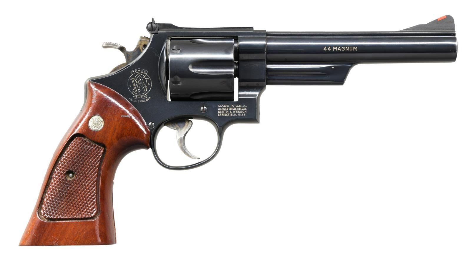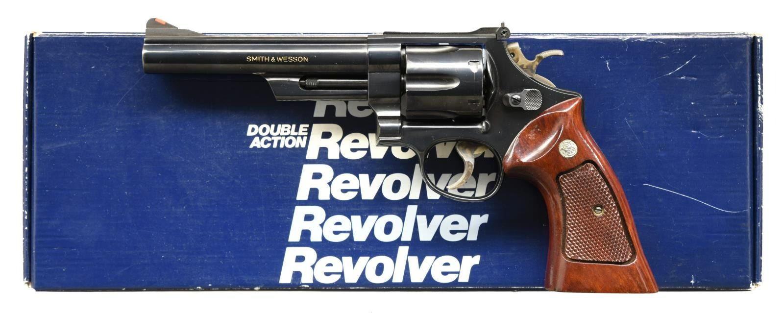 Cal.44 Mag. S# AET8413. Bbl. 6". Mfg. 1983. Double action revolver built on 3 screw, square butt, N frame. Blued finish. 6 shot, fluted cylinder. Red ramp insert front sight. White outline micrometer click adjustable rear sight. Shrouded extractor. 10 groove serrated backstrap & front strap. .500" checkered target hammer. Serrated trigger. Checkered Walnut grips w/ S&W medallions. UNATTACHED ACCESSORIES: Blue factory cardboard box #3395 w/ wax paper & literature. Extra set Pachmayr Presentation grips. CONDITION: Blued finish w/ gold infill on larger markings. Finish coverage complete & consistent w/ only faint thinning at muzzle. Grips illustrate no blemishing & retain dark, attractive finish. Timing appears spot on in all but 1 chamber, and only slightly off where normal operation would easily remedy it. Bright bore w/ strong rifling. (23-5020/JZ). MODERN. $800-1,200.