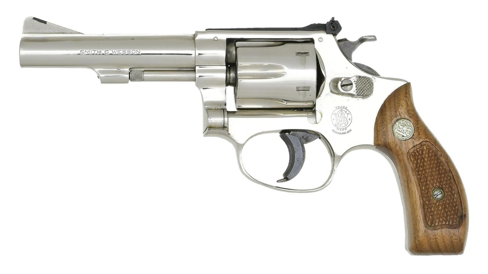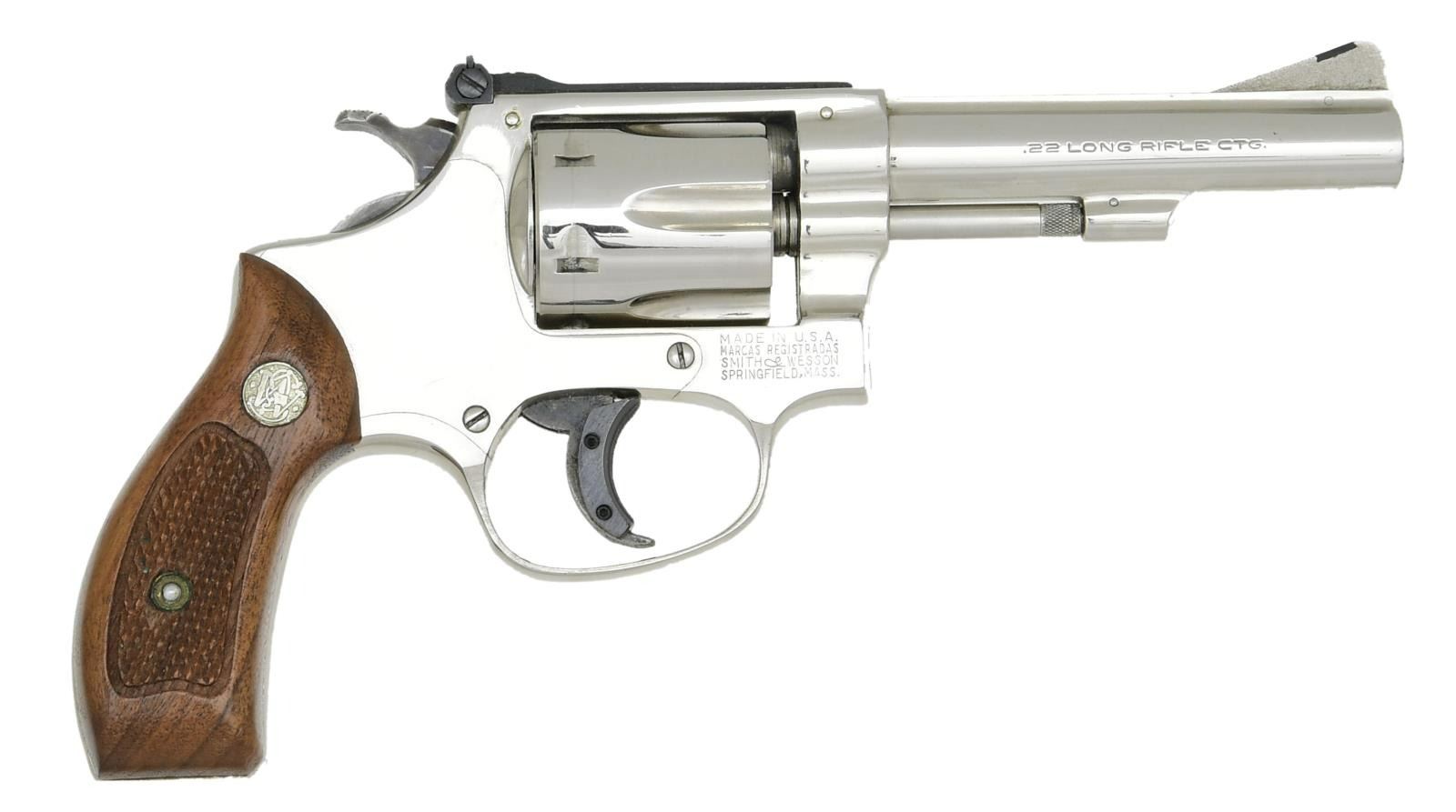 Cal. 22 LR. S# M49728. Bbl. 4". Serrated ramp front sight. Adjustable rear sight. Nickel finish. Case colored trigger & hammer. Trigger shoe present on trigger. Magna grips w/ silver S&W medallions. CONDITION: grips show some light handling wear. Trigger & hammer show some operational wear w/ light oxidation. Balance of metal shows some scratches & handling wear. Very good bore. PROVENANCE : From the Harold Prucha Collection. (23-860/MJC). MODERN. $500-750.