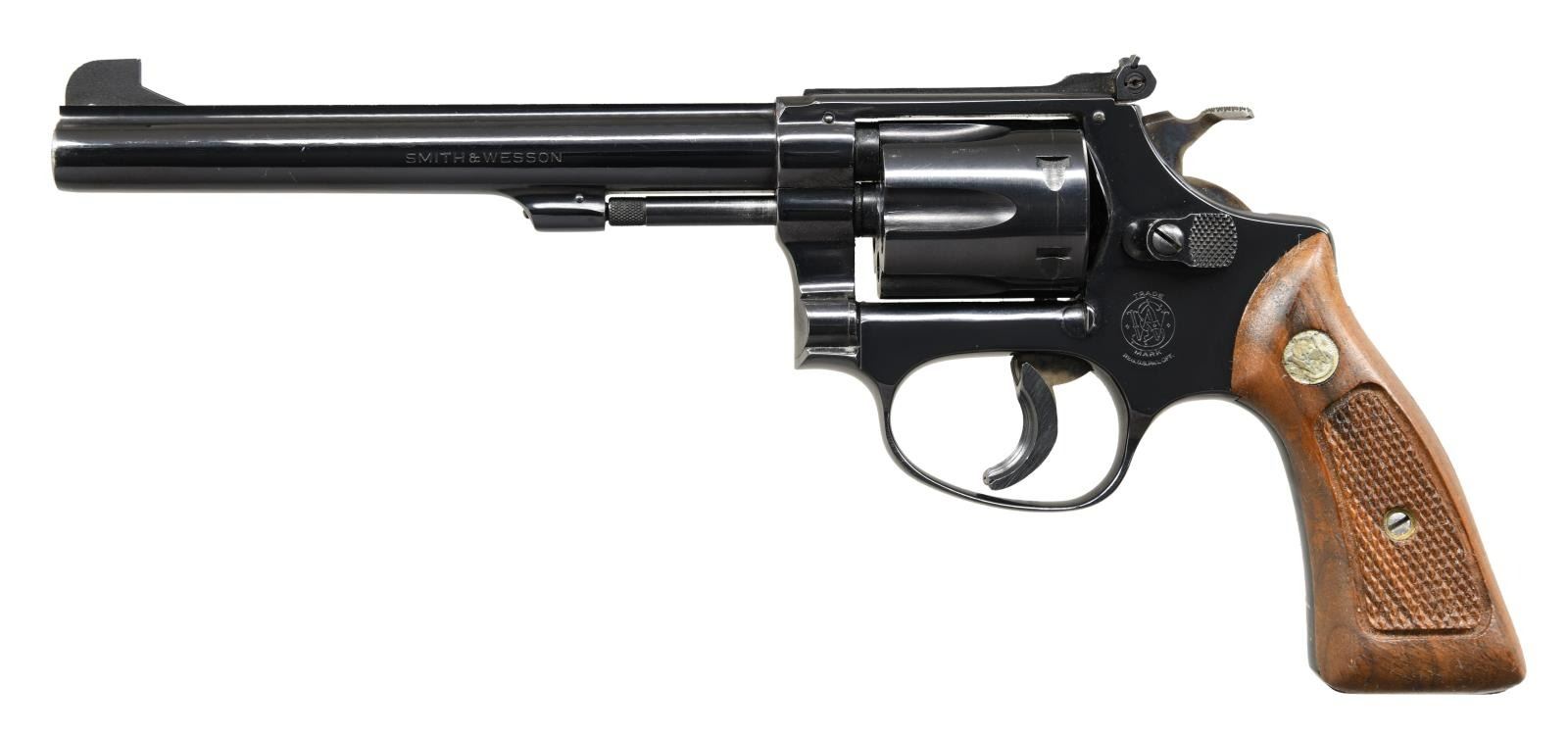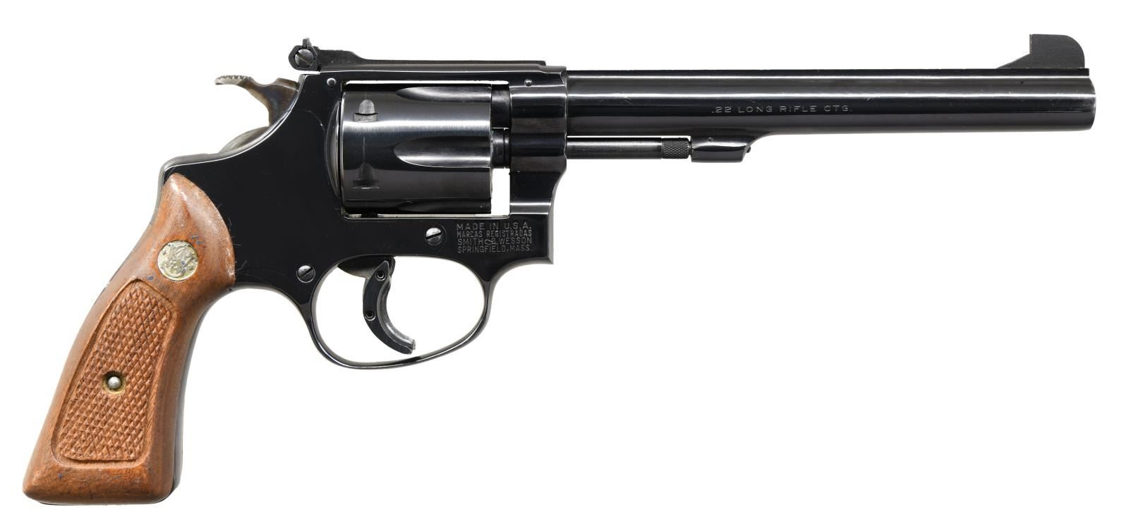 Cal. 22LR. S# M5636. Bbl 5 7/8". Model 35-1 manufactured by Smith & Wesson. Left side of barrel is stamped "SMITH & WESSON", with the right side exhibiting the caliber designation. Smith & Wesson trademark logo on left side of frame. Major metal components exhibit a blued finish, with the hammer and trigger exhibiting a case color hardened finish. Frame is mounted with 2 piece S&W silver medallion checkered wood grips. Fixed blade front sight with adjustable square notch rear sight. Left "ear" of rear sight is bent rearward. Trigger is mounted with an Ace trigger shoe. CONDITION: very good overall, with metal components retaining the vast majority of their original factory blue finish, exhibiting some light wear at the muzzle, as well as a few scattered superficial marks from handling and storage. Cylinder bears a light dragline. Brilliant mirror bore, exhibiting well defined rifling throughout. Grips show a couple marks from handling and storage, as well as some flaking to the varnish, but are otherwise very good overall. PROVENANCE: Marshall "Brook" Davis Collection. (23-1681/MLW). CURIO. $800-1,200.