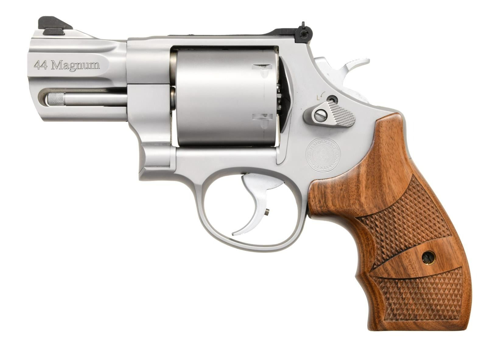 REVOLVER. Cal. 44 Mag. S# CXY0310. Bbl. 2 1/2". Ramped blade front sight w/ orange insert. Adjustable rear sight w/ white outline. Unfluted 6 shot cyl. Internal lock present behind cyl. latch. Stainless finish. Checkered finger groove walnut grips. CONDITION: all aspects rate very good plus or better w/ moderate drag line on cyl. & some light handling wear. PROVENANCE: The Collection of Gun Sport Ltd. owned by Jon R. Thomas. (23-4574/MJC). MODERN. $800-1,200.