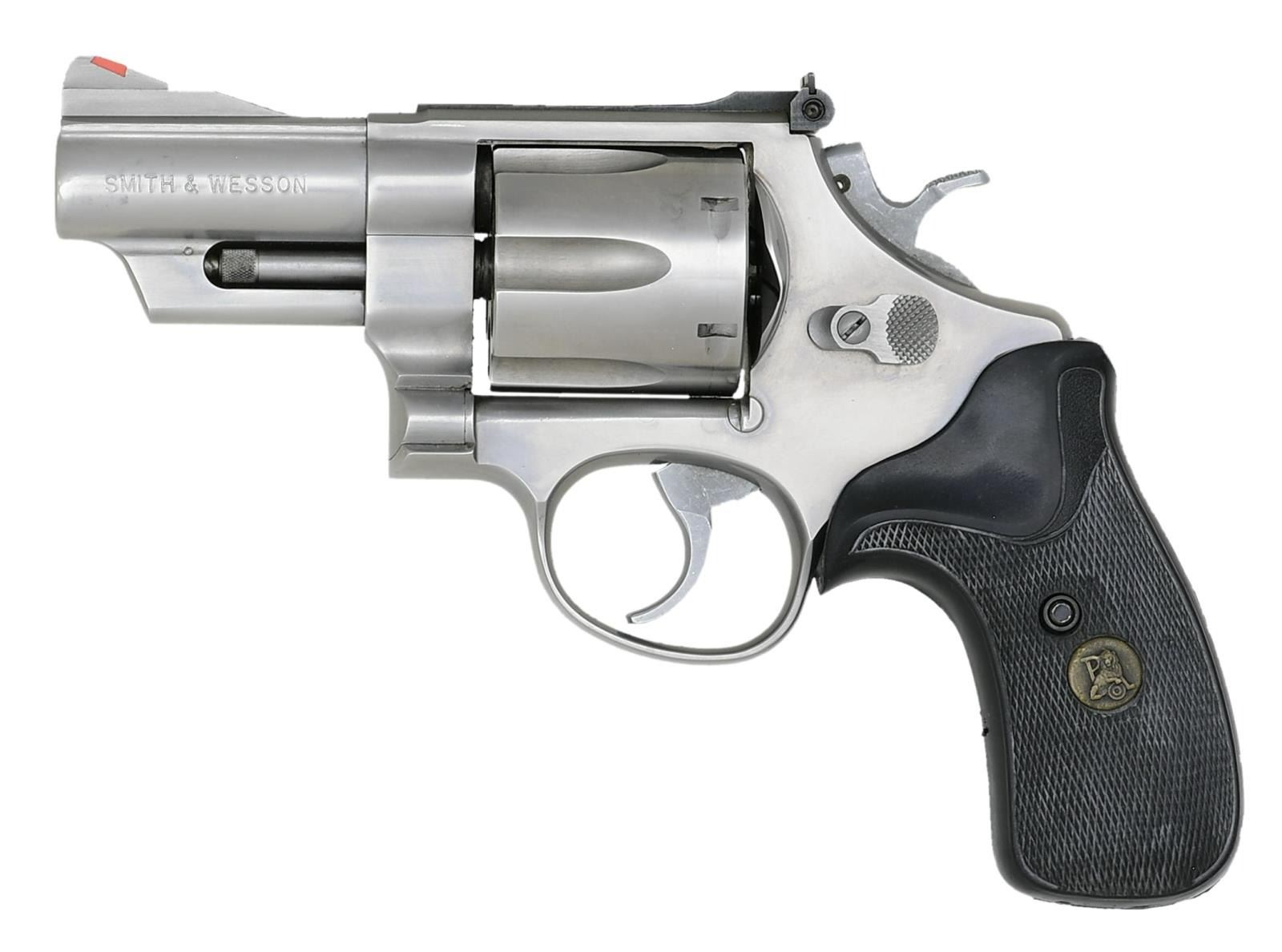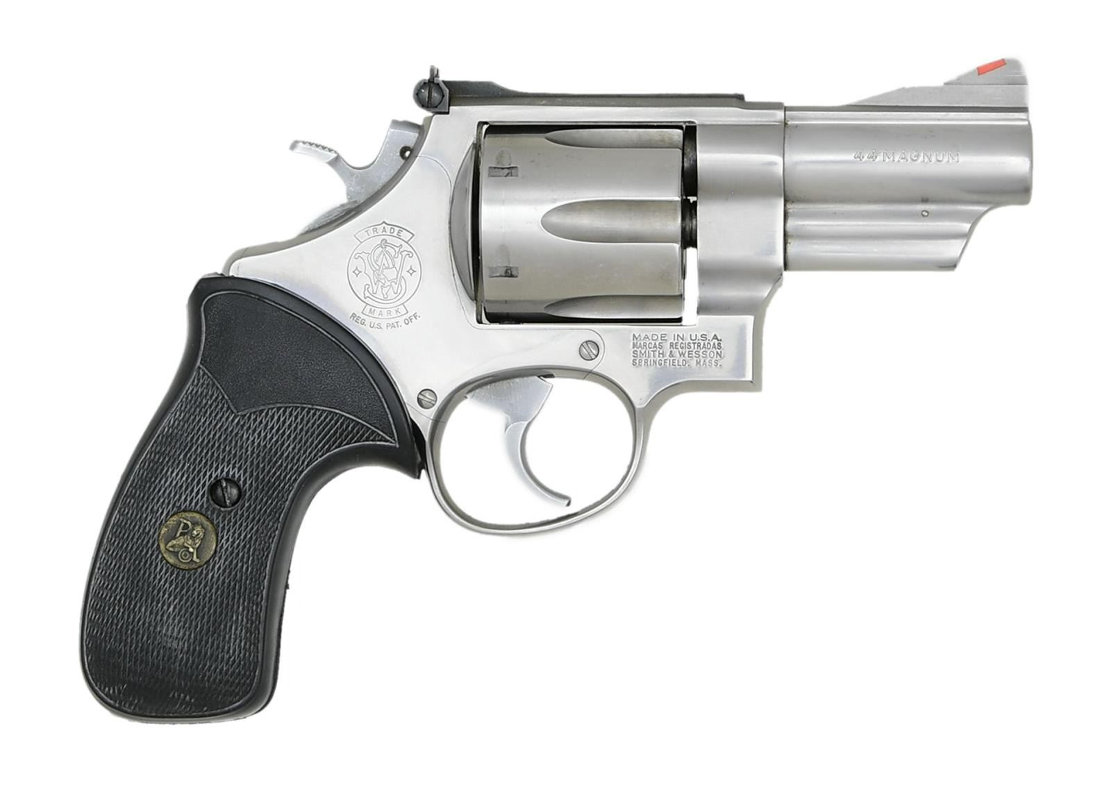 Cal. 44 Mag. S# BBE3985. Bbl. 3". Mfg. 1988-1989. Double action revolver built on the stainless steel square butt N frame. 6 shot fluted cylinder. 10 groove serrated backstrap & front strap. .400 checkered hammer Smooth trigger. Red ramp insert front sight. White outline micrometer click adjustable rear sight. Black rubber wrap around Pachmayr Presentation grips. CONDITION: Finish complete & consistent w/ very little staining. Timing correct in 5 of the 6 chambers w/ the 6th only slightly out of time, easily remedied w/ normal use. Bright bore w/ strong rifling. (23-4787/JZ). MODERN. $1,000-1,500.